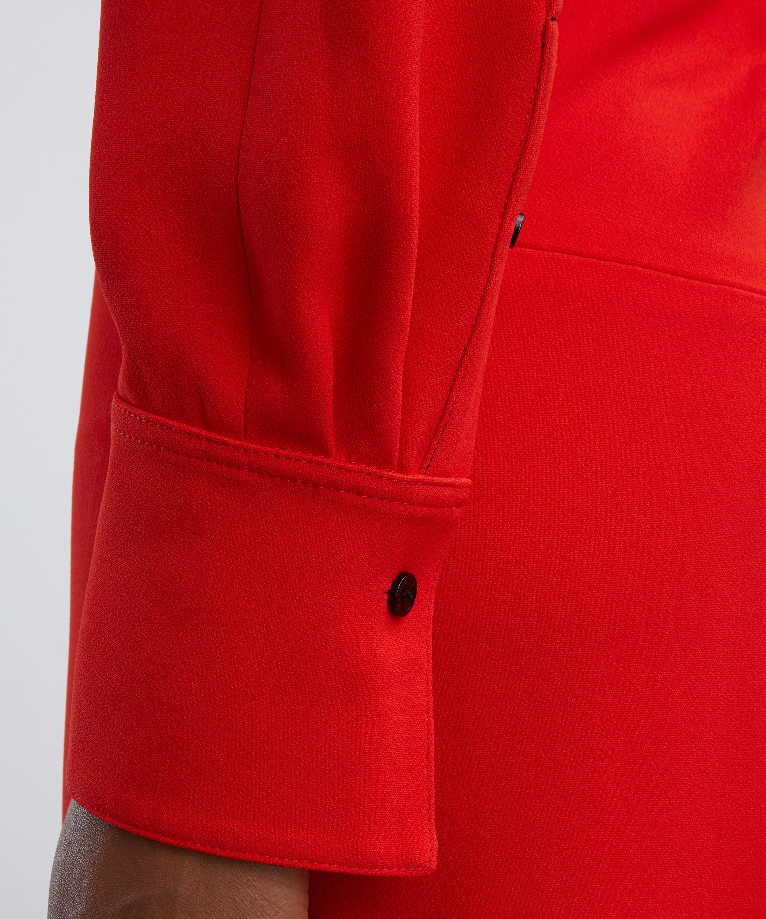 Blending masculine structure with feminine fluidity, the Long Sleeve Polo Collar Midi Dress features a crisp collar, relaxed raglan sleeves, and a flowing high-low hem. In vivid Tomato Red with contrast topstitching, it’s a bold yet effortless statement.