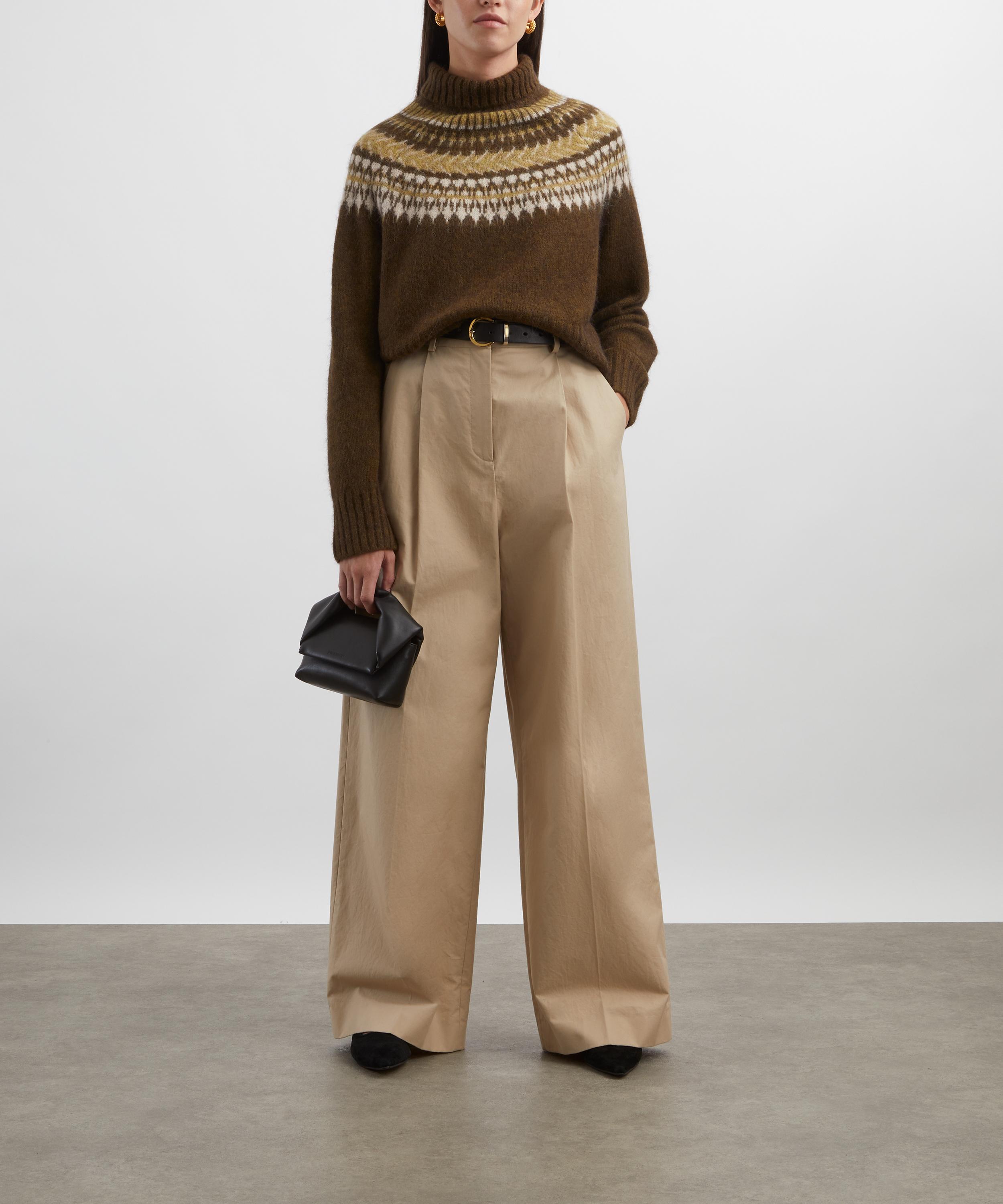 Made from a soft brushed alpaca blend, the Lorrie jumper features a warm oversized funnel neck, raglan sleeves, and a classic Fair Isle yoke - perfect for countryside walks or indoor relaxation.