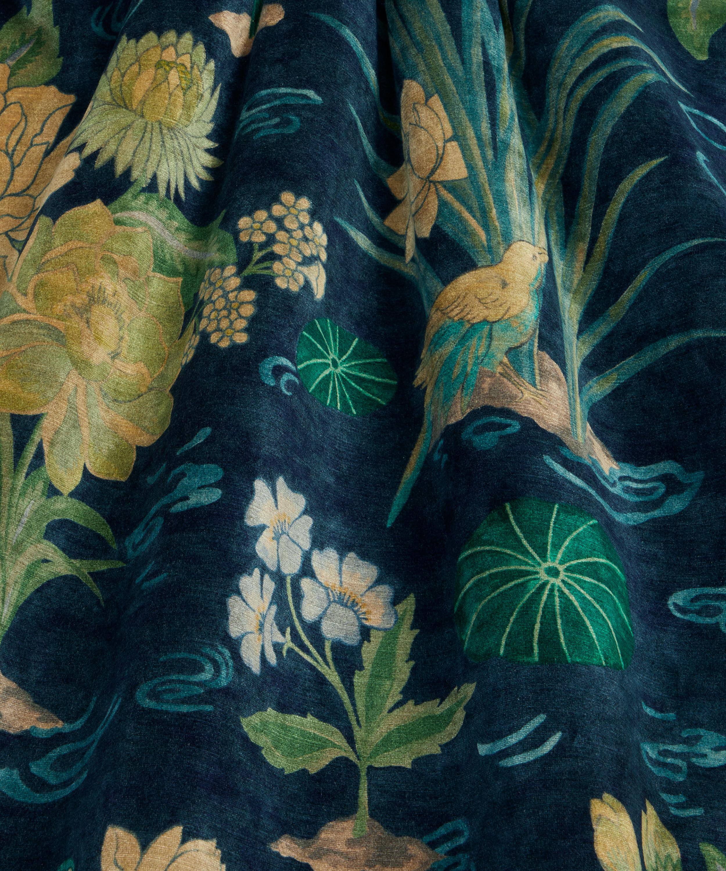 The Botanical Atlas fabric collection celebrates our historic lineage of craftsmanship and design through a cross-pollination of styles and visual narratives. Richly layered embroideries, opulent textured weaves, and contemporary printed velvets and linens are juxtaposed with a selection of elegant stripes and mesmerising geometrics - expertly crafted using traditional and cutting-edge techniques in Italy, Belgium, and India. Lotus Garden is inspired by an original artwork from Liberty’s extensive archive.