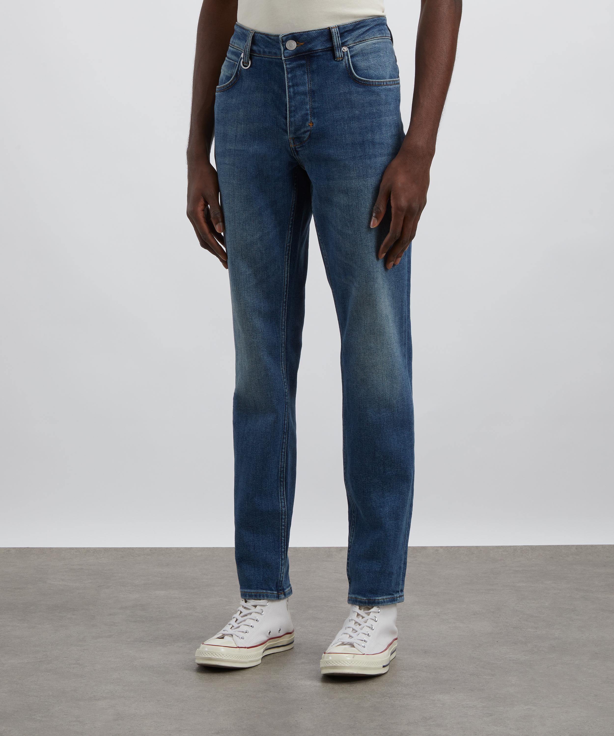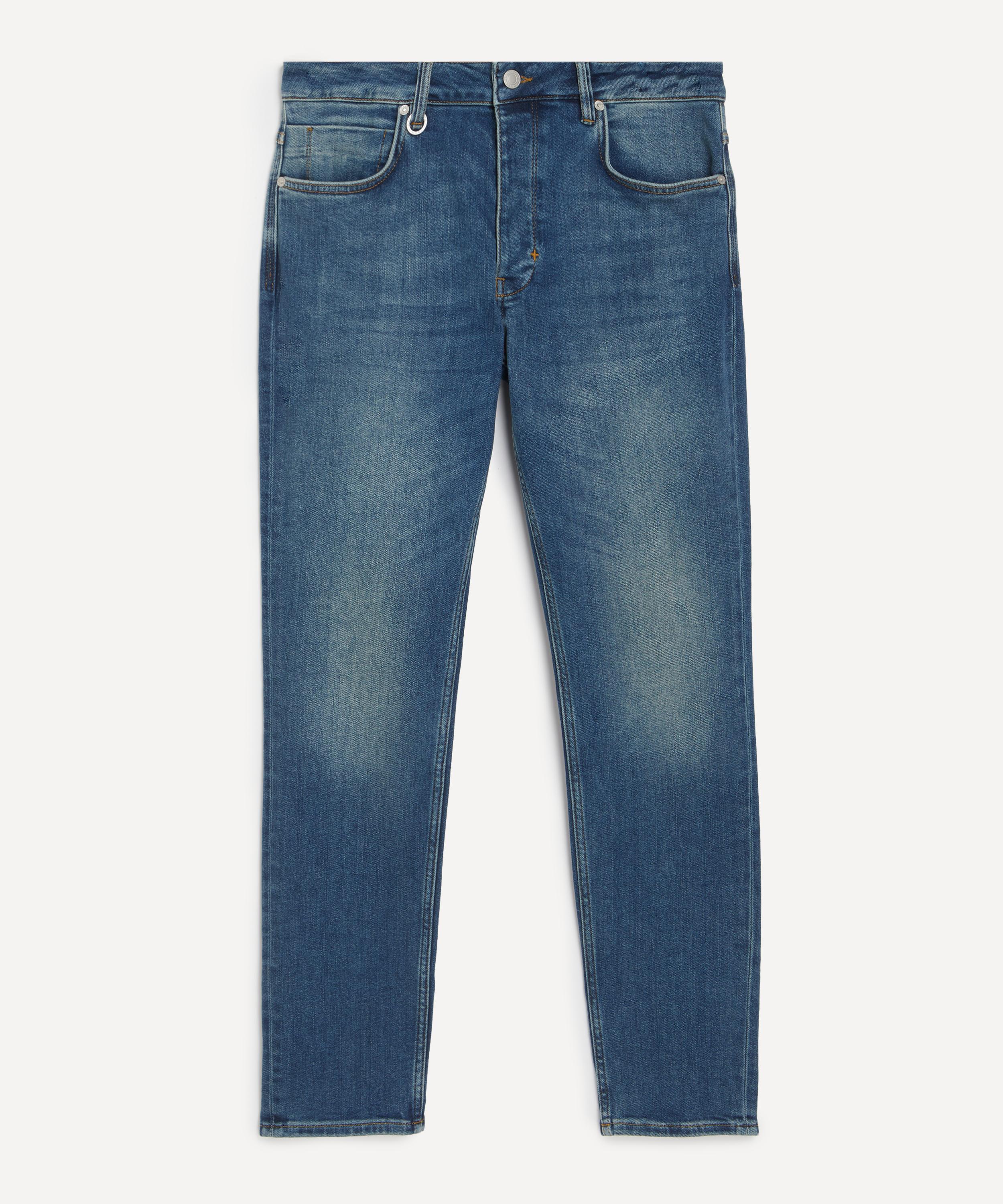 Crafted from ultra-soft stretch denim, these slim-fit jeans offer a regular rise and a classic straight leg. Finished with a signature fob ring, the rich indigo wash, complemented by light fading and whiskering, enhances their timeless appeal.