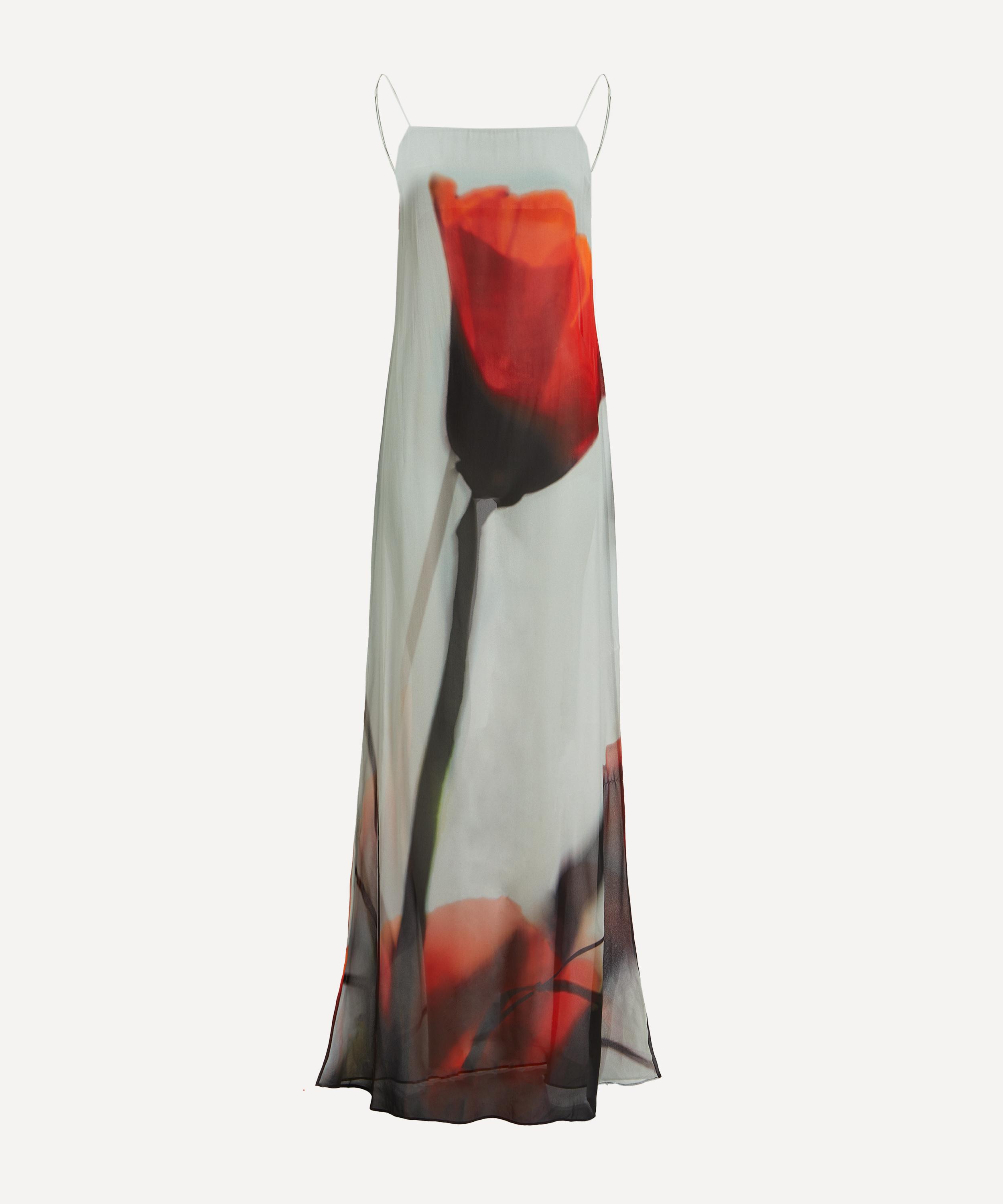 Crafted from semi-sheer viscose georgette and emblazoned with a striking orange tulip motif, this maxi dress exudes sophistication with its loose, A-line silhouette, delicate straps, and floor-sweeping hem.