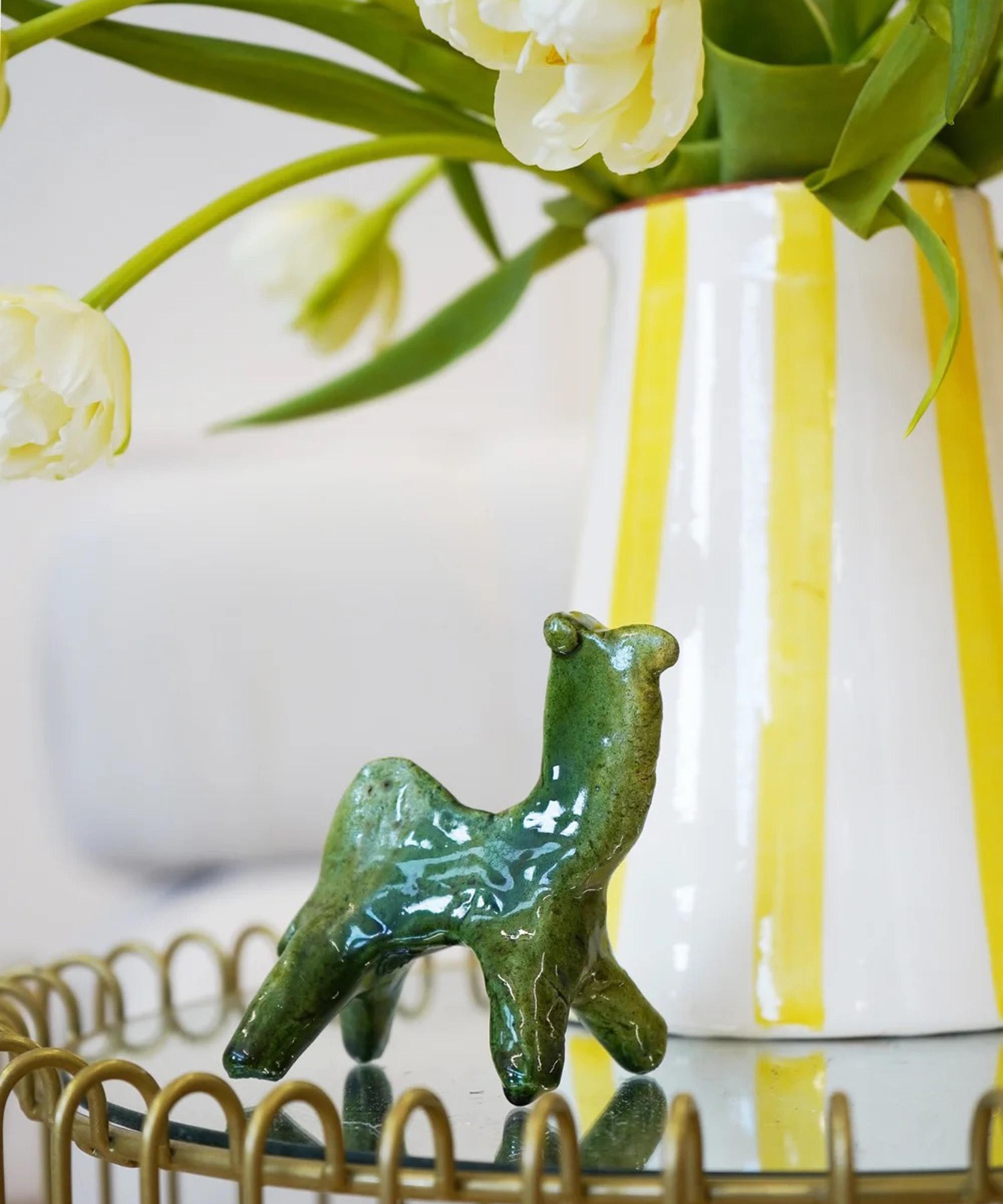 It’s handmade from clay in Tamegroute – a village in southern Morocco celebrated for its distinctive green pottery – and defined by a camel-shaped, rustic and one-of-a-kind silhouette that’s created through a centuries-old production process. The piece is then finished with a unique green glaze that amplifies the subtle imperfections and variations in texture. Place it on a cherished dresser, desktop or dining table to enhance your home with colour and creativity.