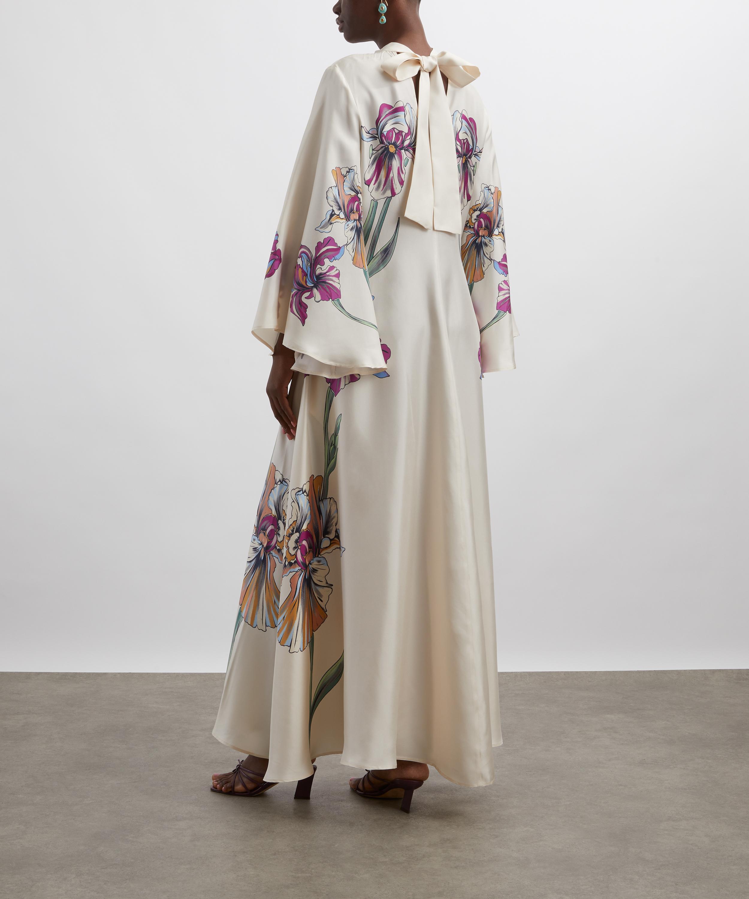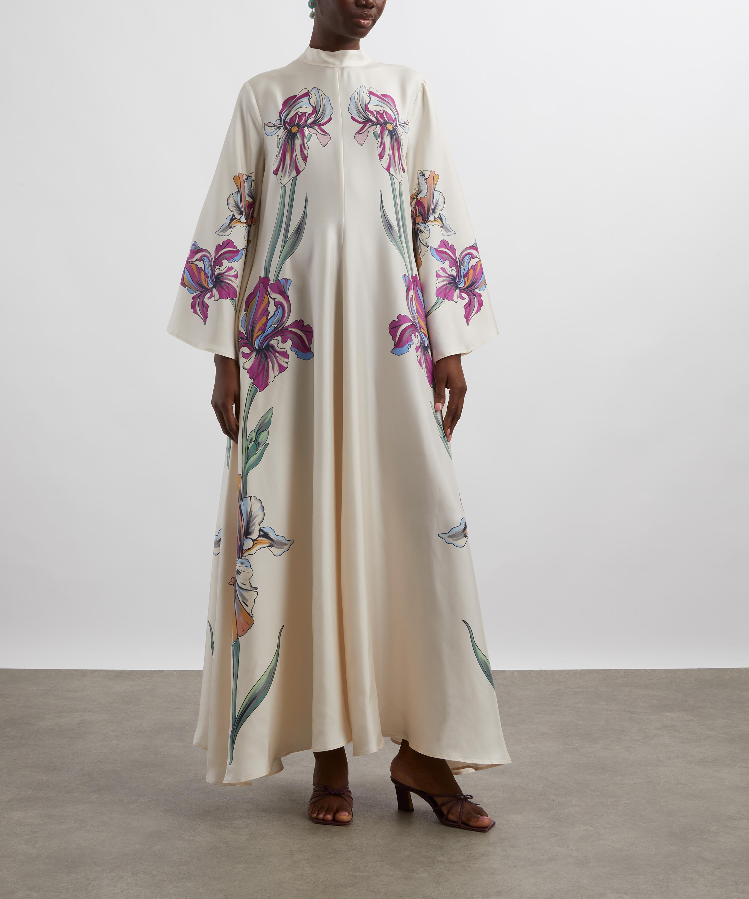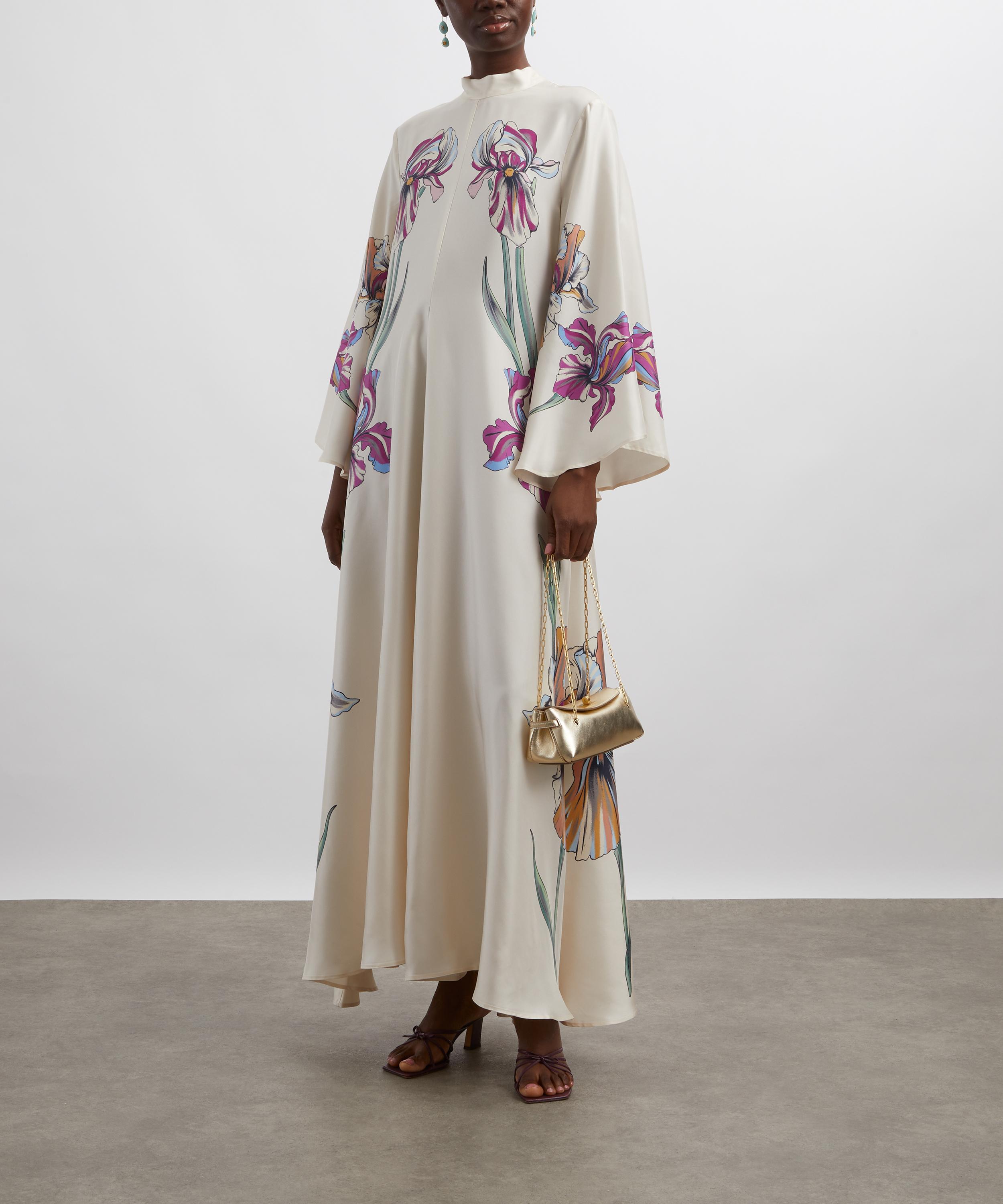 With a stand collar, draped waterfall sleeves, and a long sash at the back, this silk twill maxi dress is made for a decadent palazzo party. Adorned with the elegant Iris Placée Ivory print, it’s a striking statement piece that commands attention.