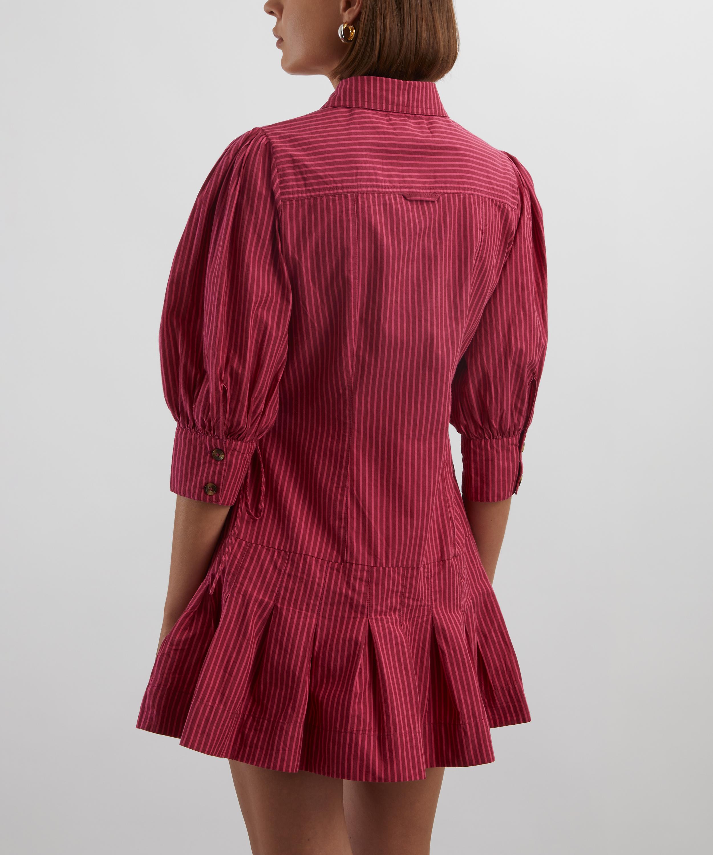 Crafted from cotton with delicate pink pinstripes, the Maisie Dress blends casual charm with effortless elegance. Combining masculine tailoring with feminine details, it features a classic collar, elbow-length puff sleeves, and a drop waist that flows into a short pleated skirt. Finished with waist ties for a whimsical touch, it's the perfect piece to take you from day to night.