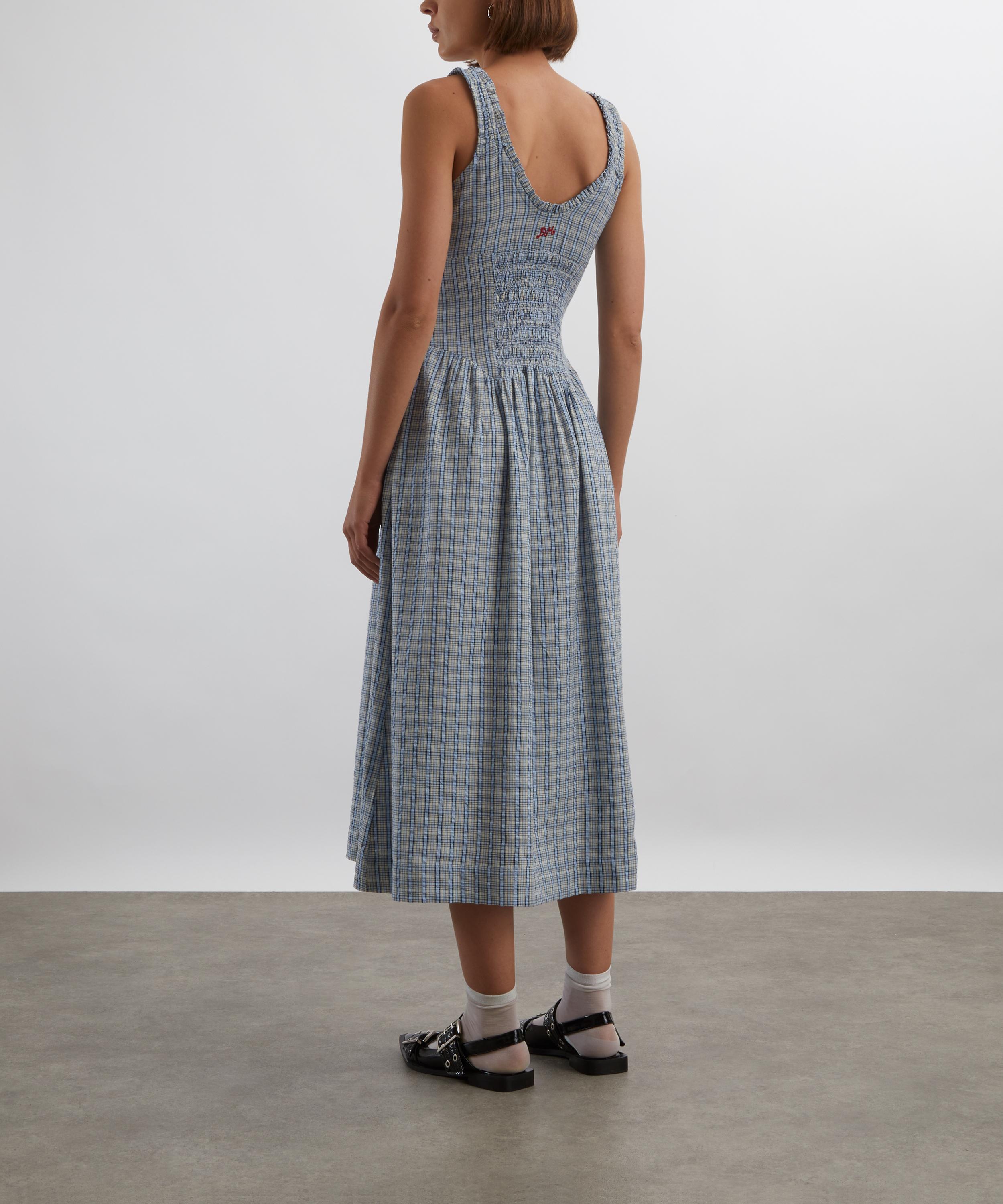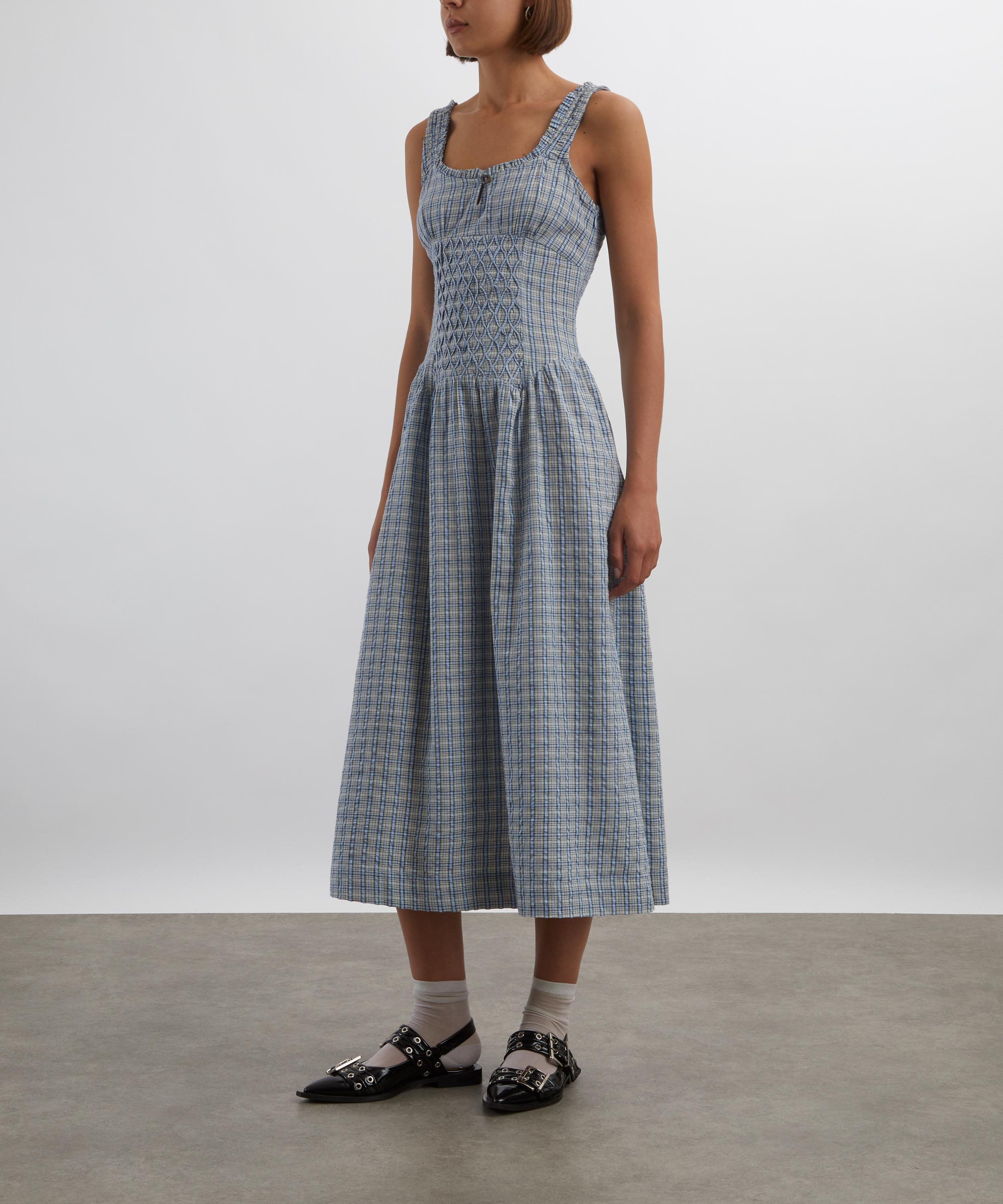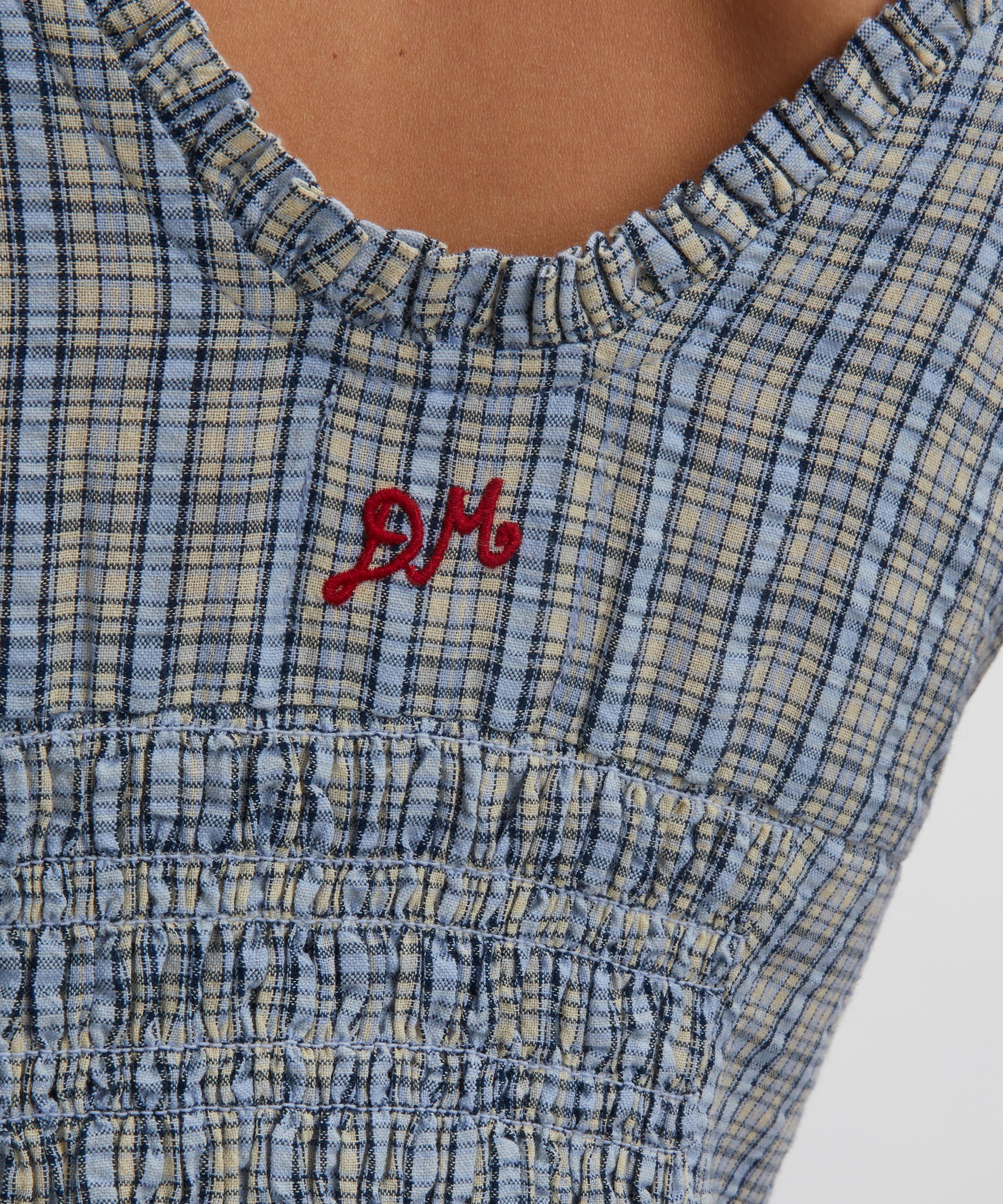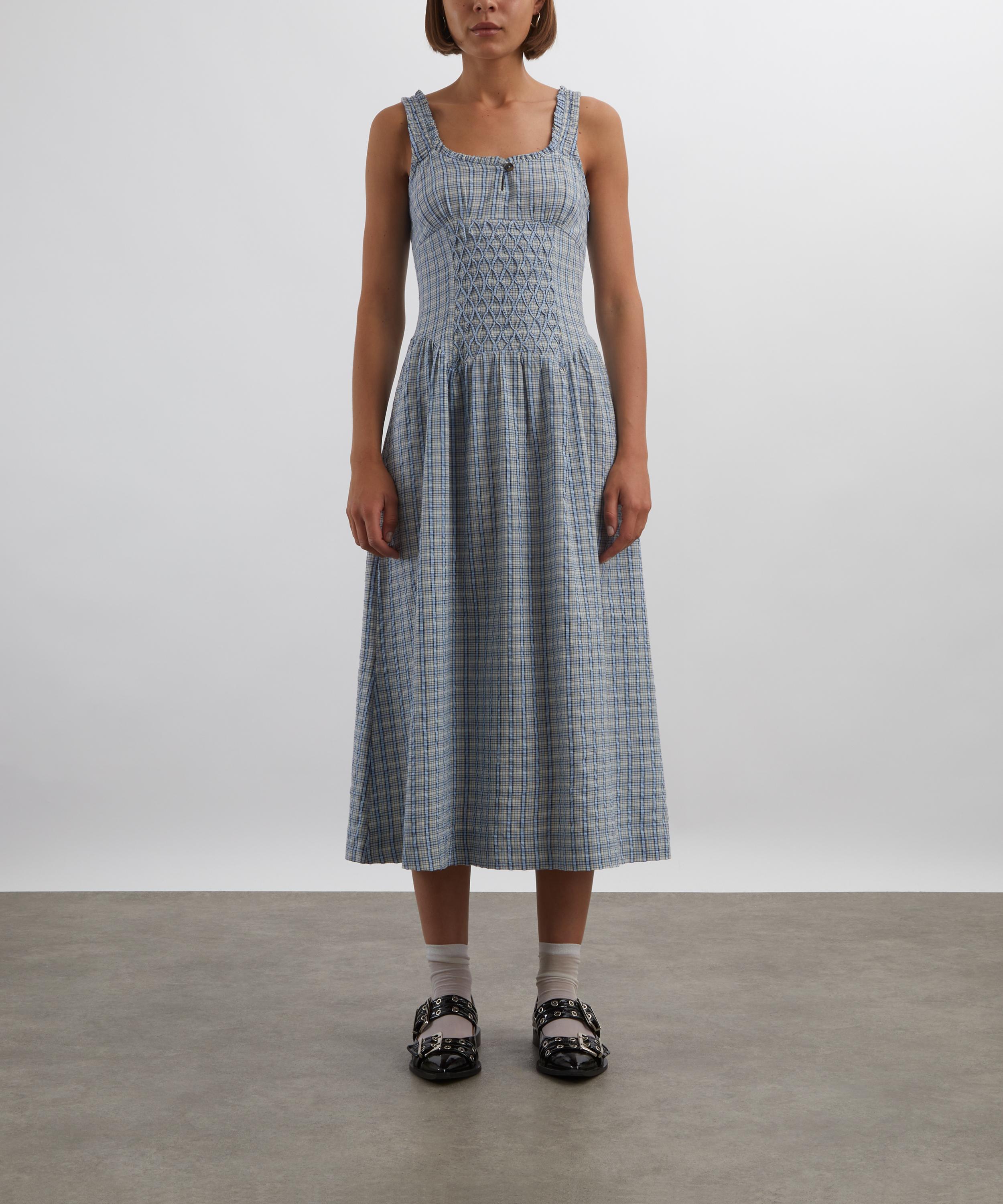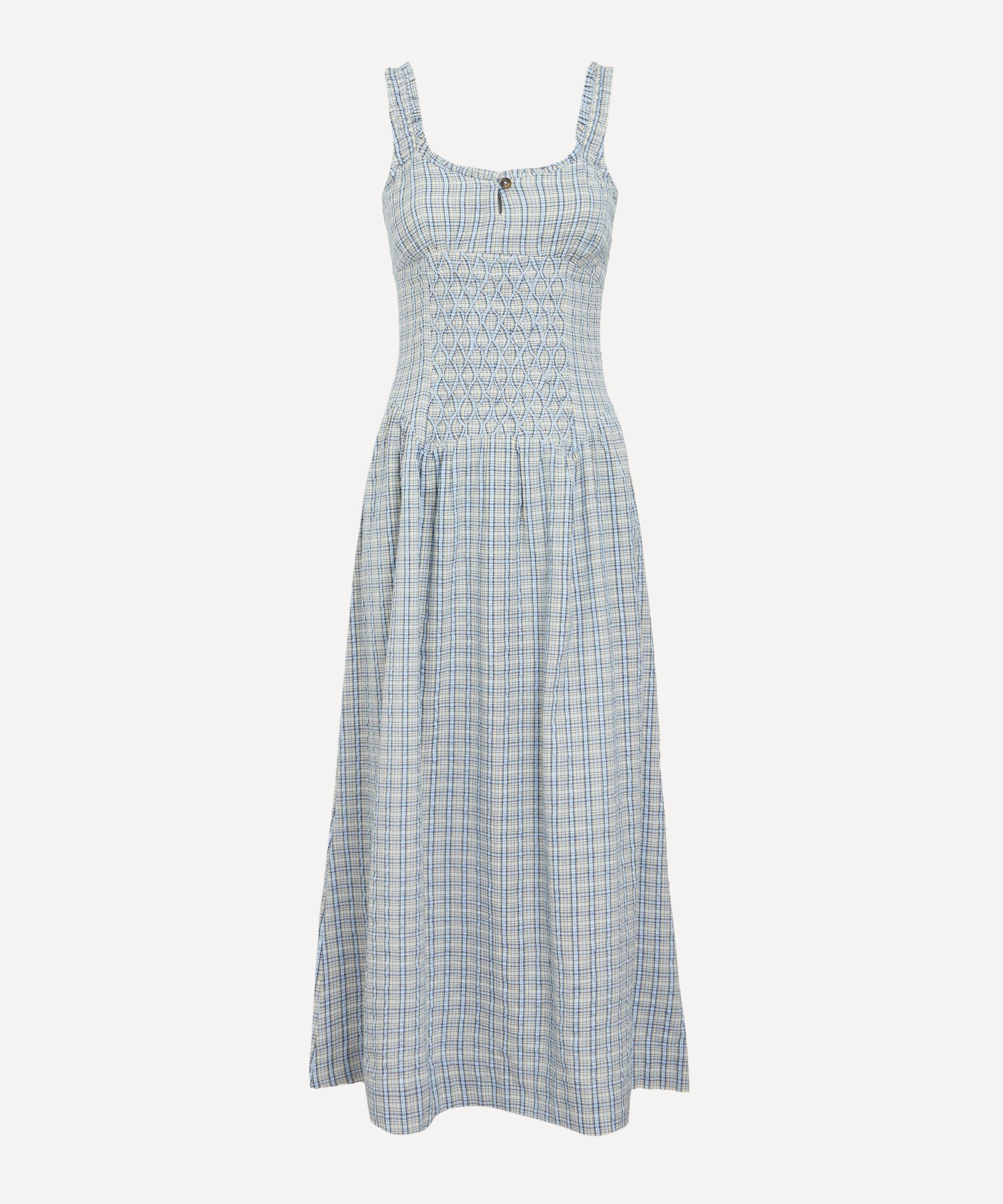 Crafted from cotton adorned with a light-blue check, the Mallory Dress blends casual charm with effortless elegance. Feminine and vintage-inspired, it features a hand-sewn smocked bodice, low back, and a flowy drop waist skirt.