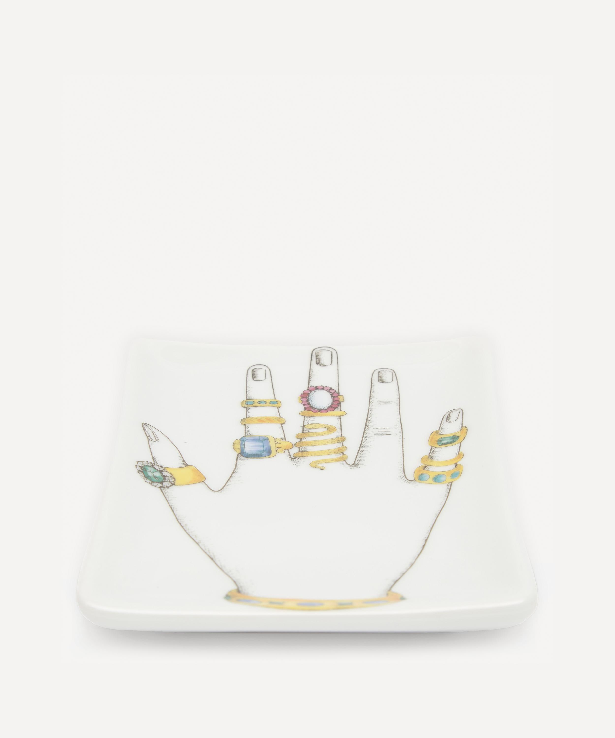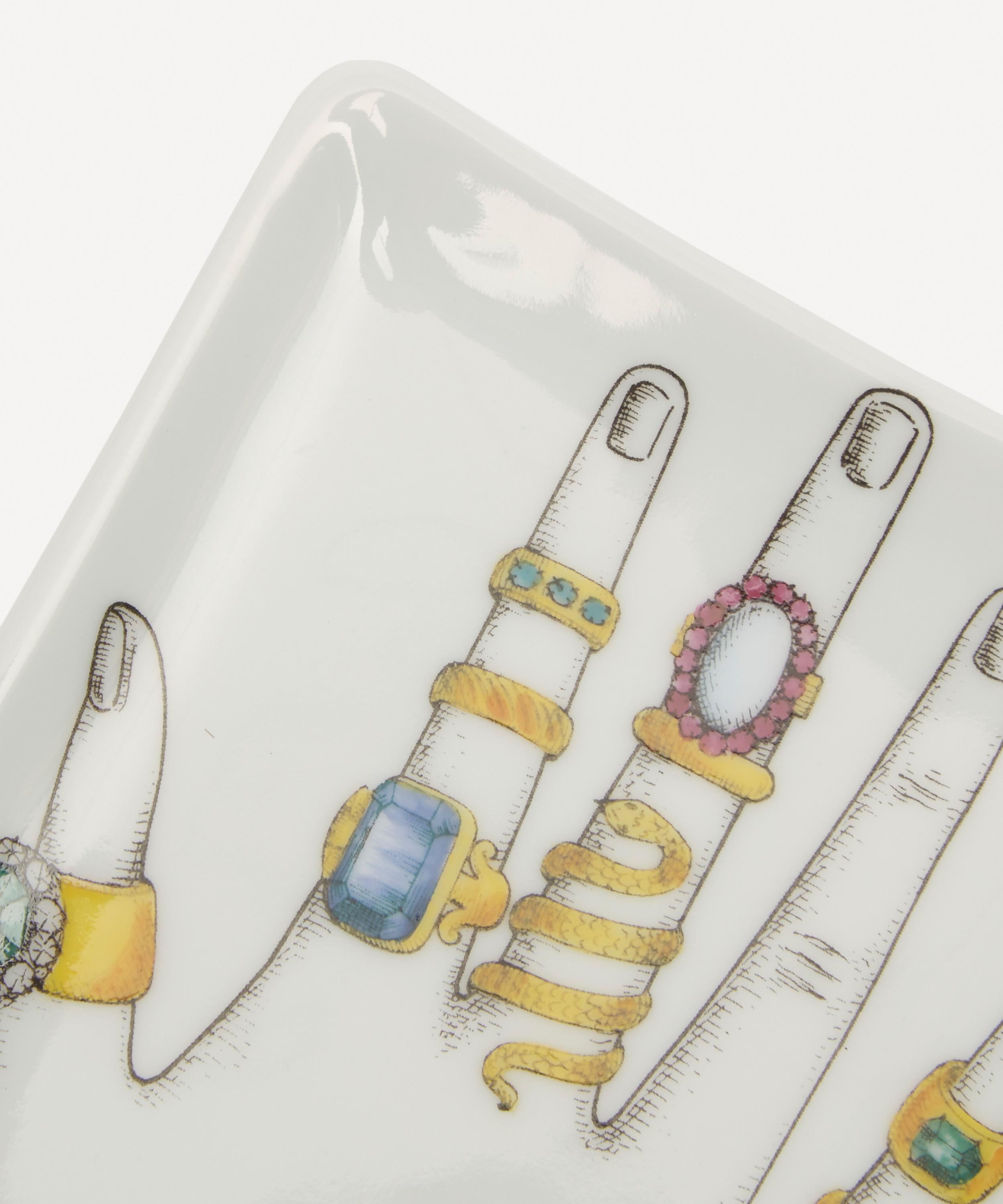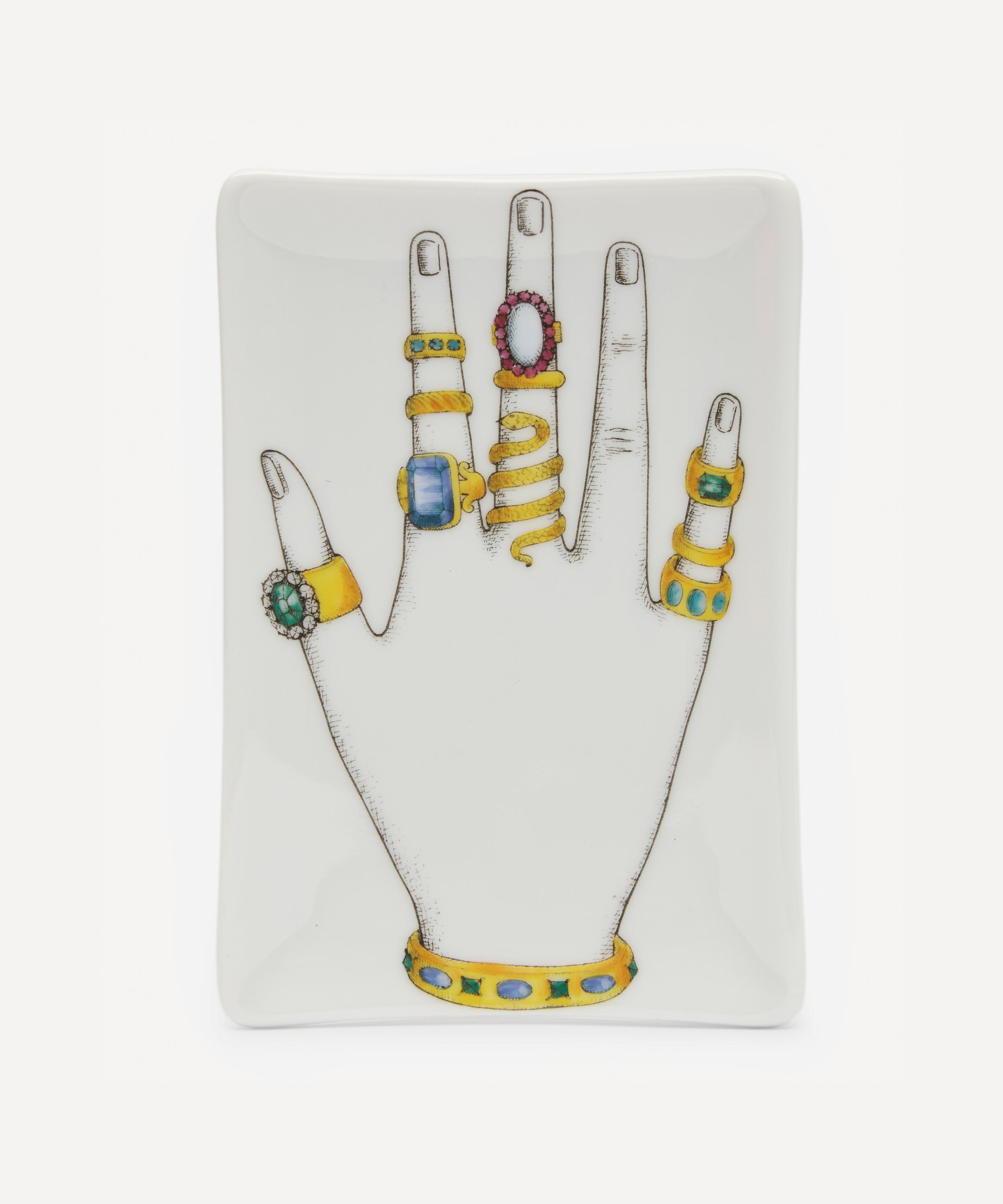 Fornasetti’s Mano con Anelli decorative tray features a colourful hand design with rings against a plain background – a striking housewarming gift or home accessory.