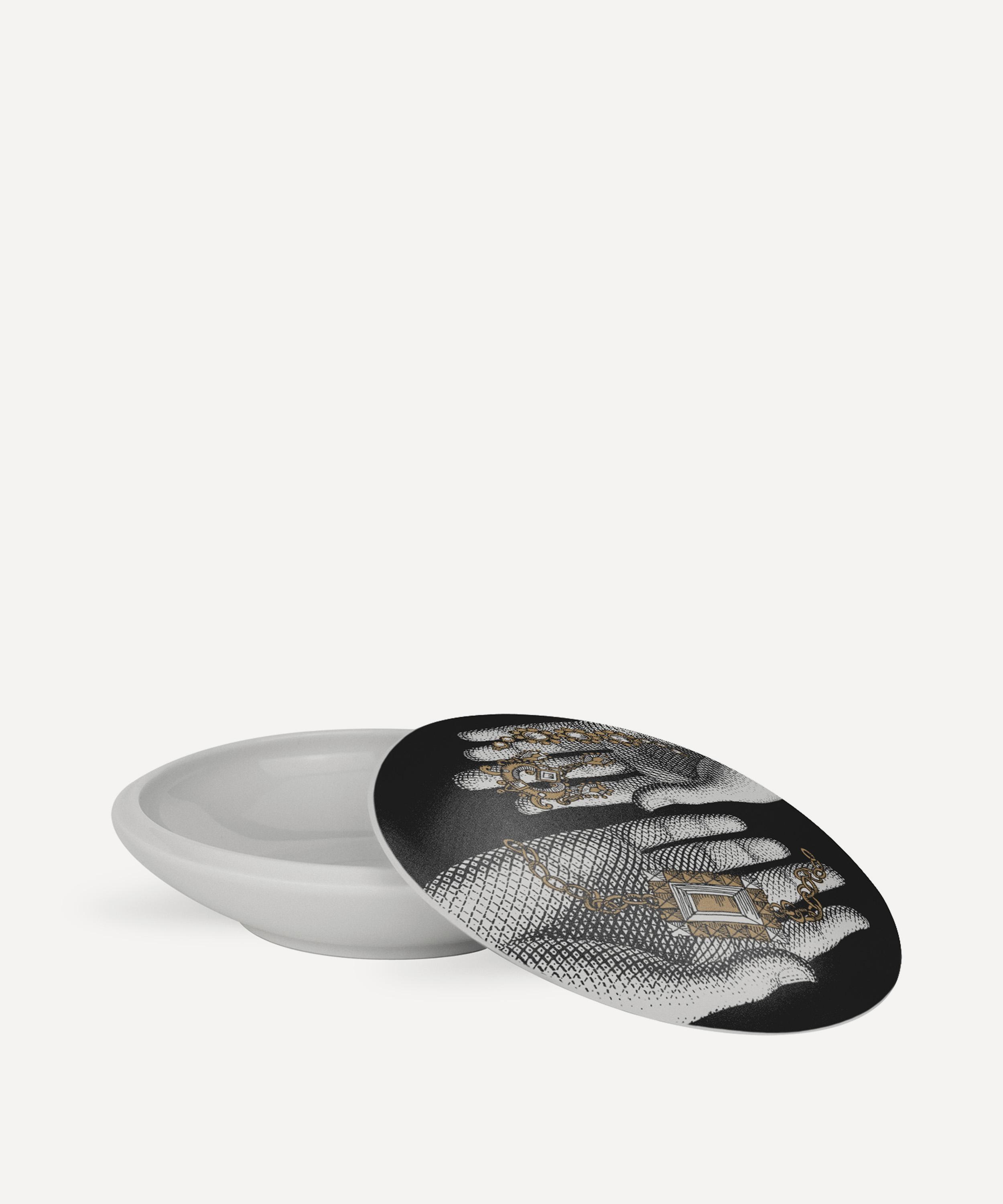 Breathing wit, imagination and ever-present eclectic style into its charming collections, Fornasetti welcomes this Mano Con Gioielli round trinket box.