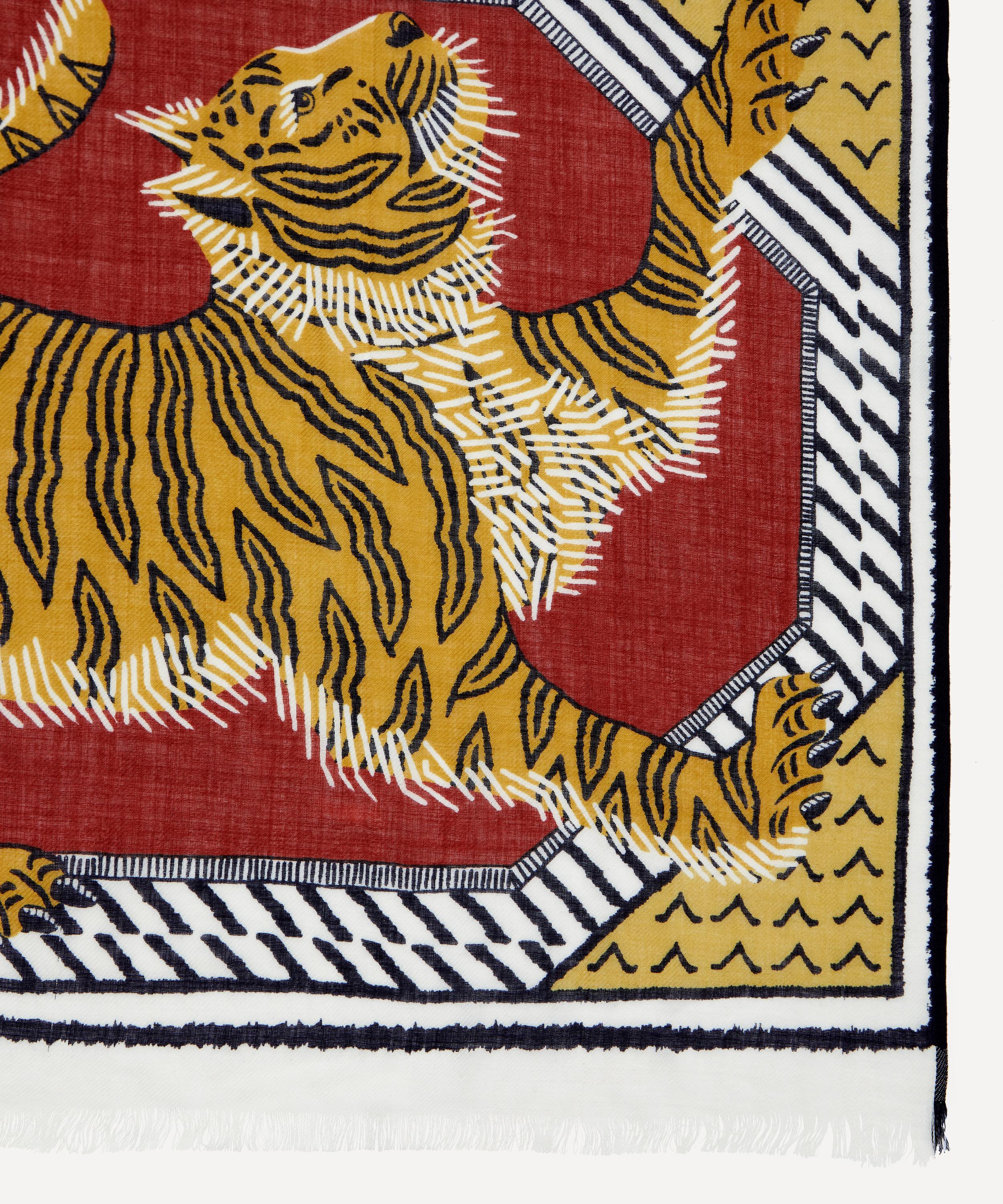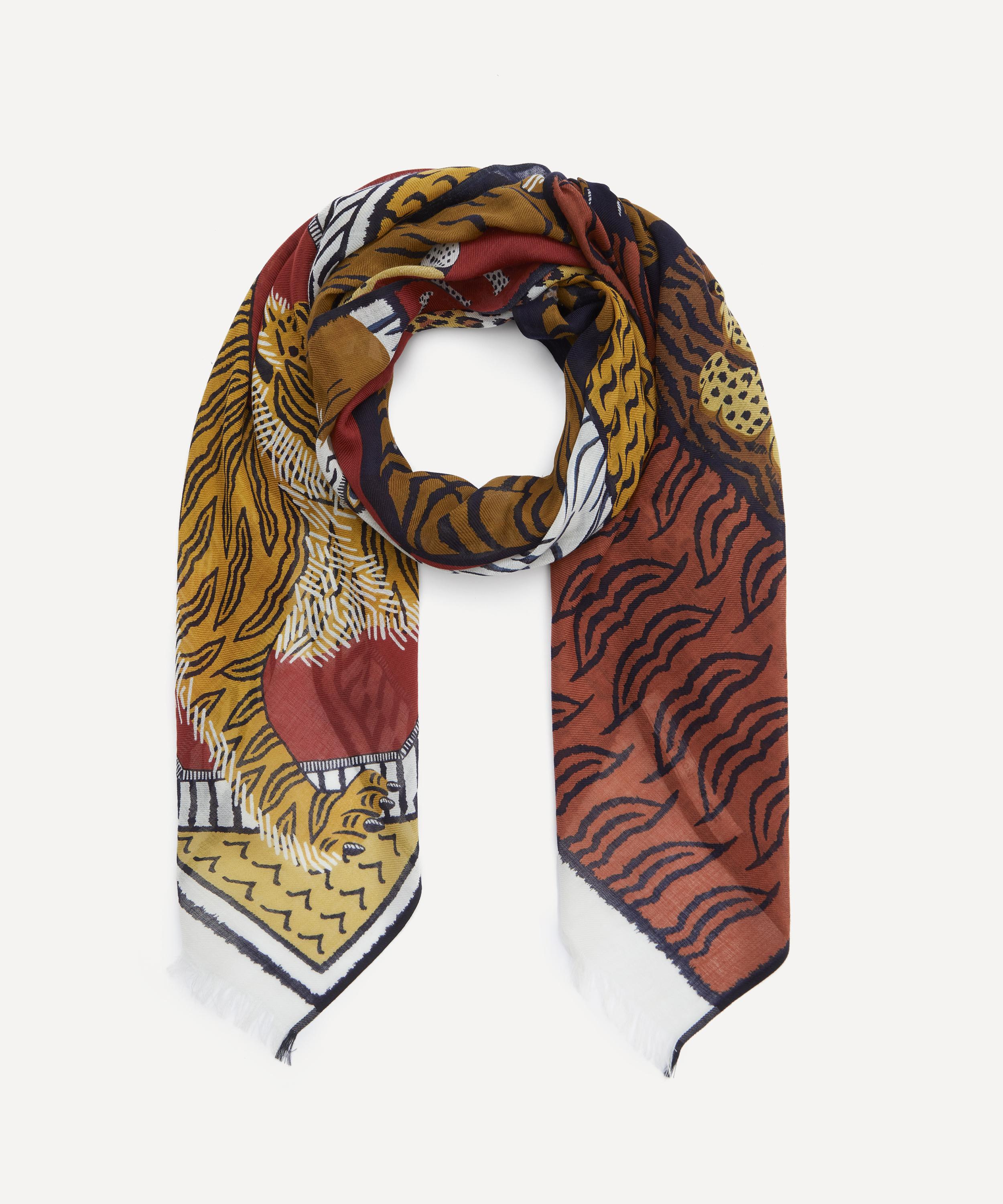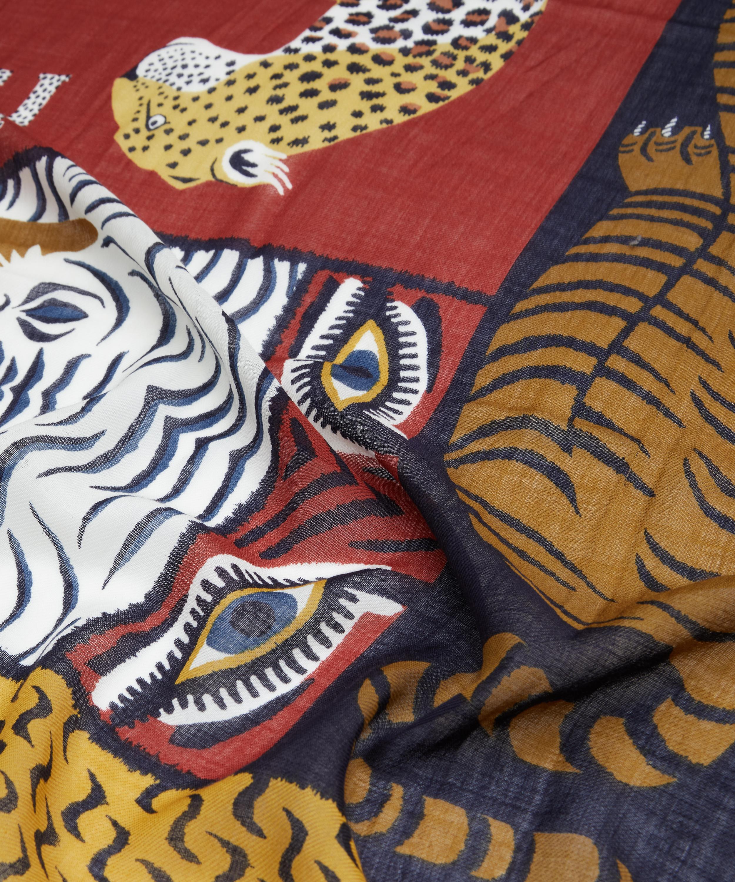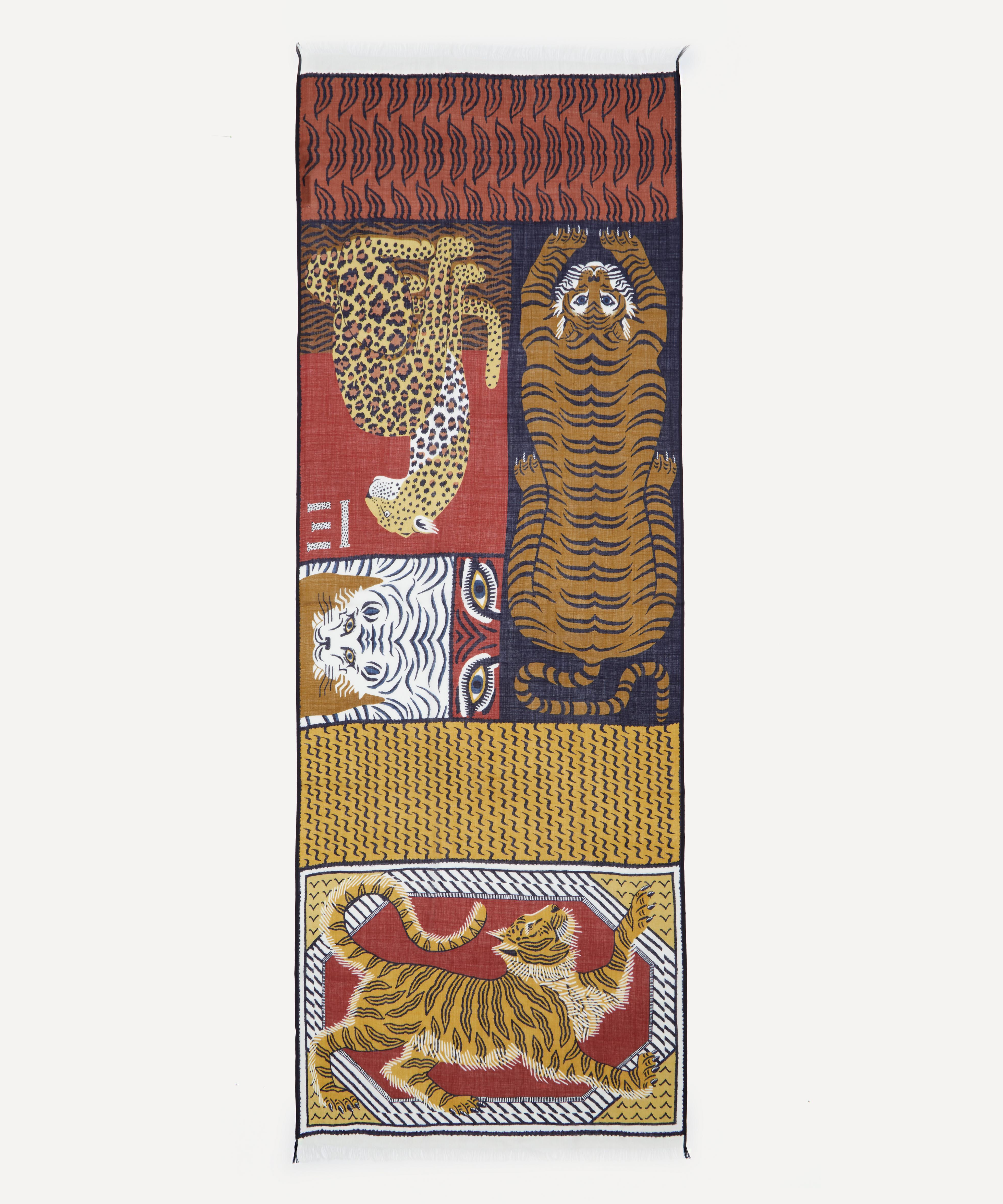 Designed in France and made in India, this Mantra wool scarf from Inoui Editions depicts a bold leopard and tiger motif against an abstract, multi-coloured backdrop. Finished with lightly frayed ends, it is perfect for breathing new life into your everyday wardrobe - knot it over neutral separates or drape it around bare shoulders to fully showcase the vibrant design.
