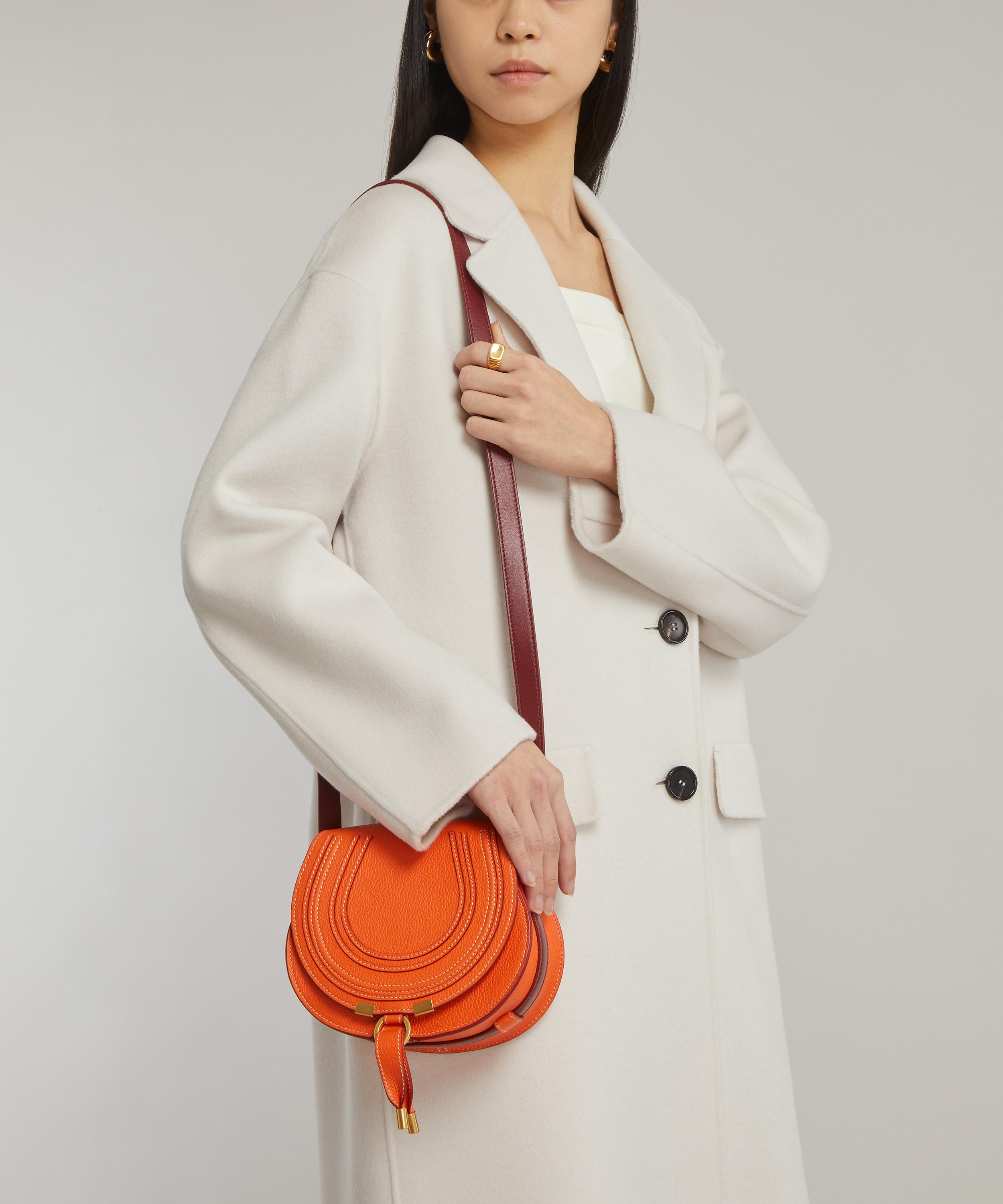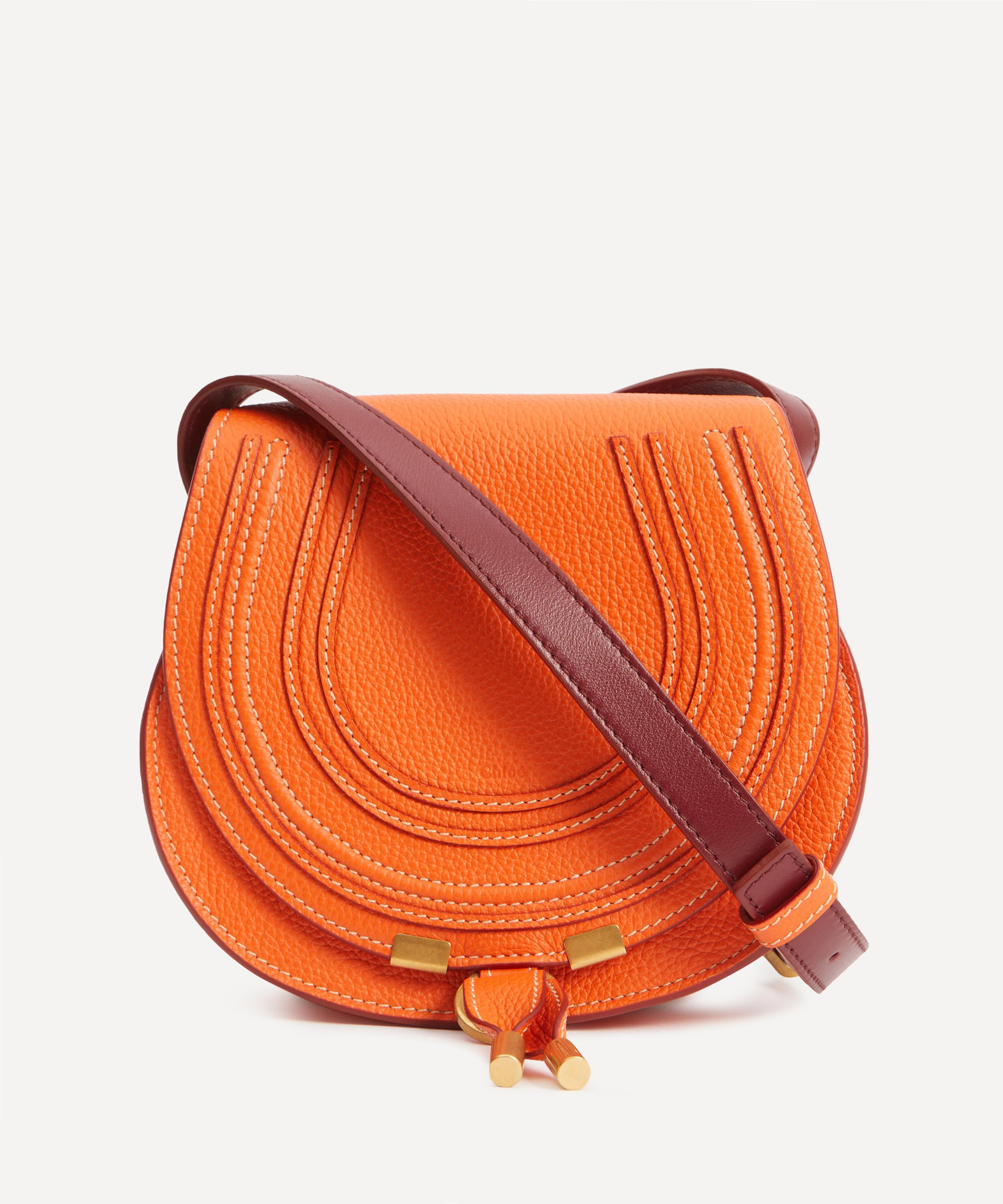 Updated in eye-popping, poppy-orange grained calfskin leather, the classic mini Marcie saddle bag is by iconic Parisian fashion house Chloé.