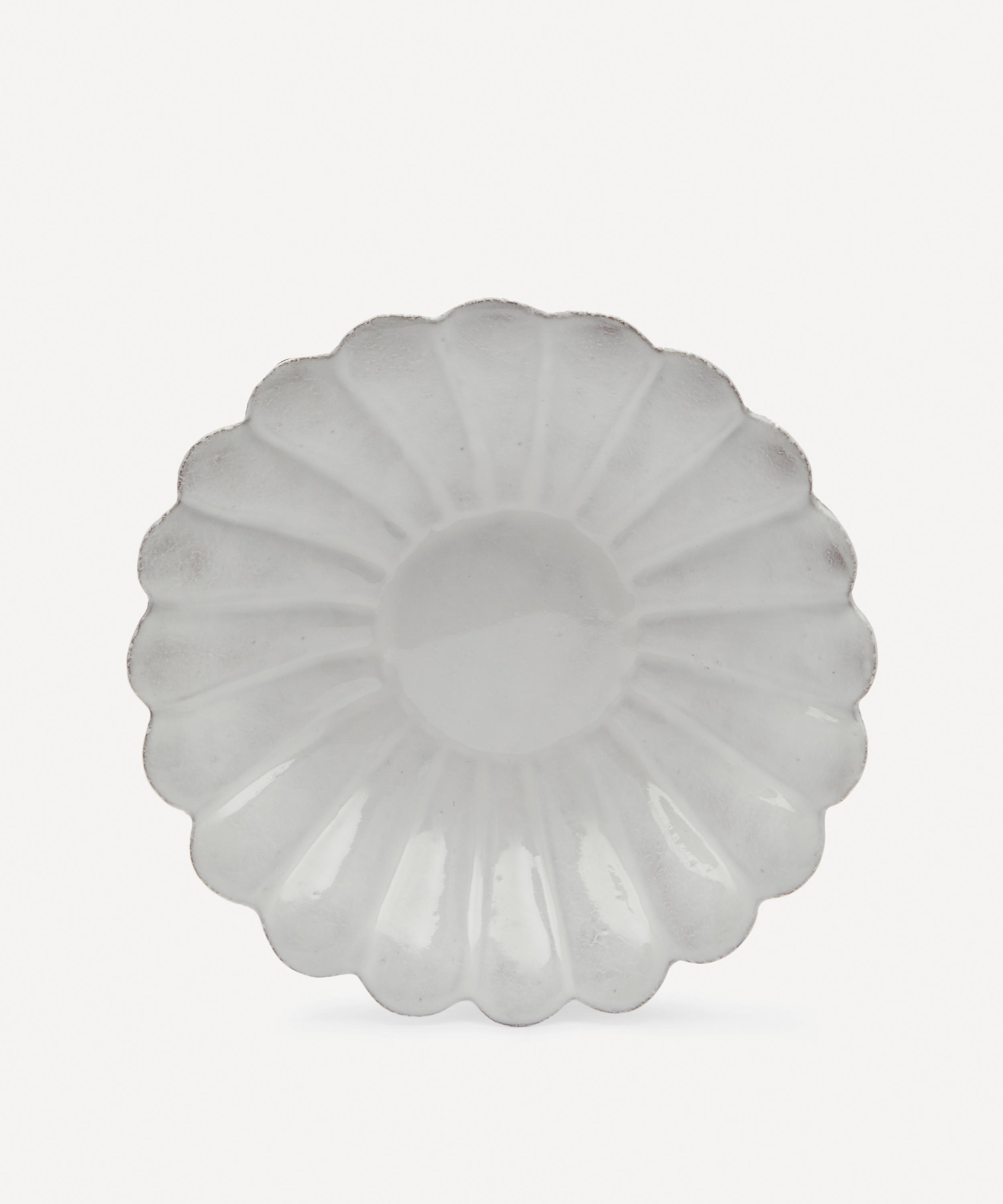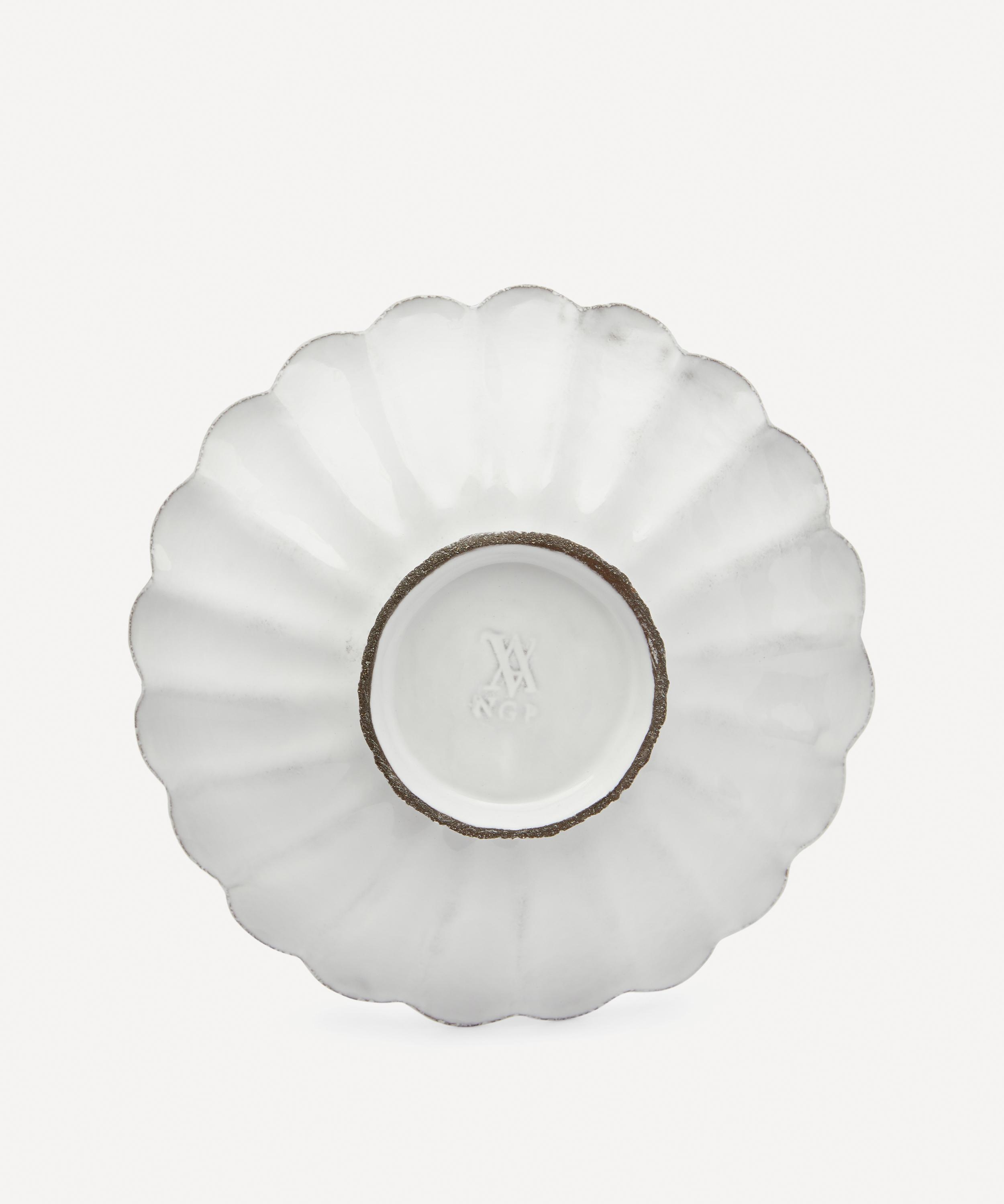 Votary of pre-industrial fabrication, Astier de Villatte is celebrated for being the one and only studio in Paris to hold and harbour the traditions of artisanal ceramic production. Restoring the ancestral systems of moulding and stamping, the Marguerite fruit bowl is made using handcrafting techniques from the Middle Ages which involve moulding a handmade sheet of clay, double firing the ‘biscuit’ piece and glazing the product in white enamel – a lengthy process that involves a drying time of up to one month. Characterised by a pillar base and scalloped edge design, it is engraved with the brand’s signature crest - depicting an interlacing A & V - alongside the initials of one of the 40 master artisans who created it. Each handmade piece tells a beautiful story, it romances and imparts a sense of nostalgia into its owner. Arrange with other serveware in the collection to breathe an air of authenticity into your table setting.