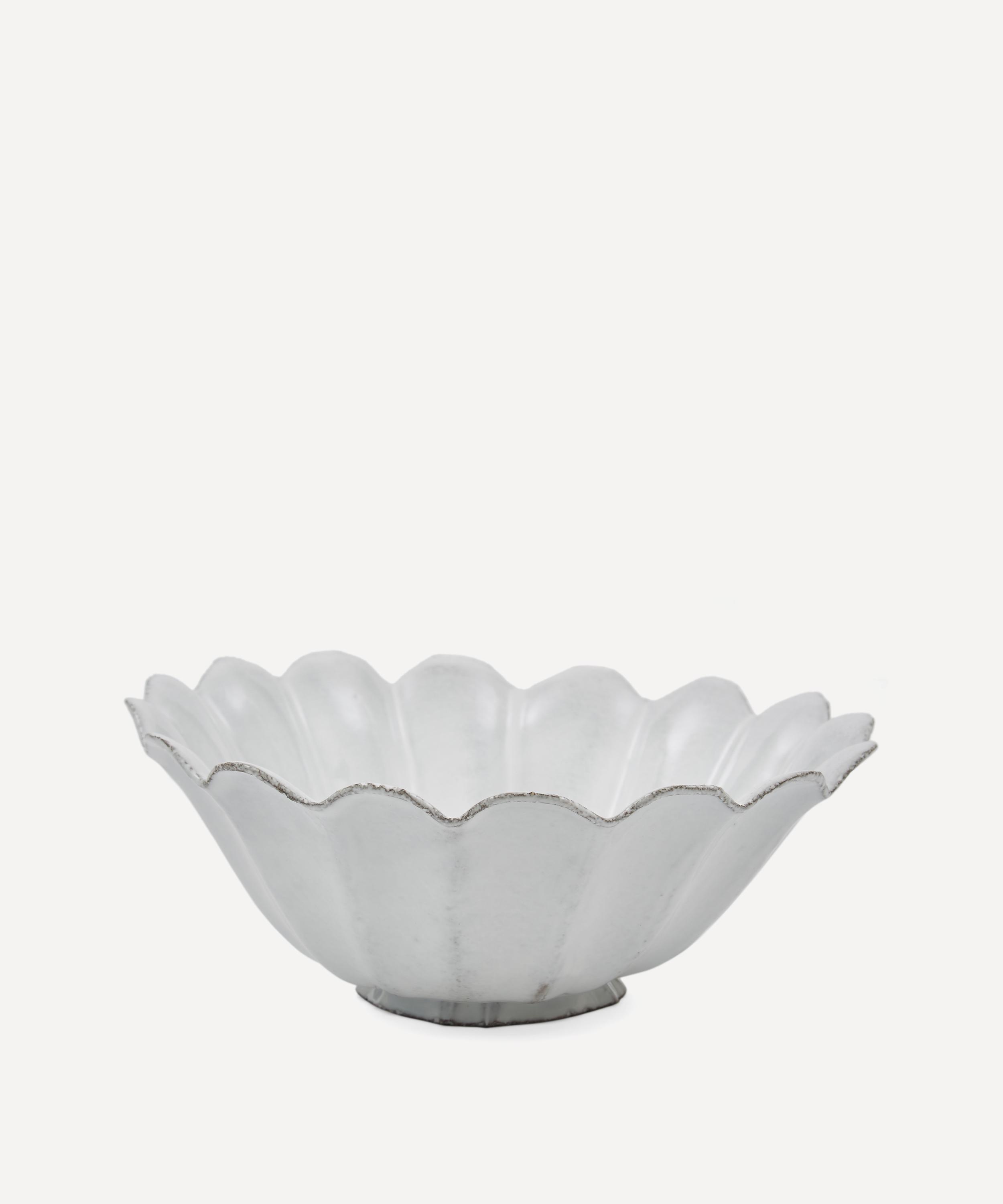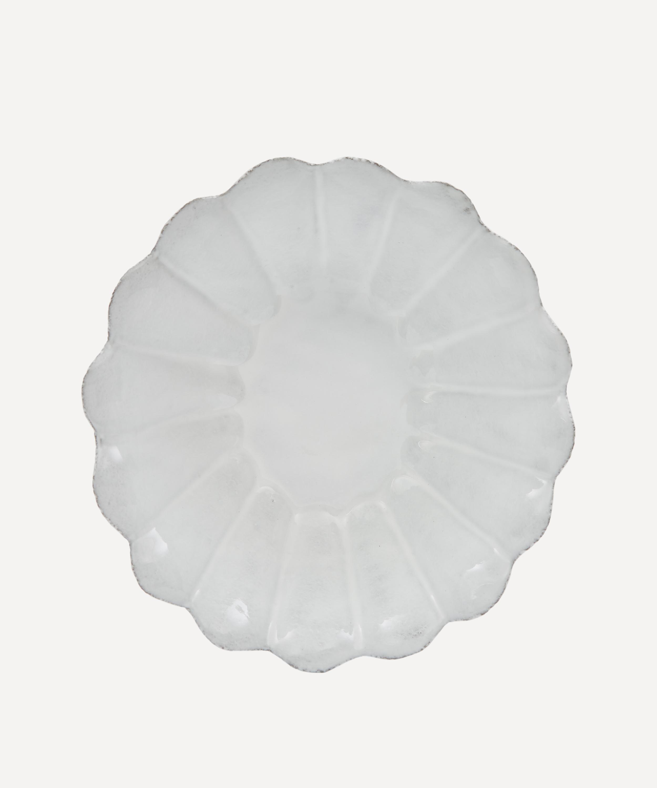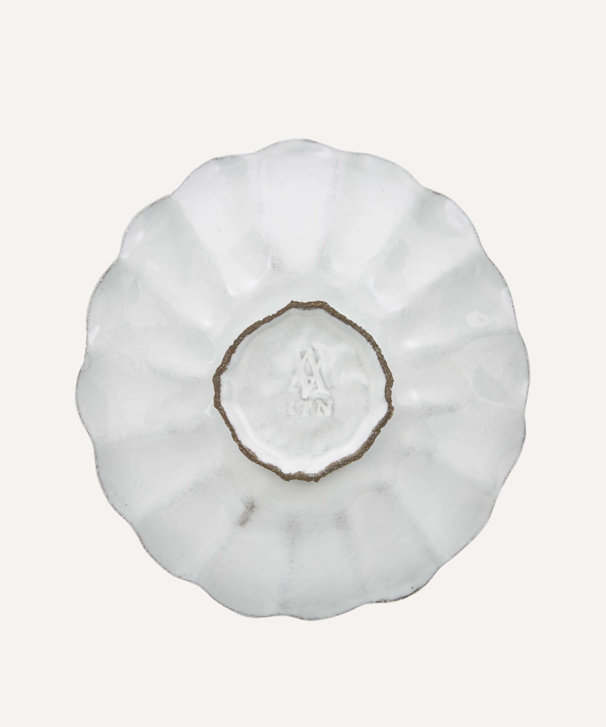 Votary of pre-industrial fabrication, Astier de Villatte is celebrated for being the one and only studio in Paris to hold and harbour the traditions of artisanal ceramic production. Restoring the ancestral systems of moulding and stamping, the Marguerite fruit bowl is made using handcrafting techniques from the Middle Ages which involve moulding a handmade sheet of clay, double firing the ‘biscuit’ piece and glazing the product in white enamel – a lengthy process that involves a drying time of up to one month. Characterised by its scalloped sides and high-gloss finish, the bowl is engraved with the brand’s signature crest – depicting an interlacing A & V – alongside the initials of one of the 40 master artisans who created it. Each handmade piece tells a beautiful story, it romances and imparts a sense of nostalgia into its owner. Arrange with other serveware in the collection to breathe an air of authenticity into your table setting.