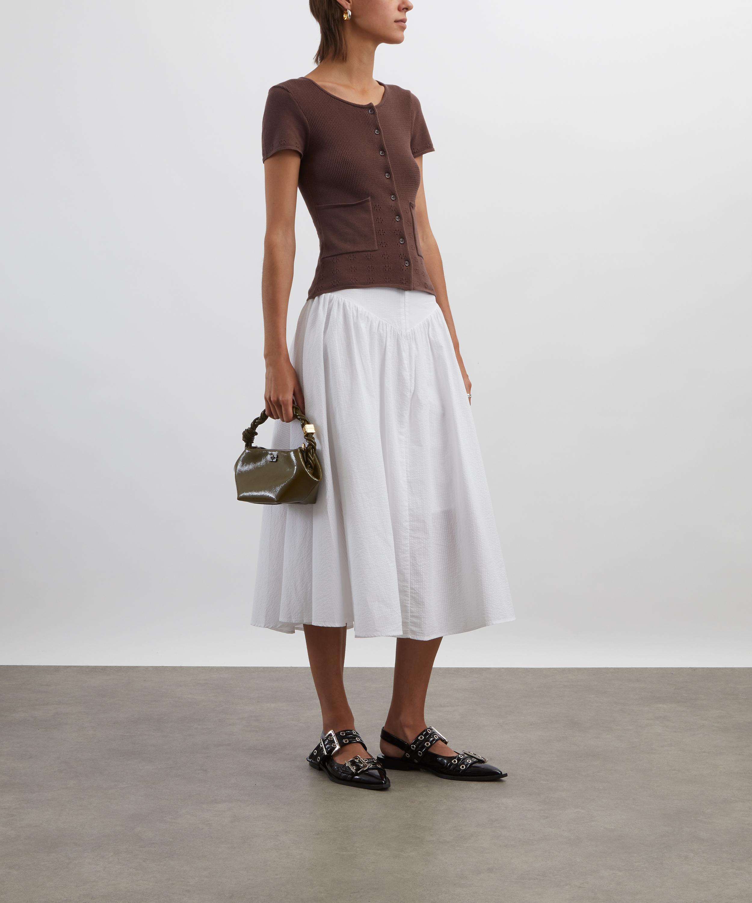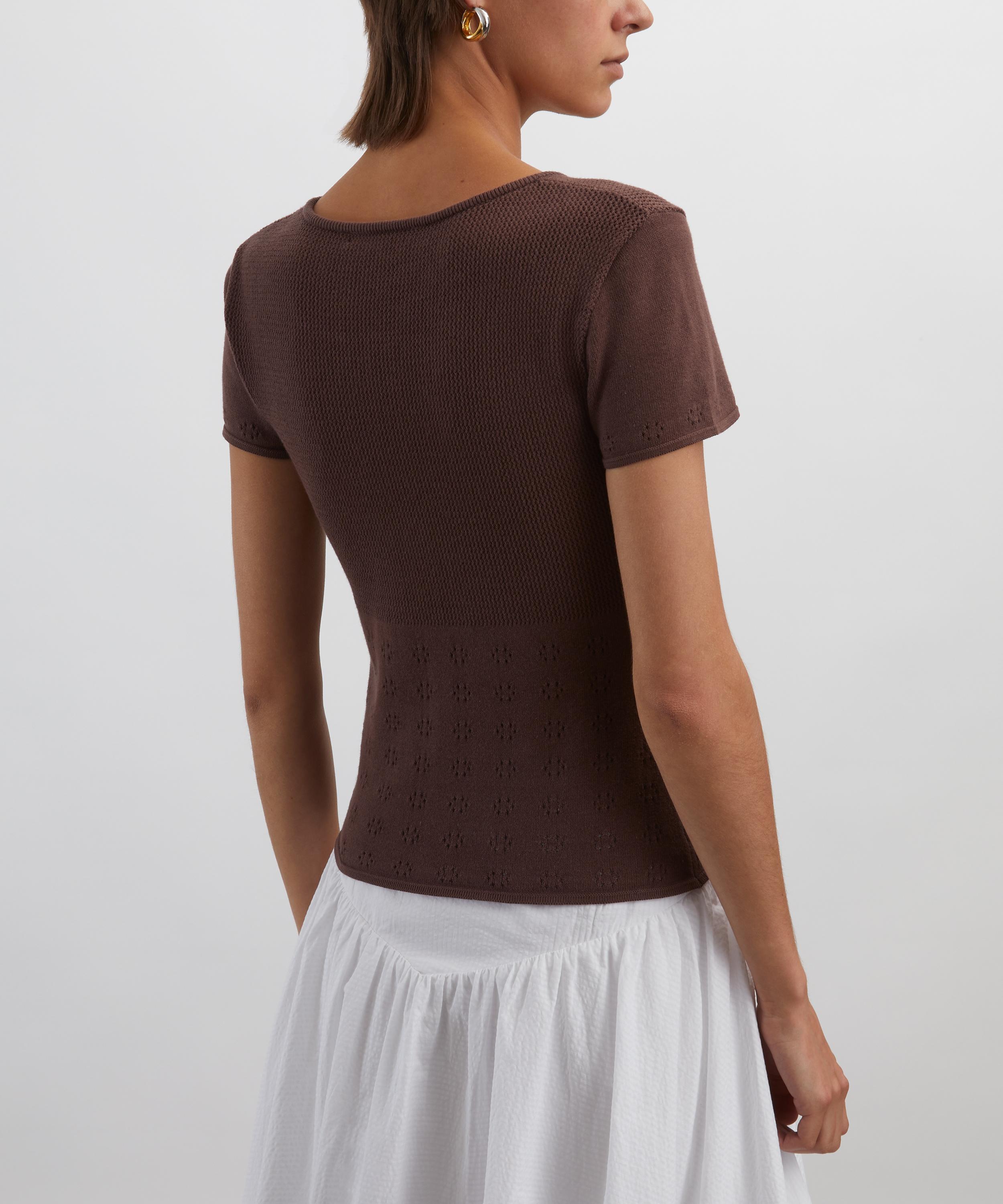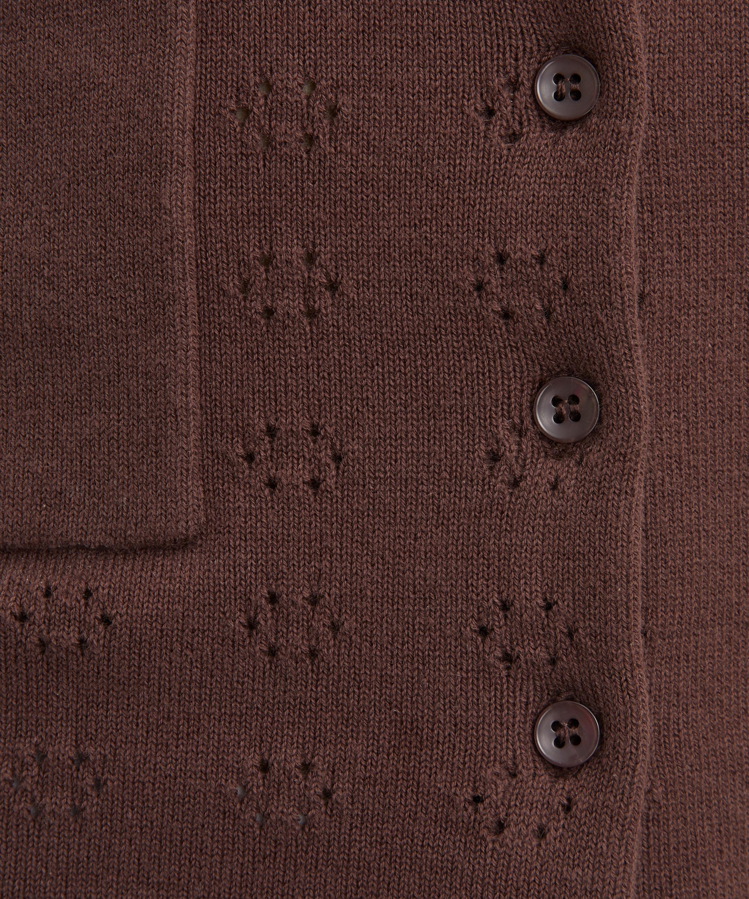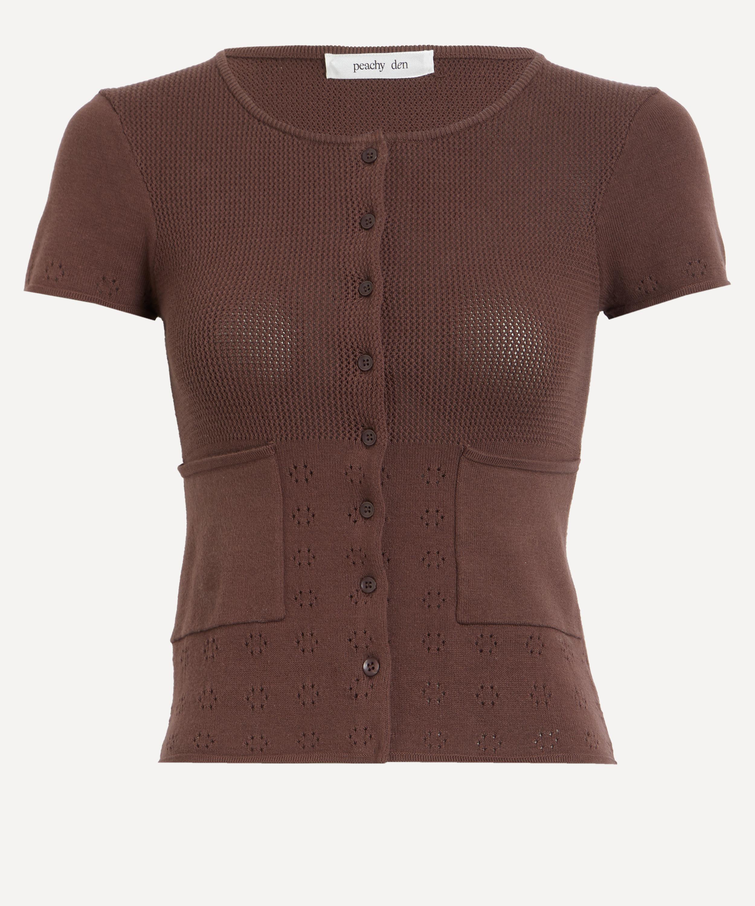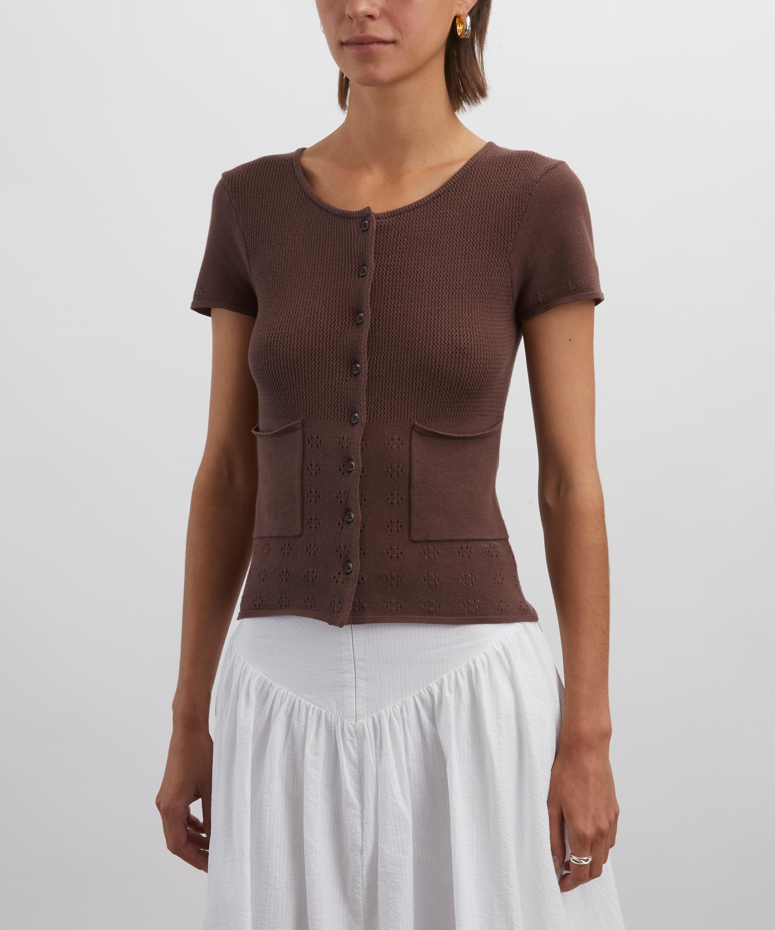 Effortlessly feminine, this fitted knit top exudes elegance with its scoop neckline and delicate pointelle flower detailing at the waist. A form-fitting design, its complete with a tonal front button fastening and two small patch pockets.
