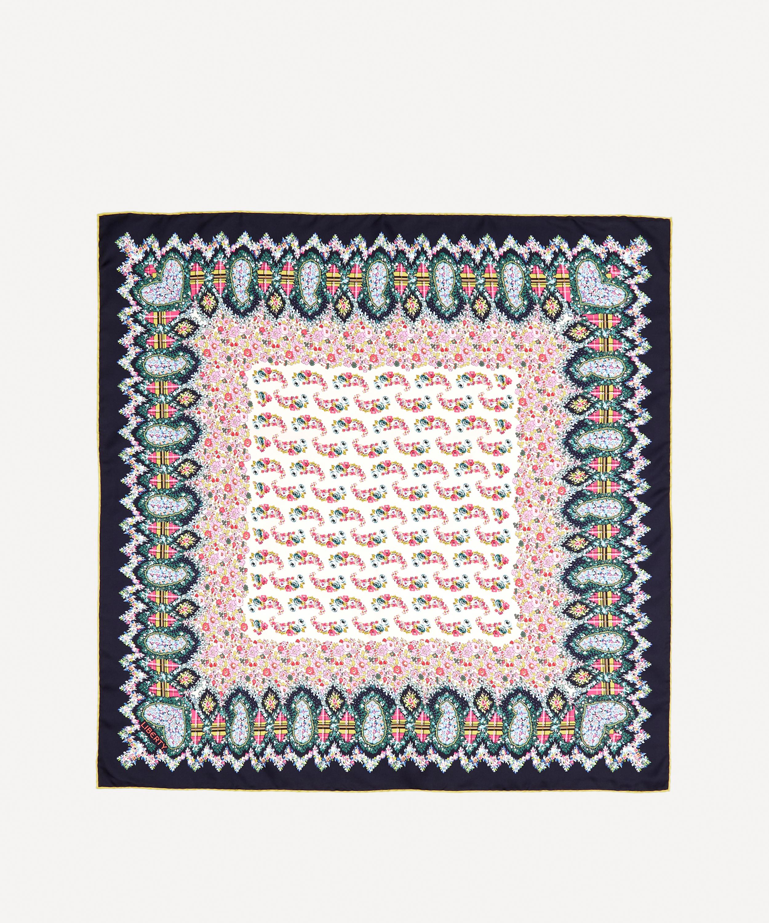 Whether looped around your neck or slipped through the handles of a tote, a Liberty scarf is a heroine of versatile styling. This silk twill scarf is printed with Marietta – based on a scarf artwork from the Liberty archive, its traditional botanical print has rose garlands drawn with an ikat-style technique to form a beautiful detailed border, finished with decorative paisleys and tartan details. The centre of the scarf is inspired by an impression sheet from the Liberty archive, featuring floral-filled paisley shapes surrounded by tiny scattered leaves.
