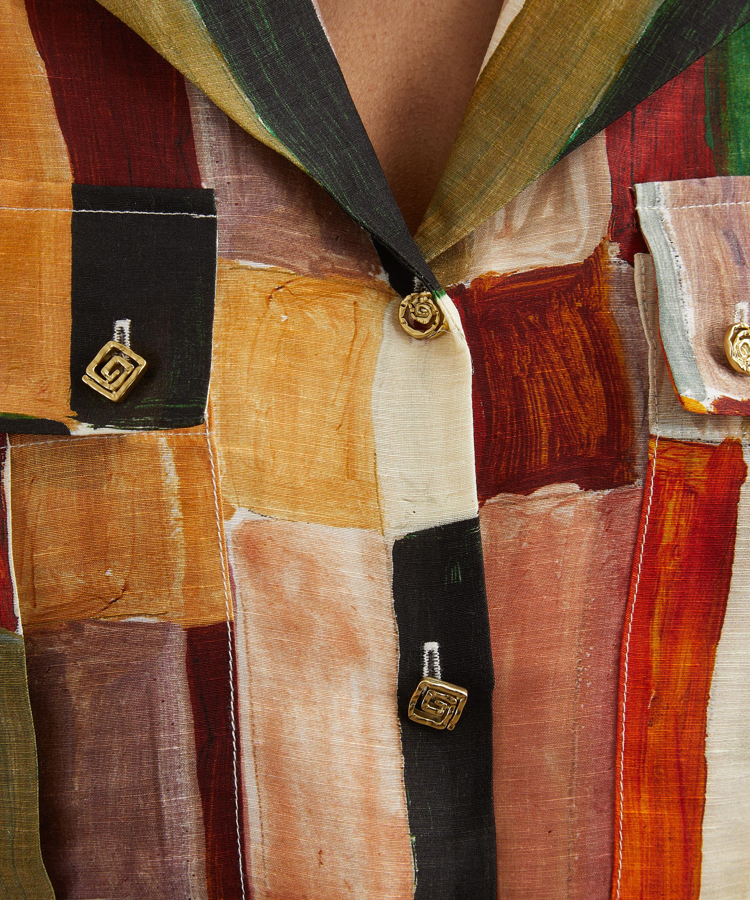 Created in collaboration with artist Laurence Leenaert, this shirtdress is adorned with a painterly cubist print. Cut from a lightweight linen and silk blend, it features a relaxed maxi silhouette with a notched collar, wide elbow-length sleeves, and two buttoned flap pockets, finished with a self-covered rouleau belt to cinch the waist.