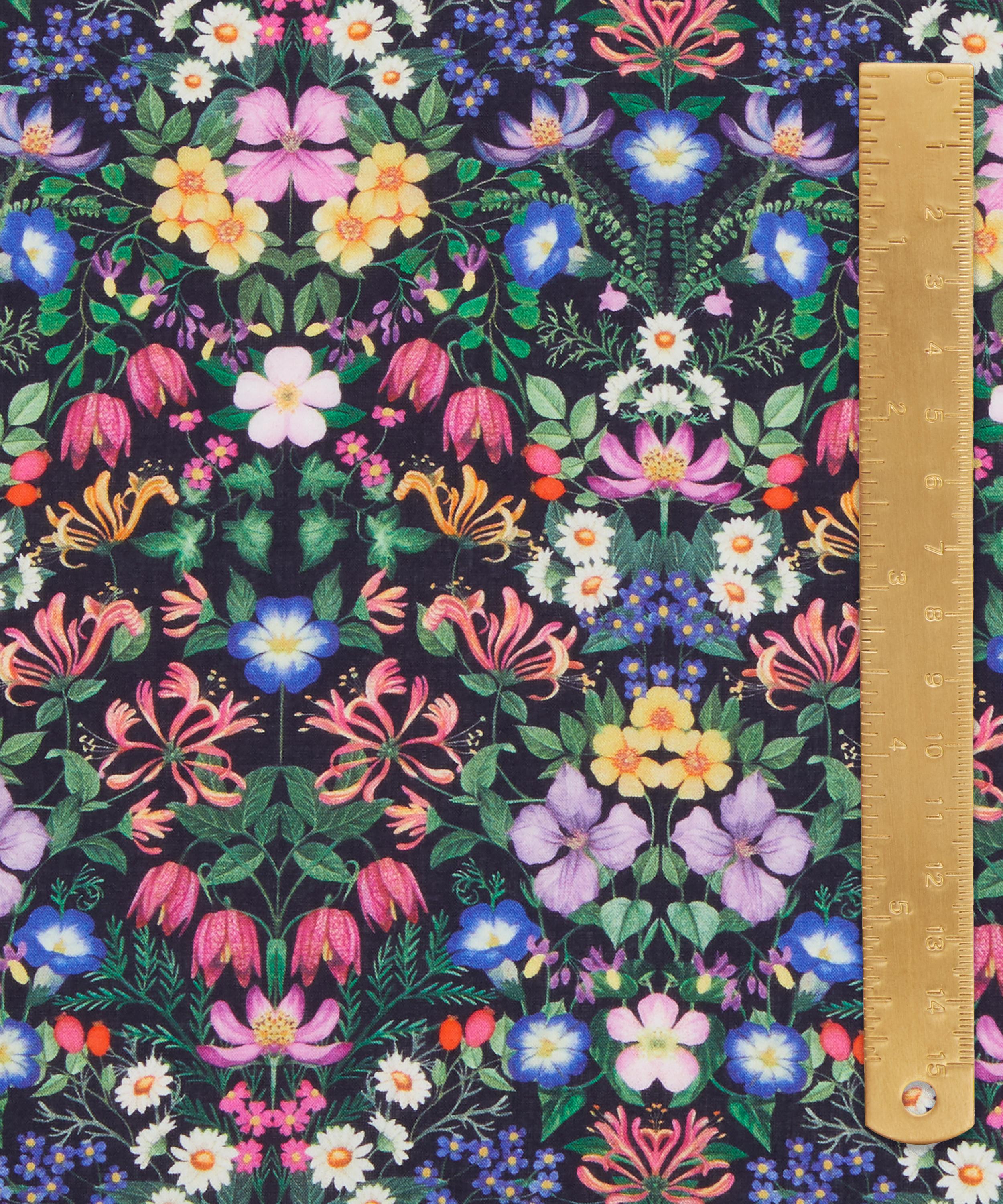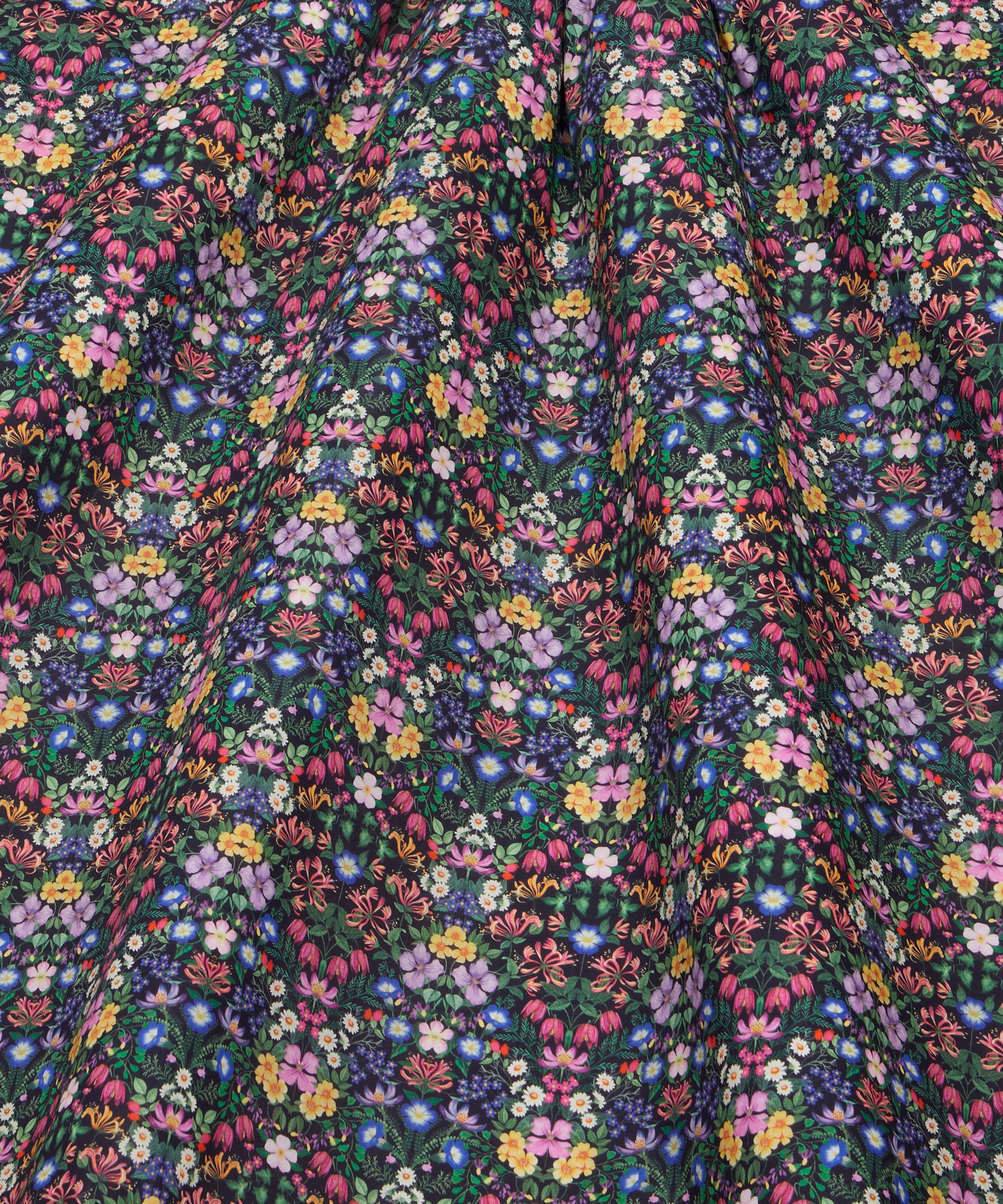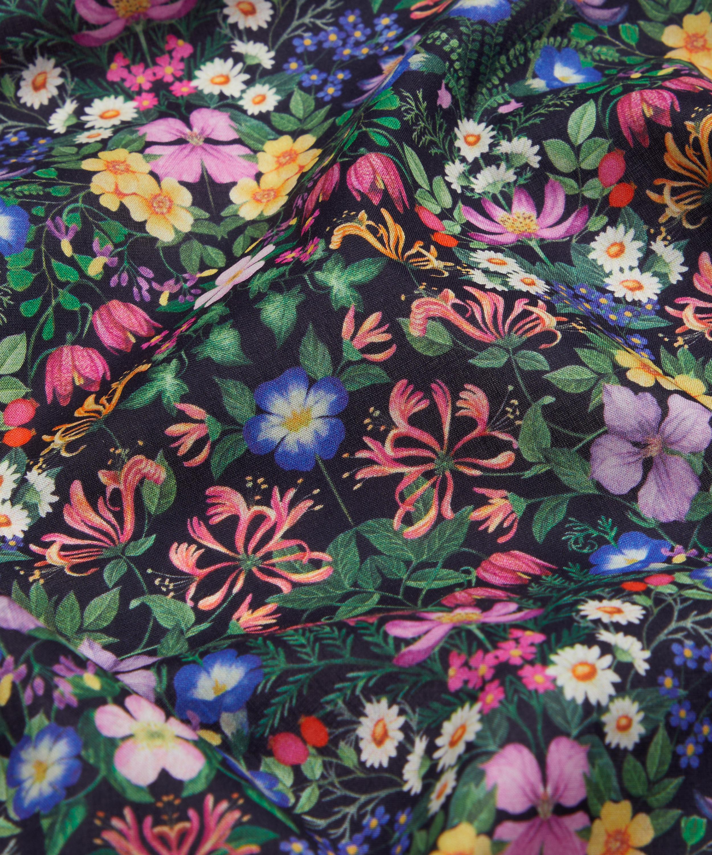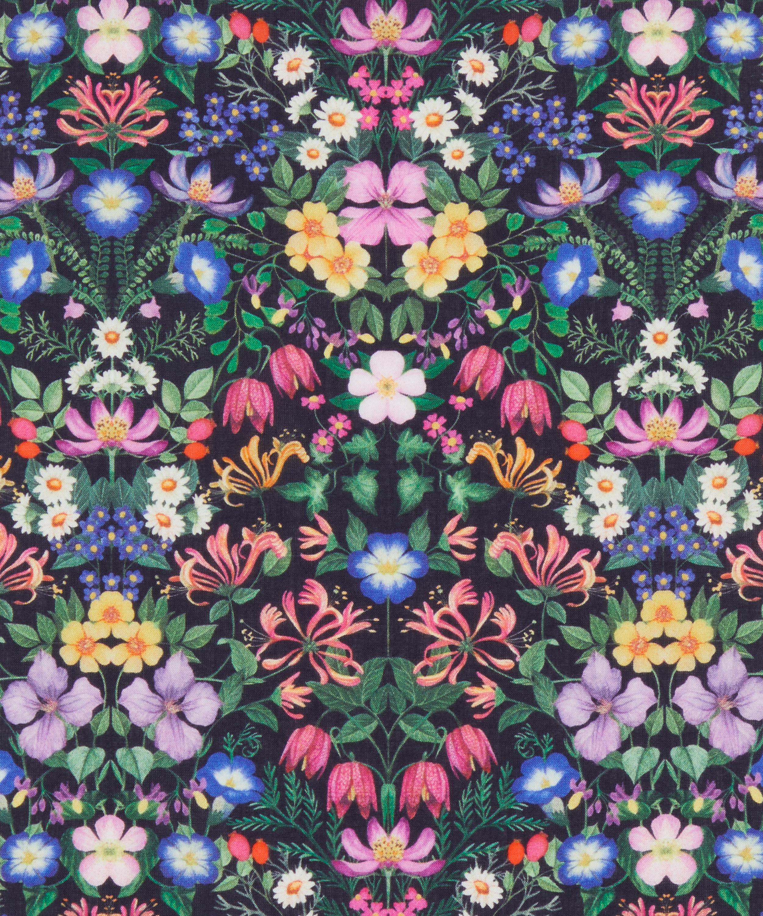 Heavily influenced by the recognisable Arts & Crafts mirrored repeat, and inspired by the Florilegium Society which records flowers from a specific place, this design depicts detailed watercolour paintings of British wildflowers. From honeysuckle to forget-me nots, the flowers in this design sit amongst trailing ferns and leaves. This print is part of the Floral Library narrative of the AW24 collection, which studies the subject through the Botanist’s eye, cataloguing and exploring an assortment of species as well as a being a celebration of key florals throughout Liberty’s history.