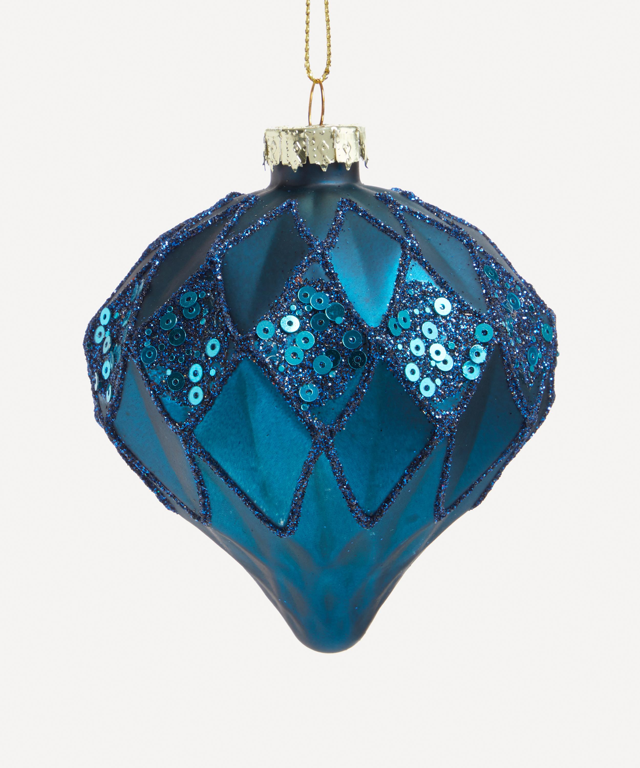 Curate a contemporary Christmas collection with this matte navy glass bauble. A luxurious option for those seeking a treasured heirloom piece to add to their festive collection, the decoration is characterised by a unique onion shape and geometric design with glitter detailing.