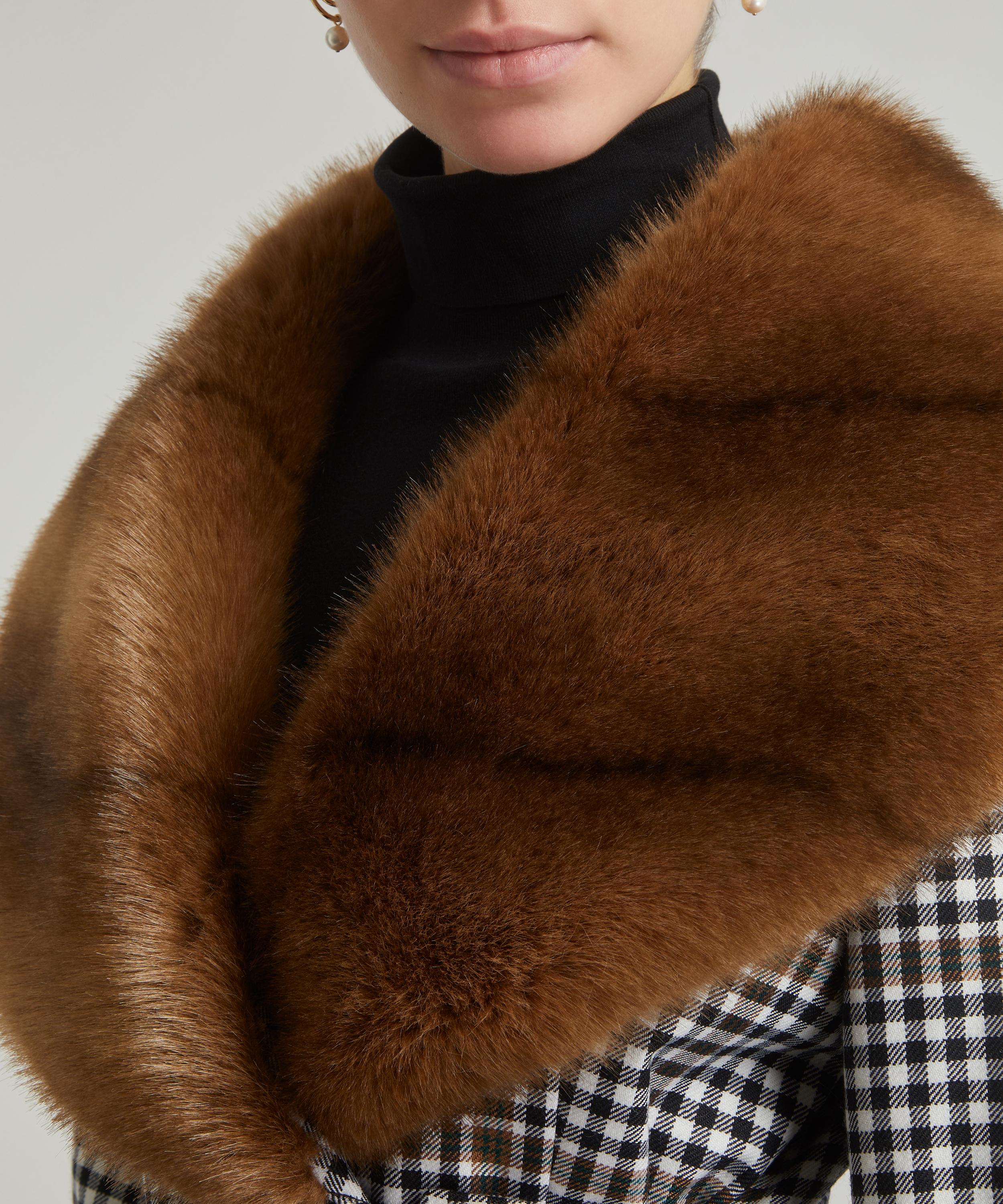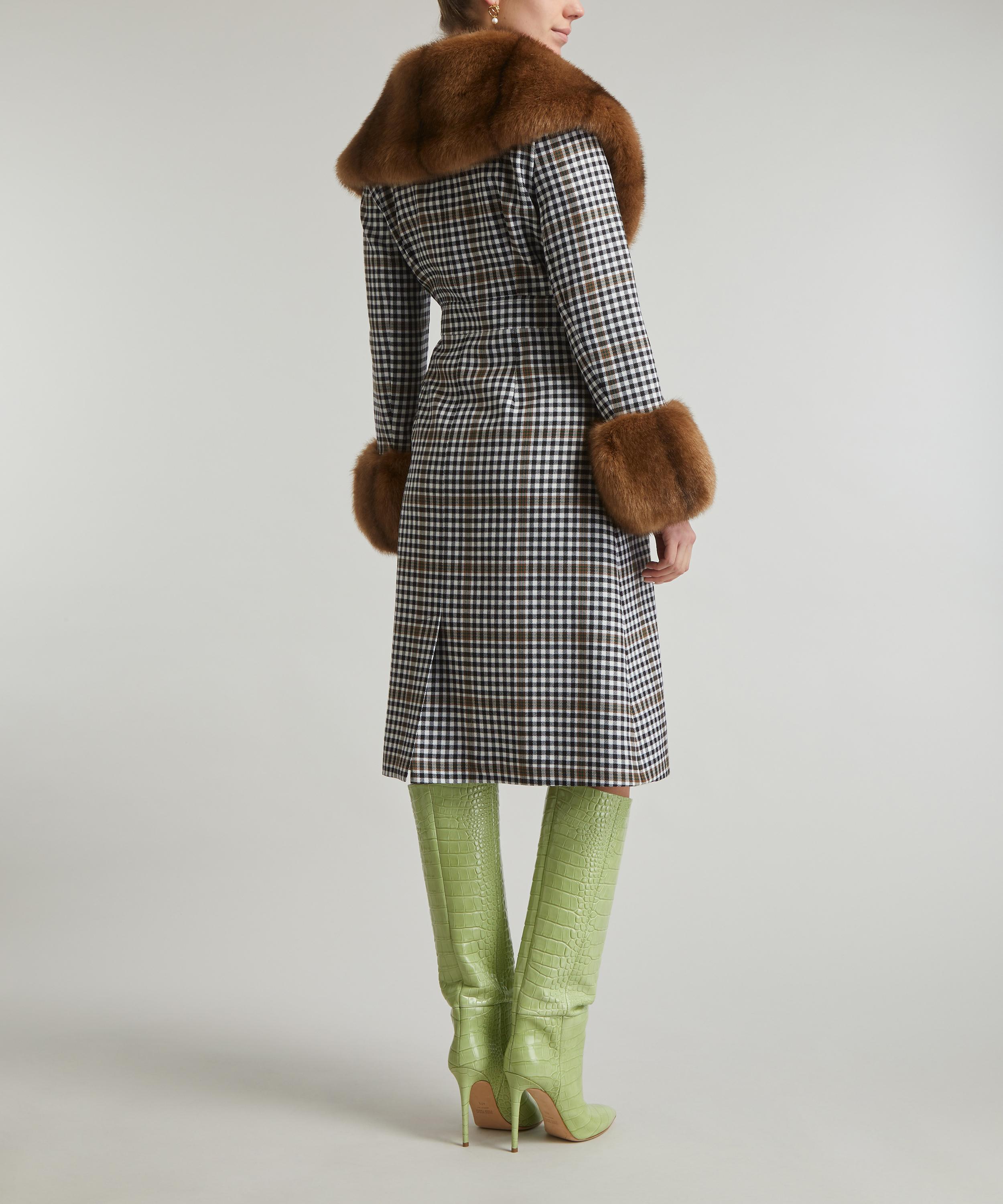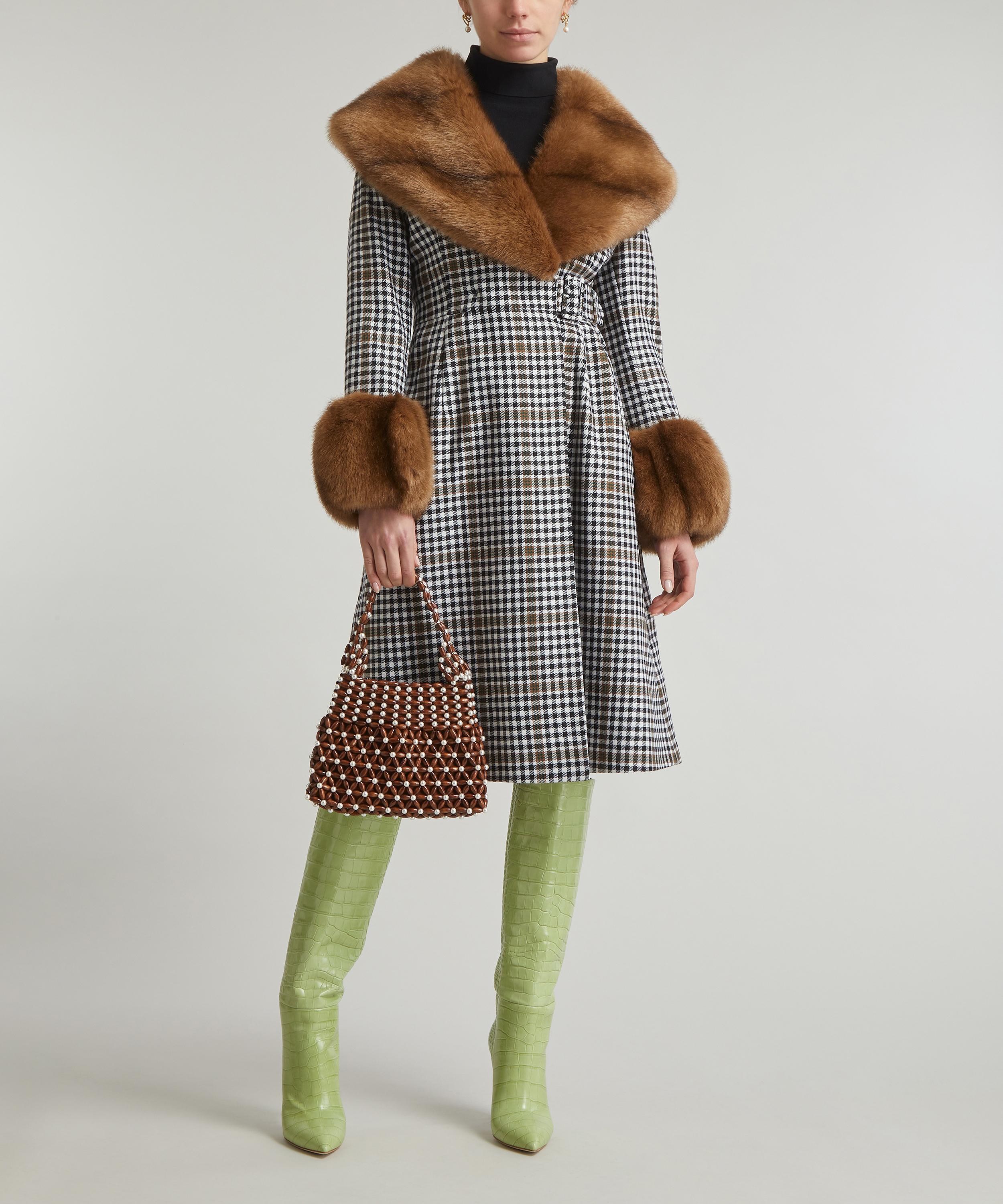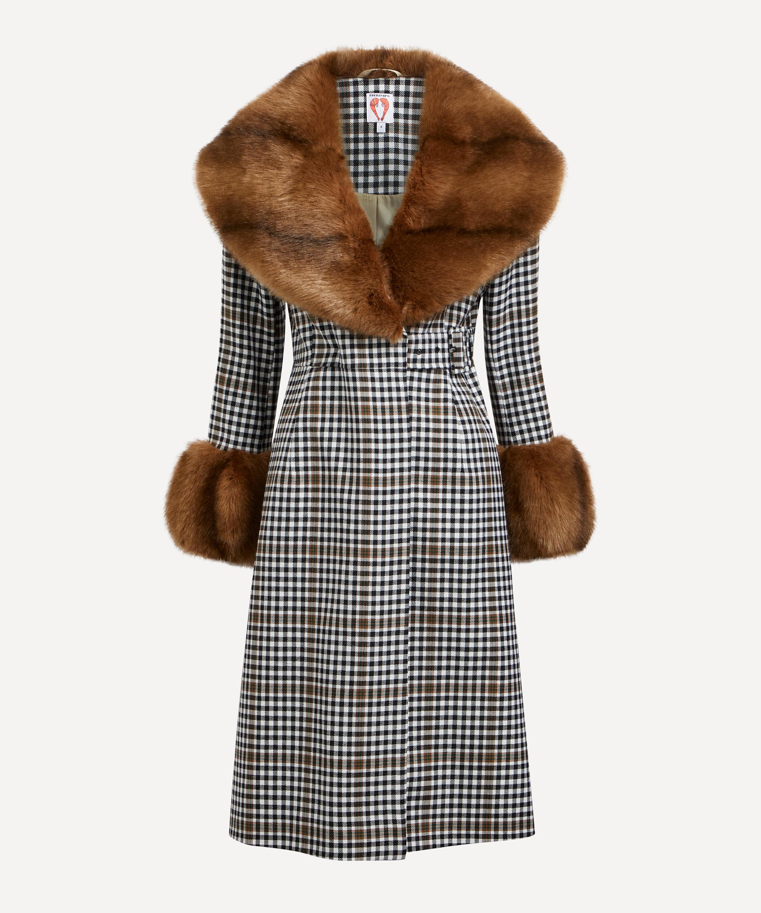 Effortlessly glamorous with its faux-fur shawl collar and cuffs, British fashion brand Shrimps serves up the Maude coat. Crafted from wool in a preppy gingham plaid pattern, this wrap-over coat is secured by a buckle fastening on the side.