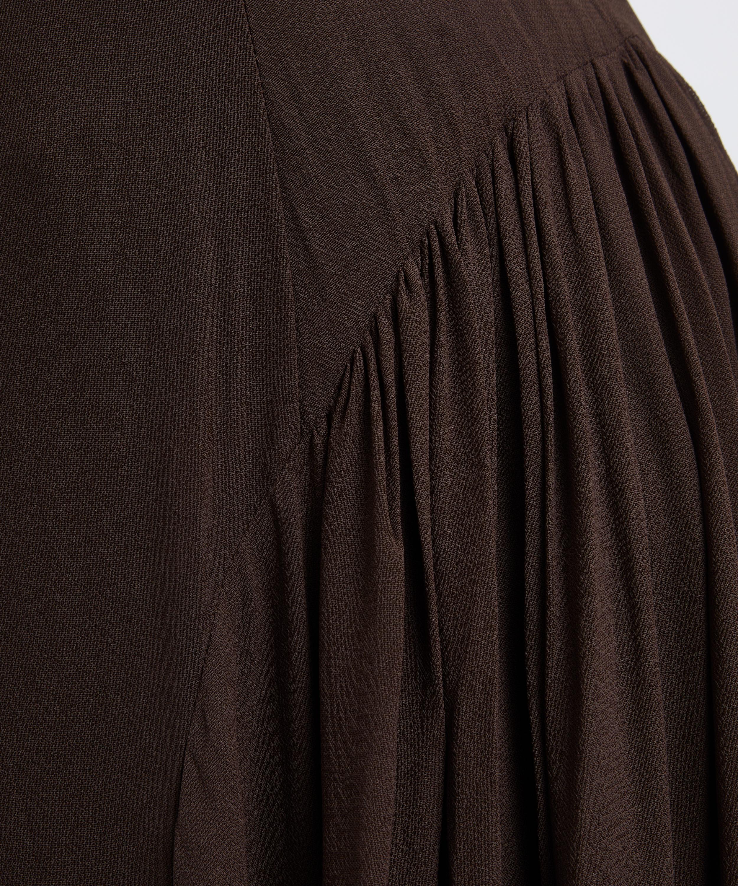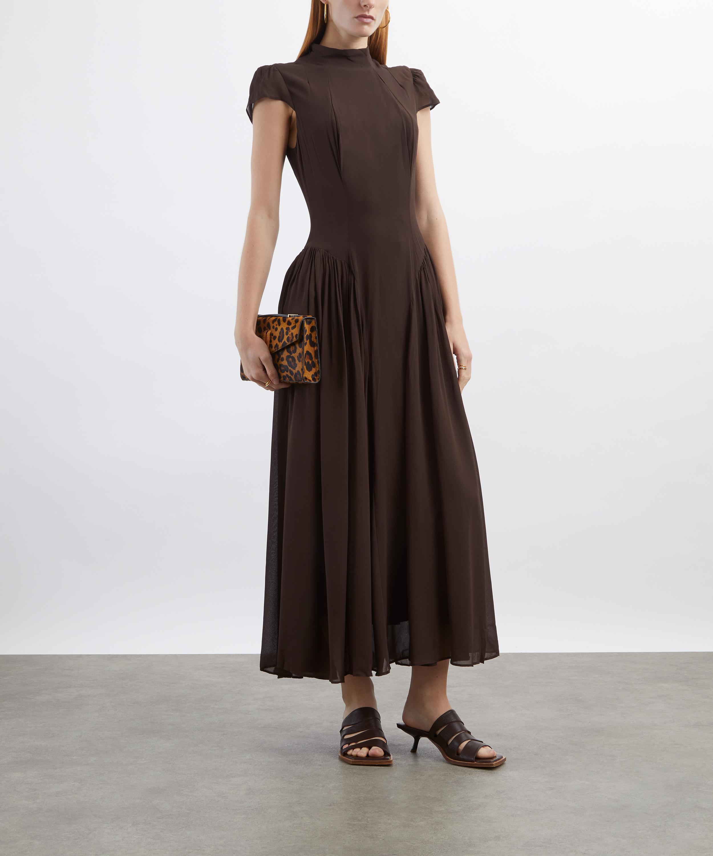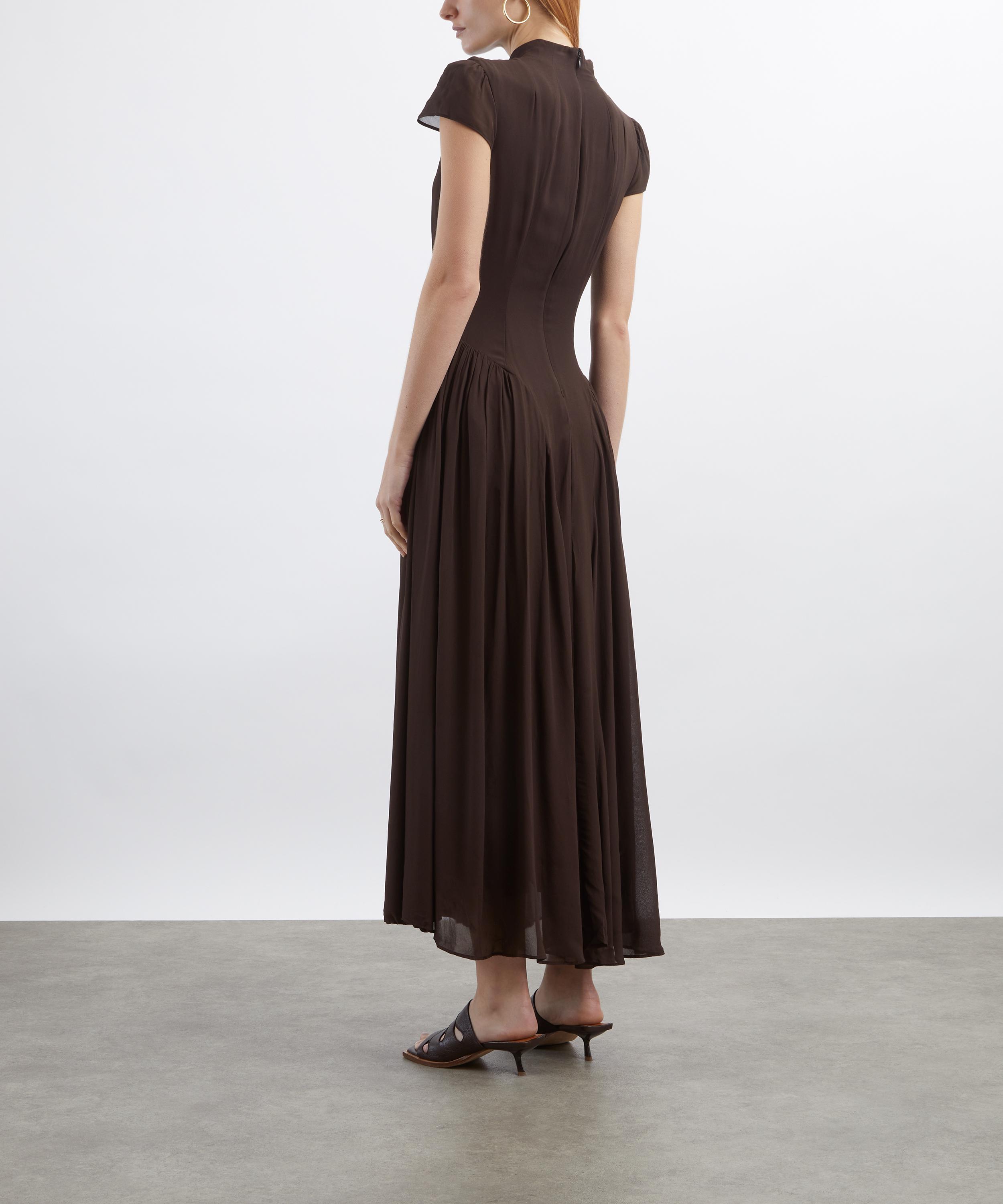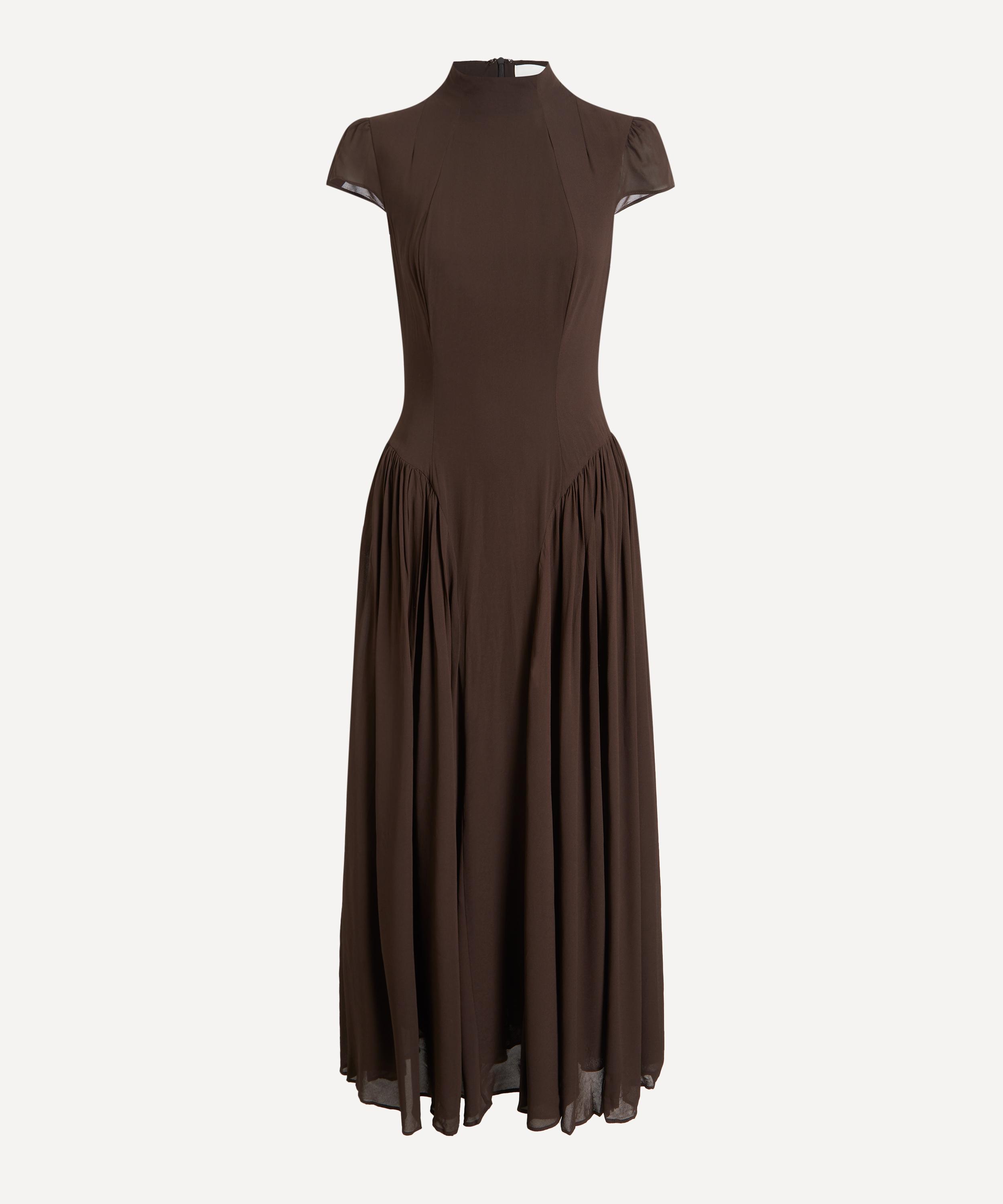 Crafted from lightweight georgette, the silhouette flatters with a slim-fitting bodice that flows into a voluminous maxi skirt at the drop waist. Finished with delicate pleating and a refined mock neck, it captures timeless sophistication with a modern ease.