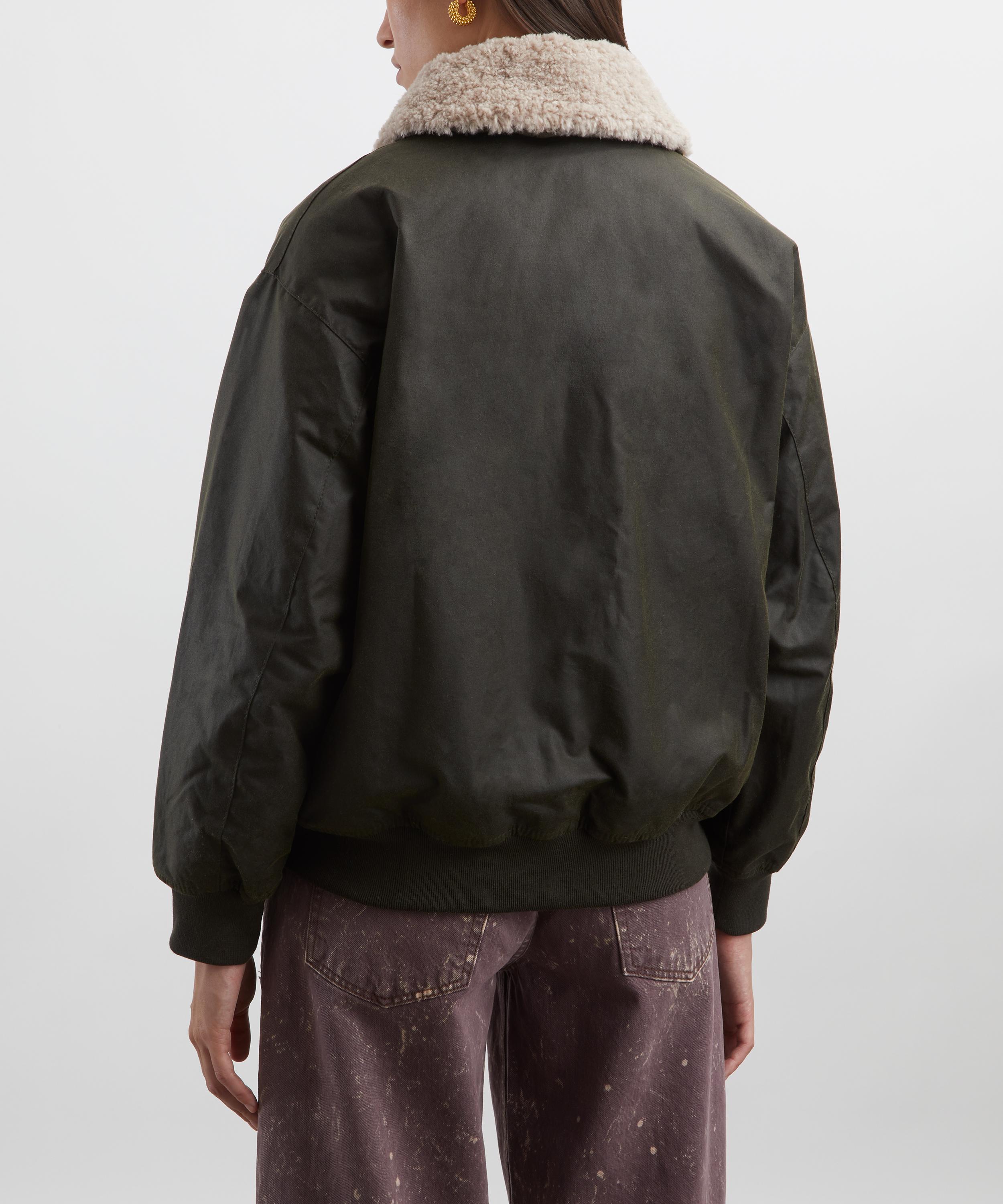 Get ready for cooler days with the Maxine Waxed Bomber Jacket. This oversized jacket blends timeless style with practical features like a detachable teddy collar, durable metal zip, ribbed cuffs, box-quilted check lining, and convenient pockets for everyday wear.