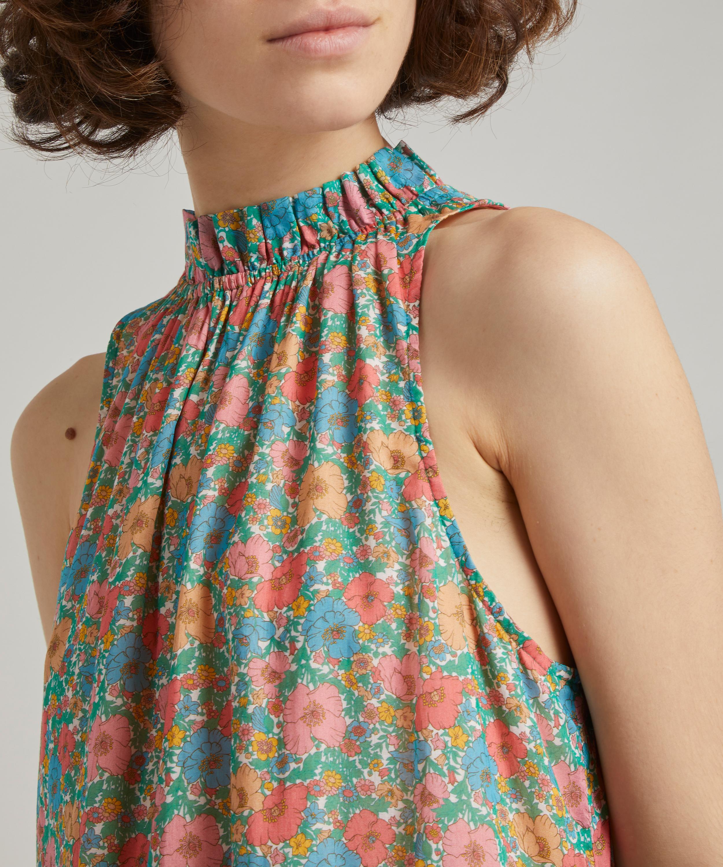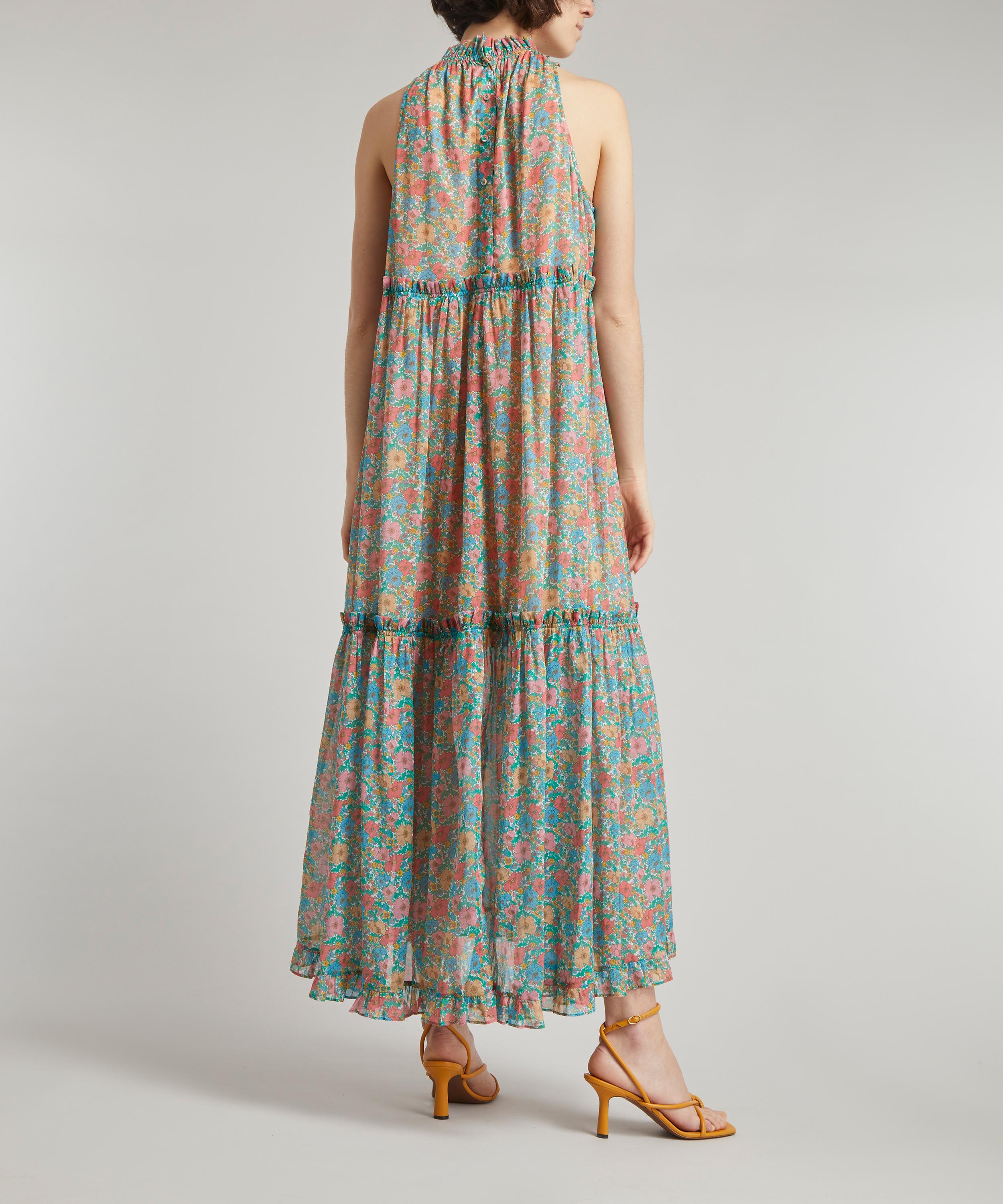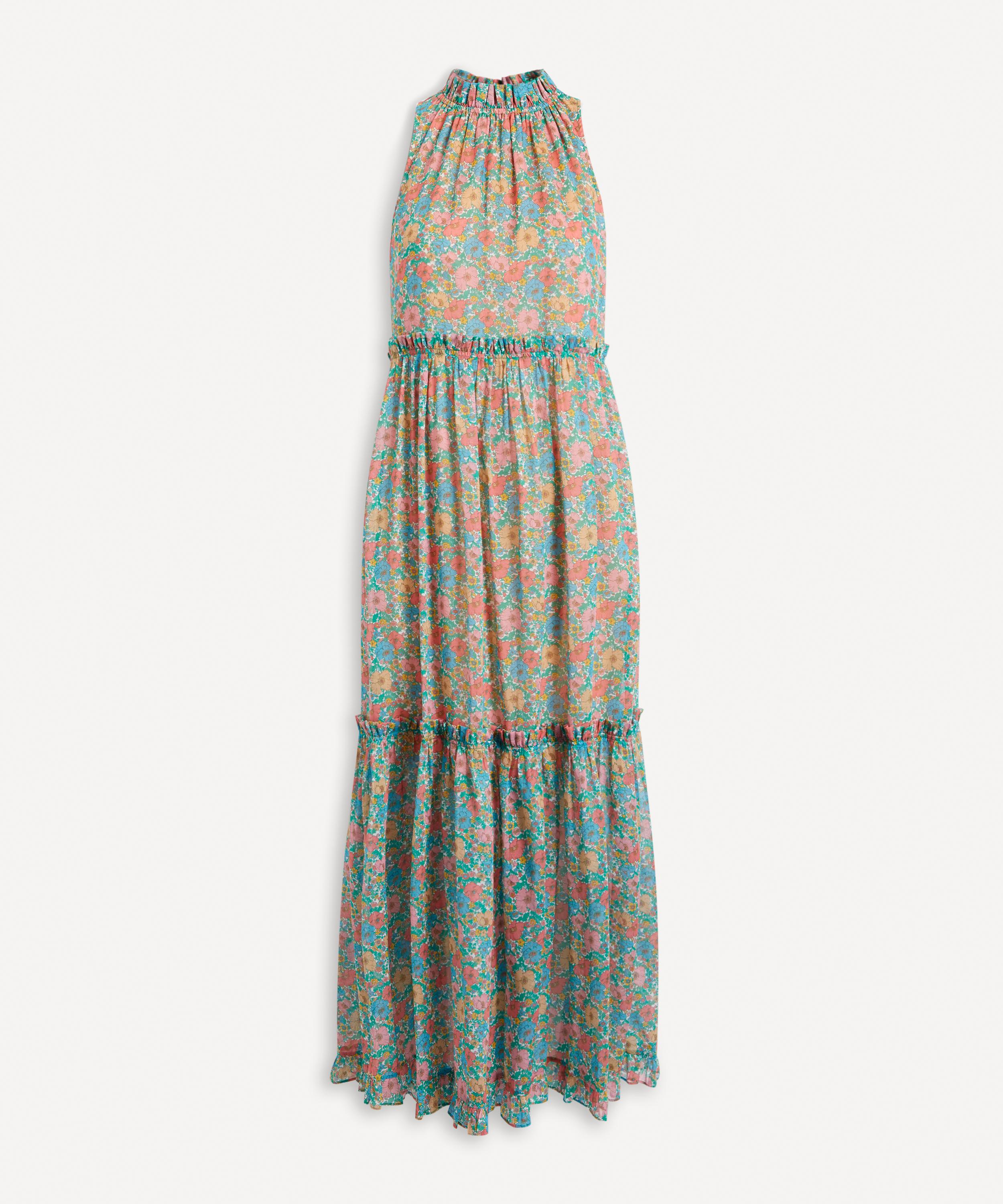 Designed in Australia and crafted from Liberty Chloe chiffon-cotton for a breezy finish, the Floral Eve dress is embossed with the charming Liberty Fabrics’ Meadow Song print – a beautifully rendered botanical, redrawn from a hand-painted artwork discovered in the Liberty archive. Paying homage to Liberty’s long-standing love affair of poppies and daisies, it exhibits a nostalgic floral mood. Tailored to a maxi-length, this sleeve-less dress is cut to a loose, tiered silhouette with a raised neckline, complete with a delicate ruffle collar. Wonderfully whimsy, pair it with strappy sandals for an effortlessly chic evening edit.