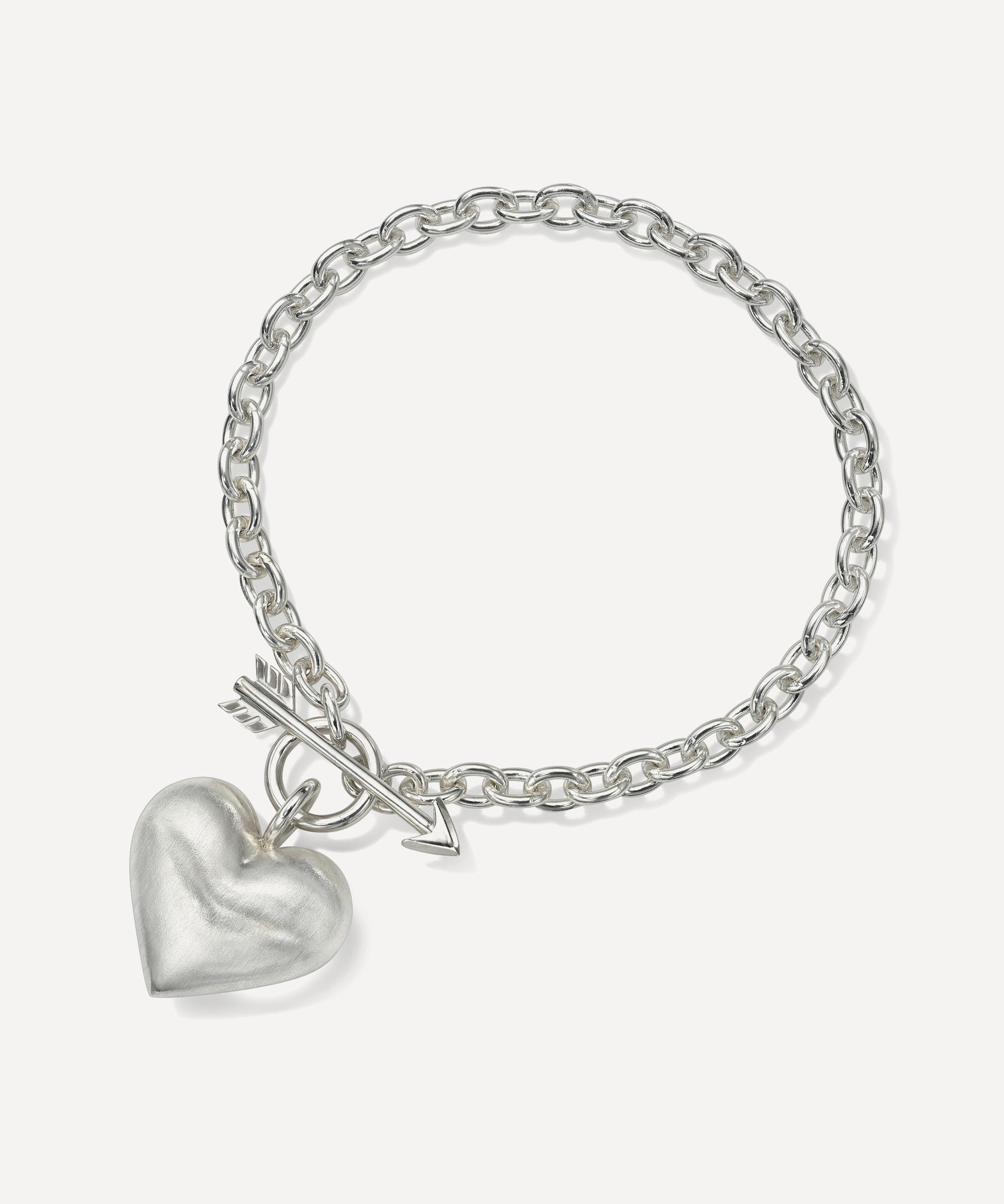 Suspended from a sterling silver chain, this bracelet features a plump heart charm, sleekly secured with a front arrow toggle clasp. Handmade in Rachel Quinn's LA studio, try styling it with a pair of the designer's whimsically creative drop earrings for a dreamy curation of wearable works of art.