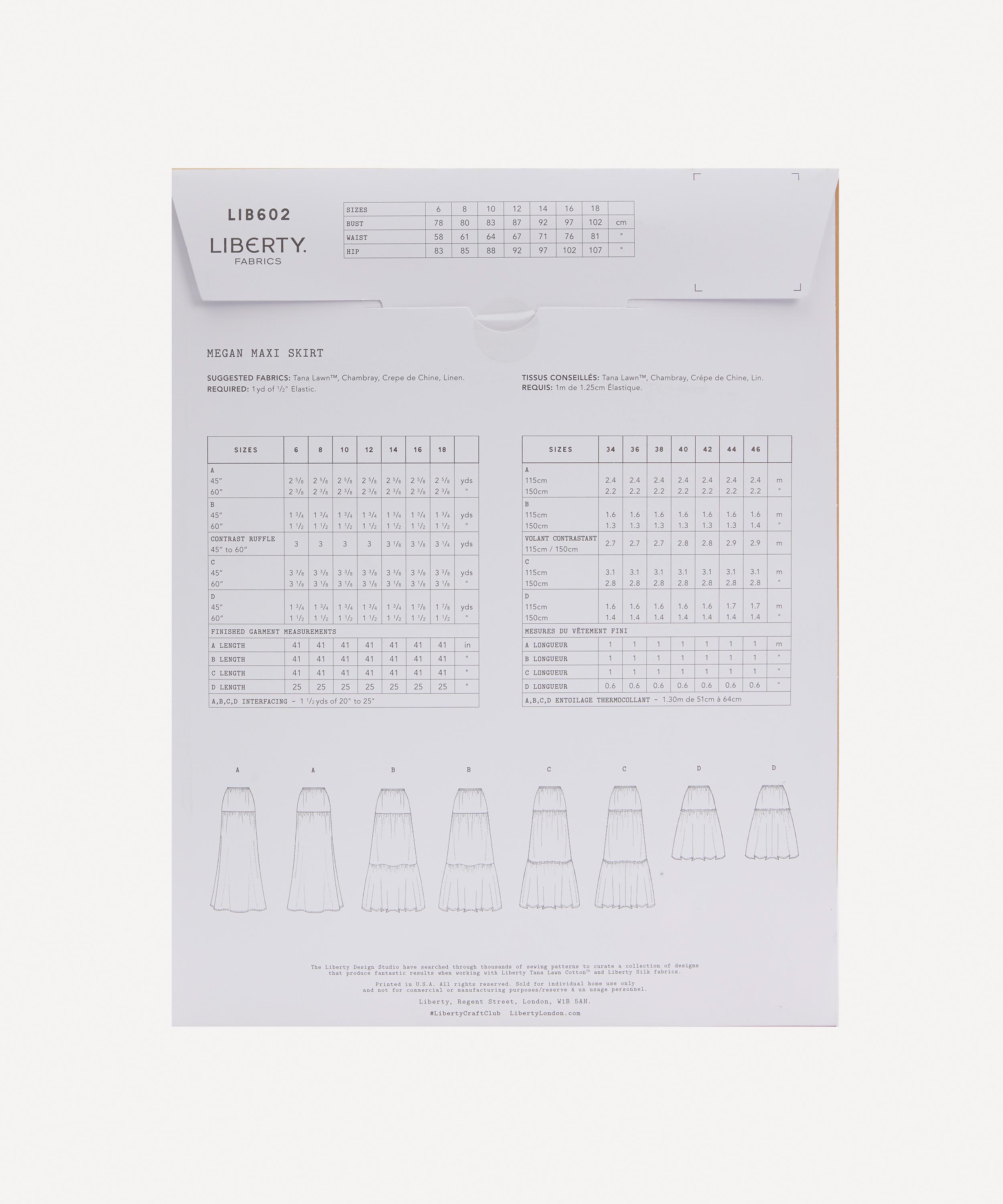 The new Liberty Fabrics dressmaking patterns draw inspiration from our richly storied fashion archive, with contemporary style details offering a fresh twist on classic vintage shapes. Pretty and versatile, the Megan skirt can be constructed in varying lengths with different levels of tiers. Make this Liberty garment in textural matte crepe de chine or our signature Tana Lawn™ cotton, in sizes 6-18.