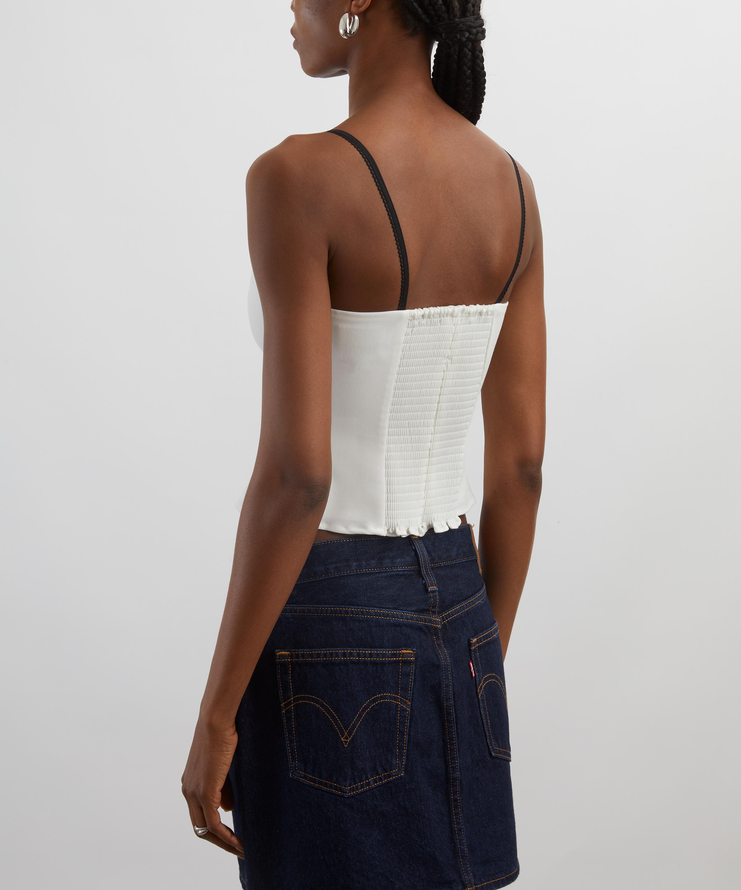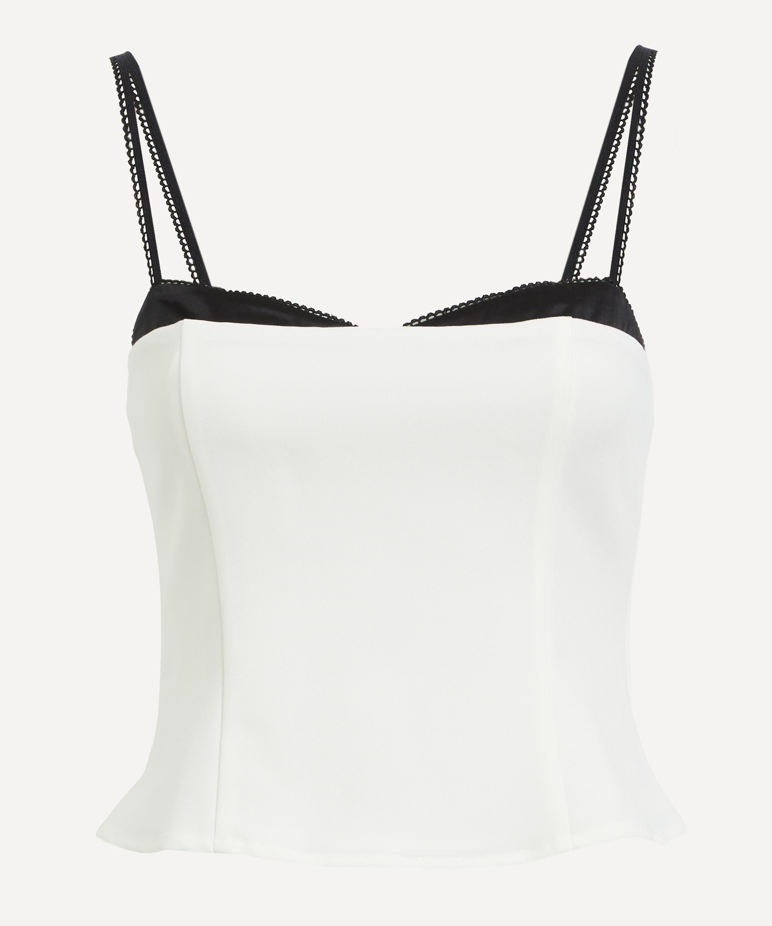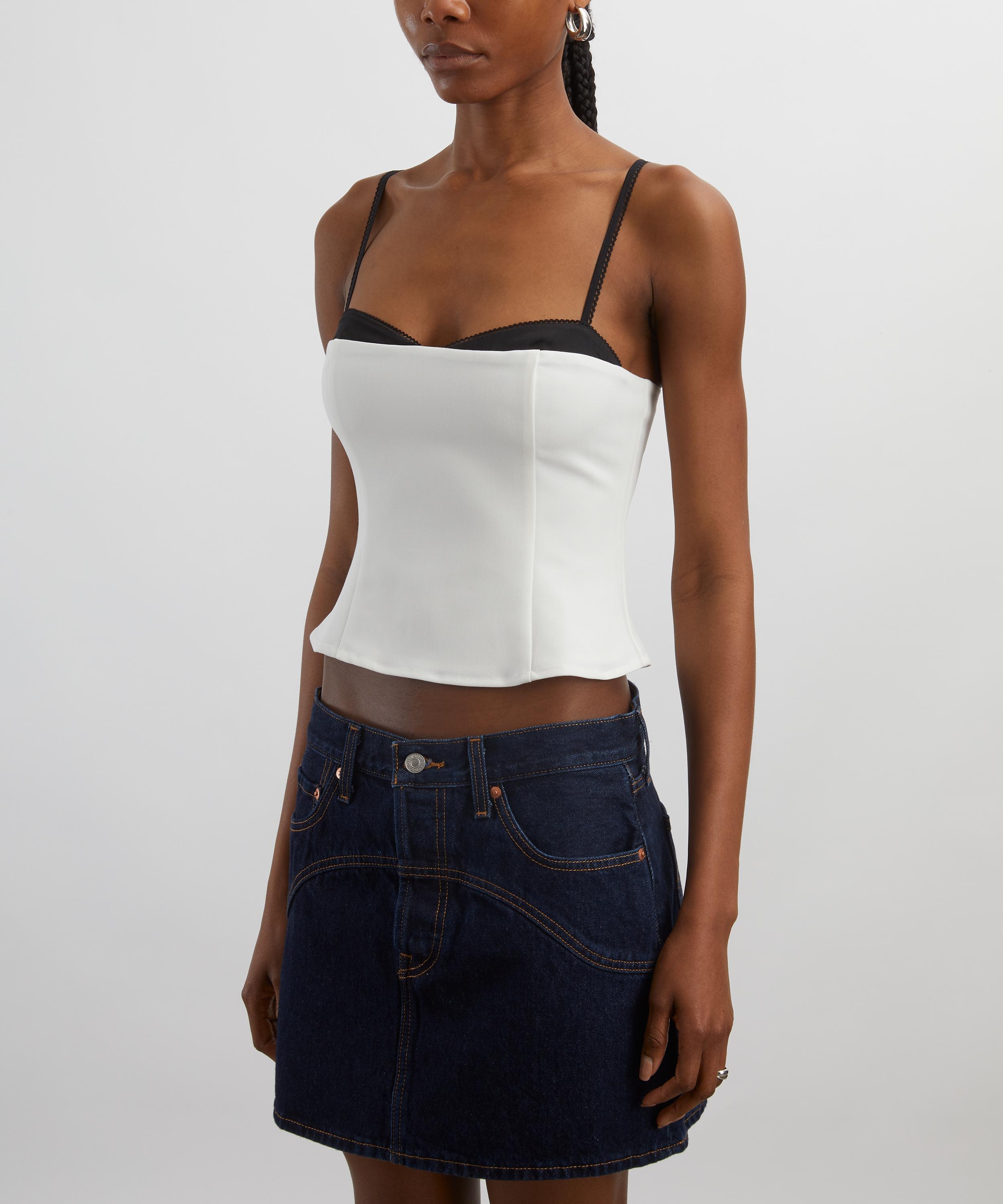 Crafted for a fitted silhouette, this layered piece seamlessly blends boldness with femininity. Featuring a black bralette peeking out beneath a white bandeau top, it offers a striking contrast that exudes playful elegance.