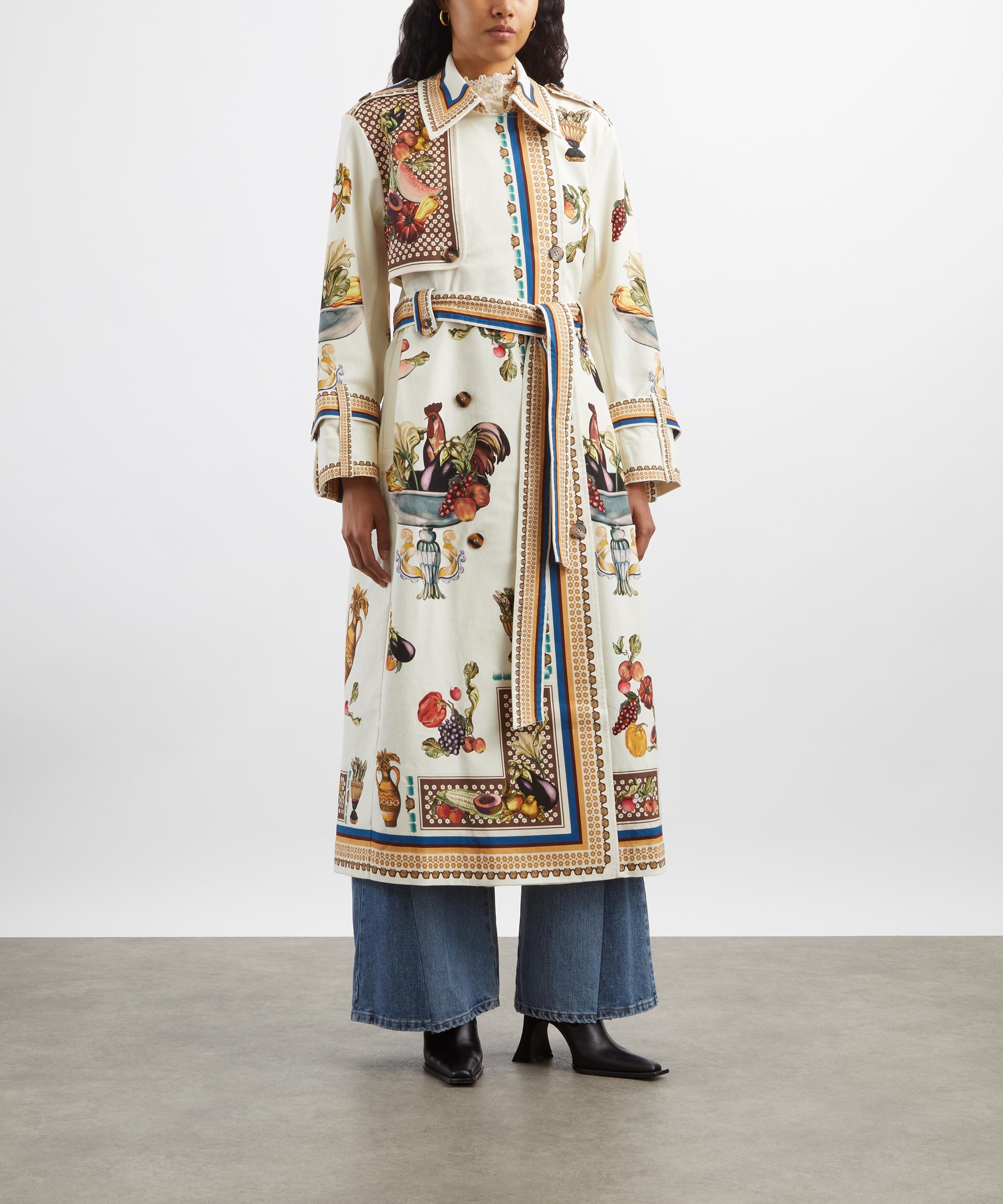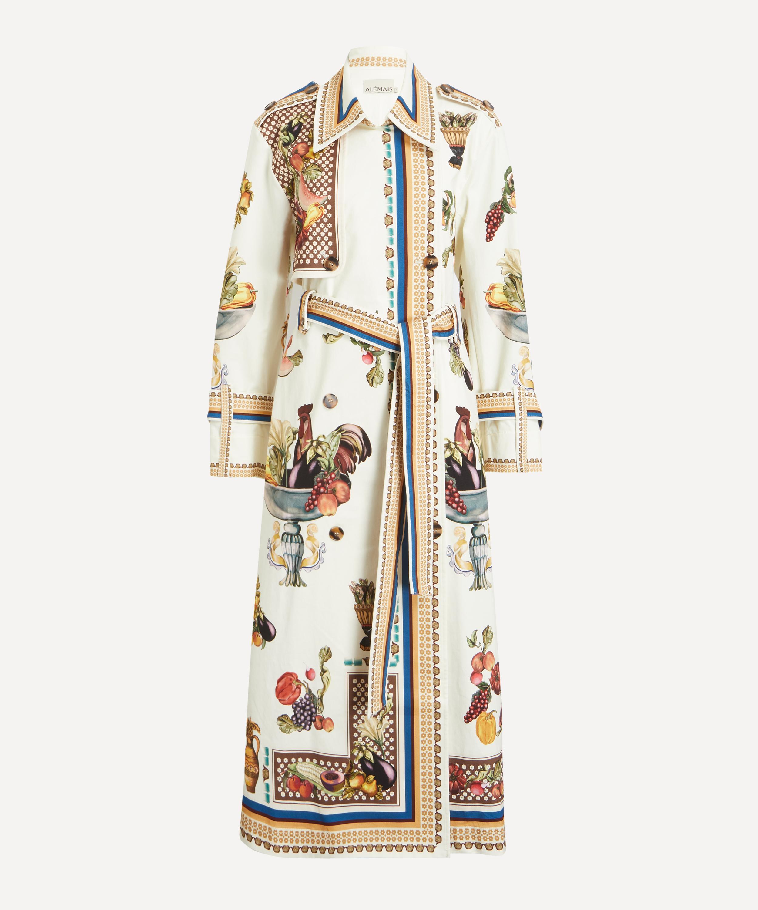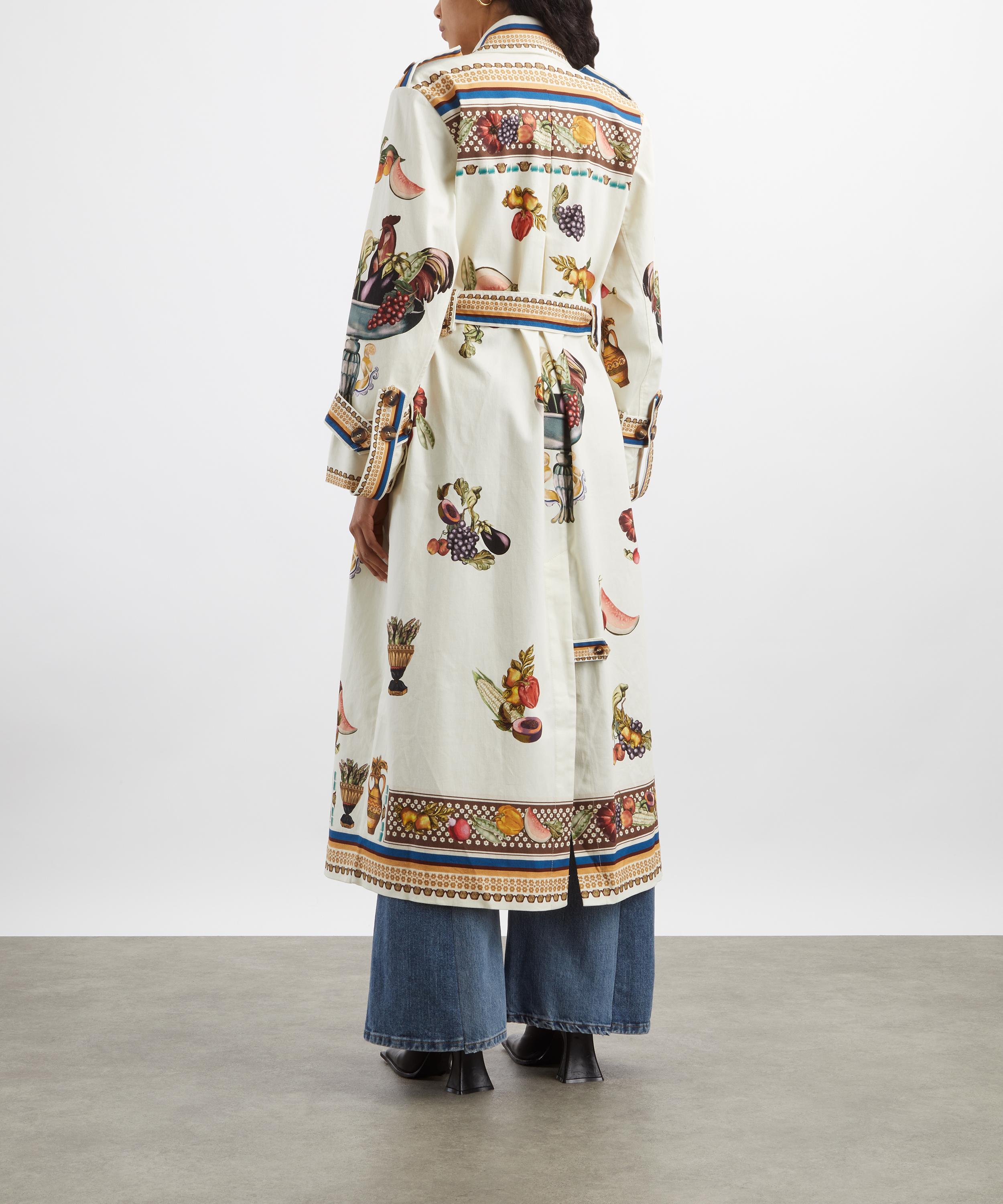 Putting an unmistakably Alémais twist on classic tailoring, this oversized trench coat is adorned with vibrant fruit and vegetable motifs. Traditional details gun flap, shoulder epaulettes, cuff straps, welt pockets, and a belted waist - anchor the playful print with timeless structure.