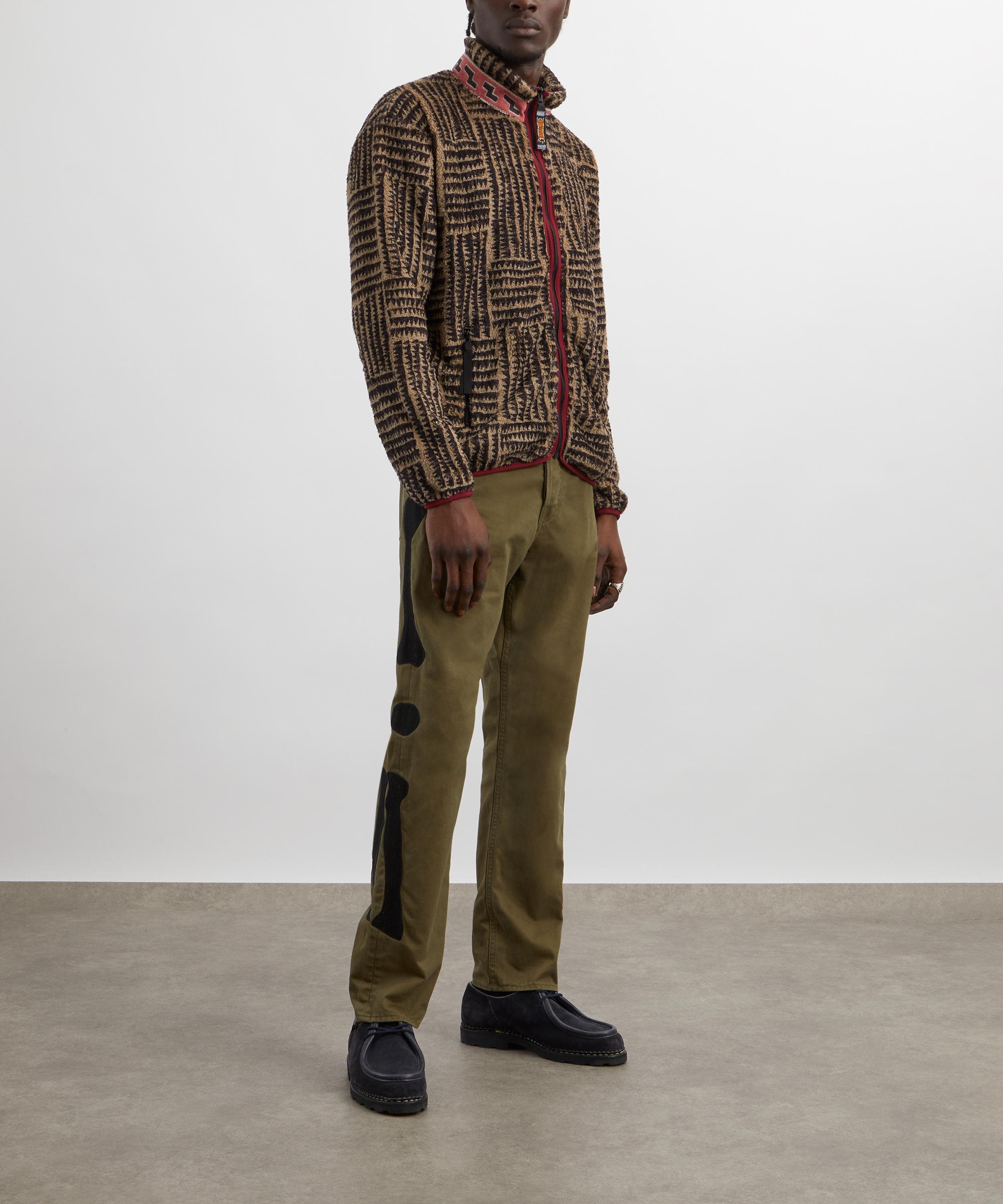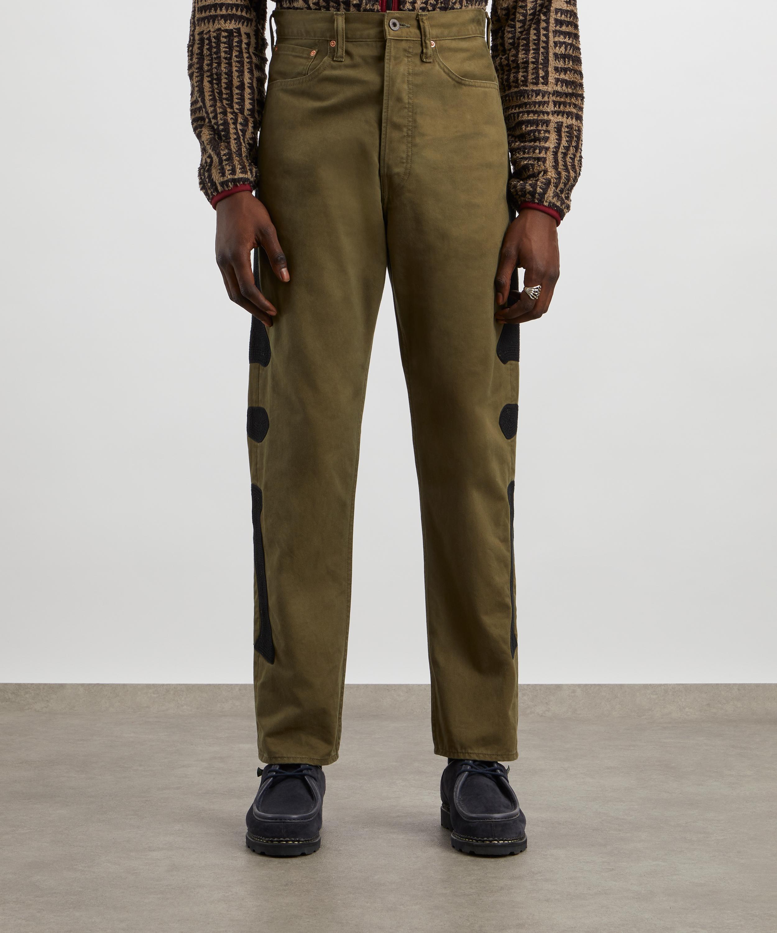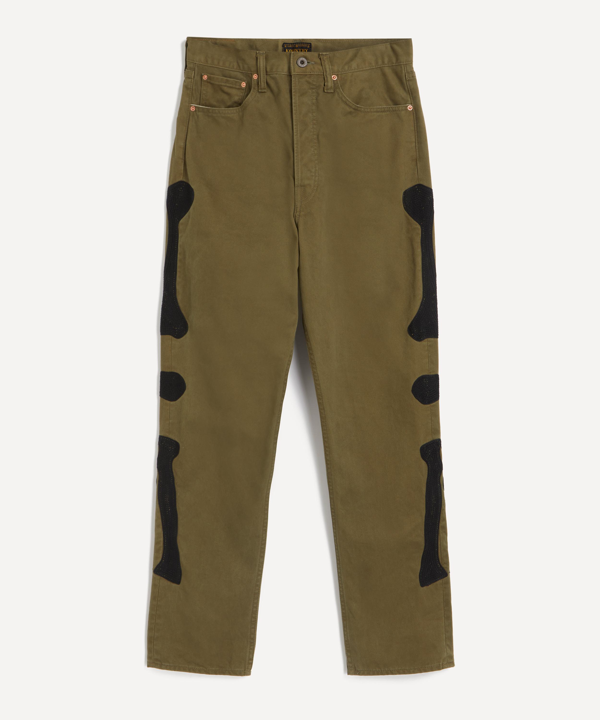 Made in Japan, these khaki chinos feature signature skeleton bone detailing along the sides, inspired by Mexico's 'Day of the Dead' celebration. Crafted from durable cotton twill, they offer a classic straight fit and include a buckled back tab for an adjustable, customisable fit.
