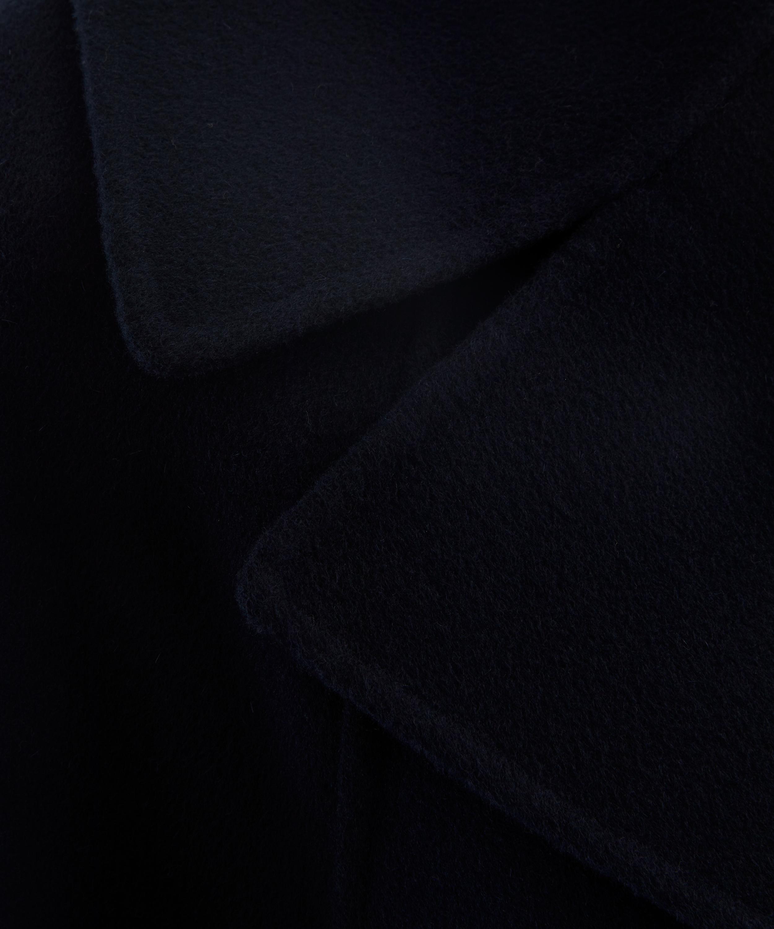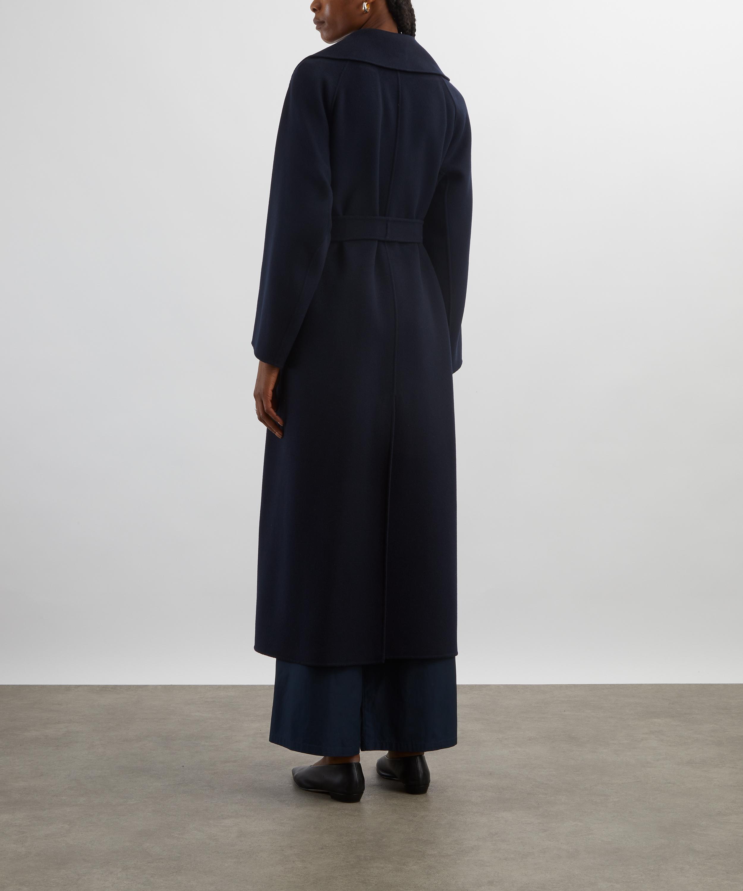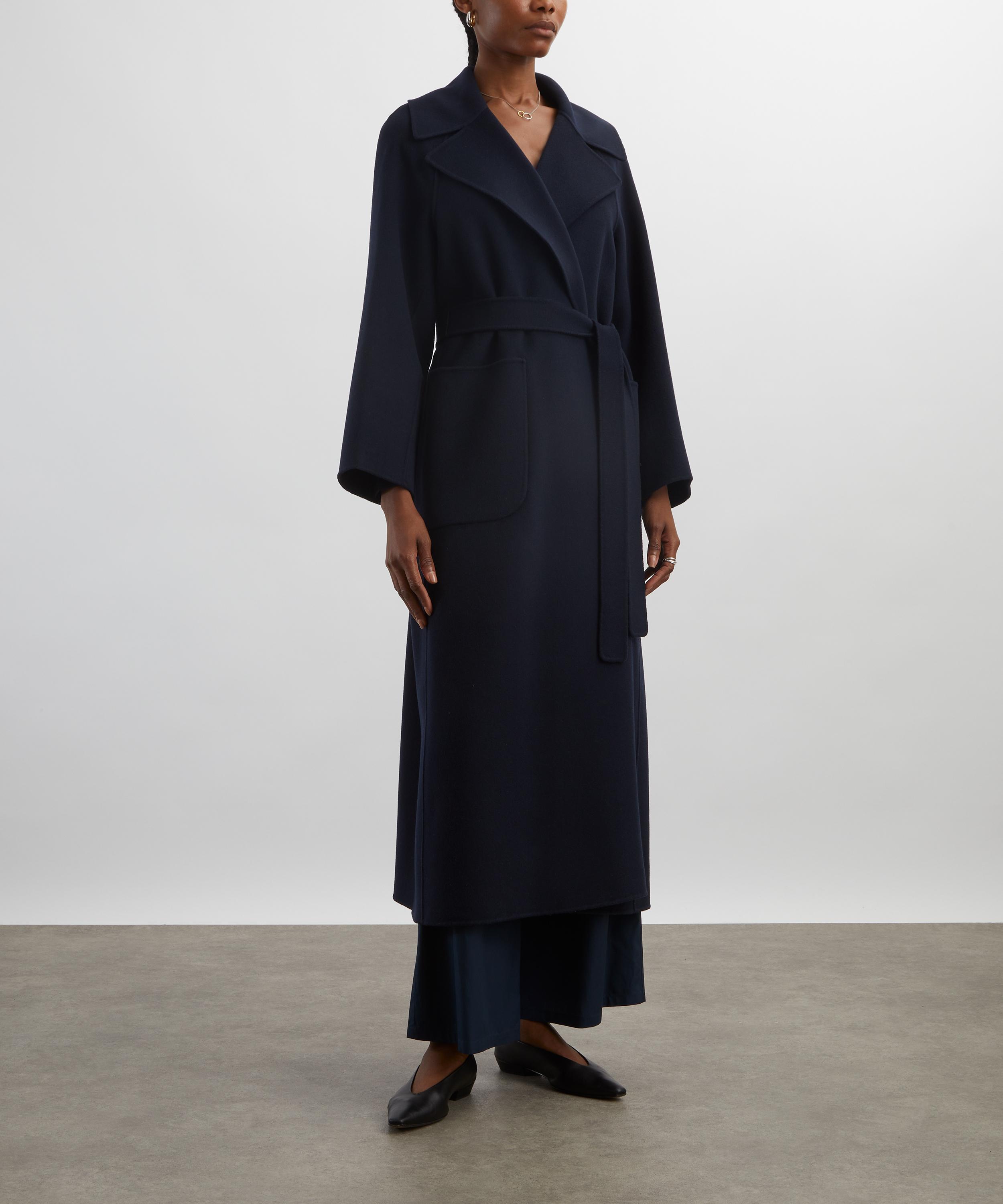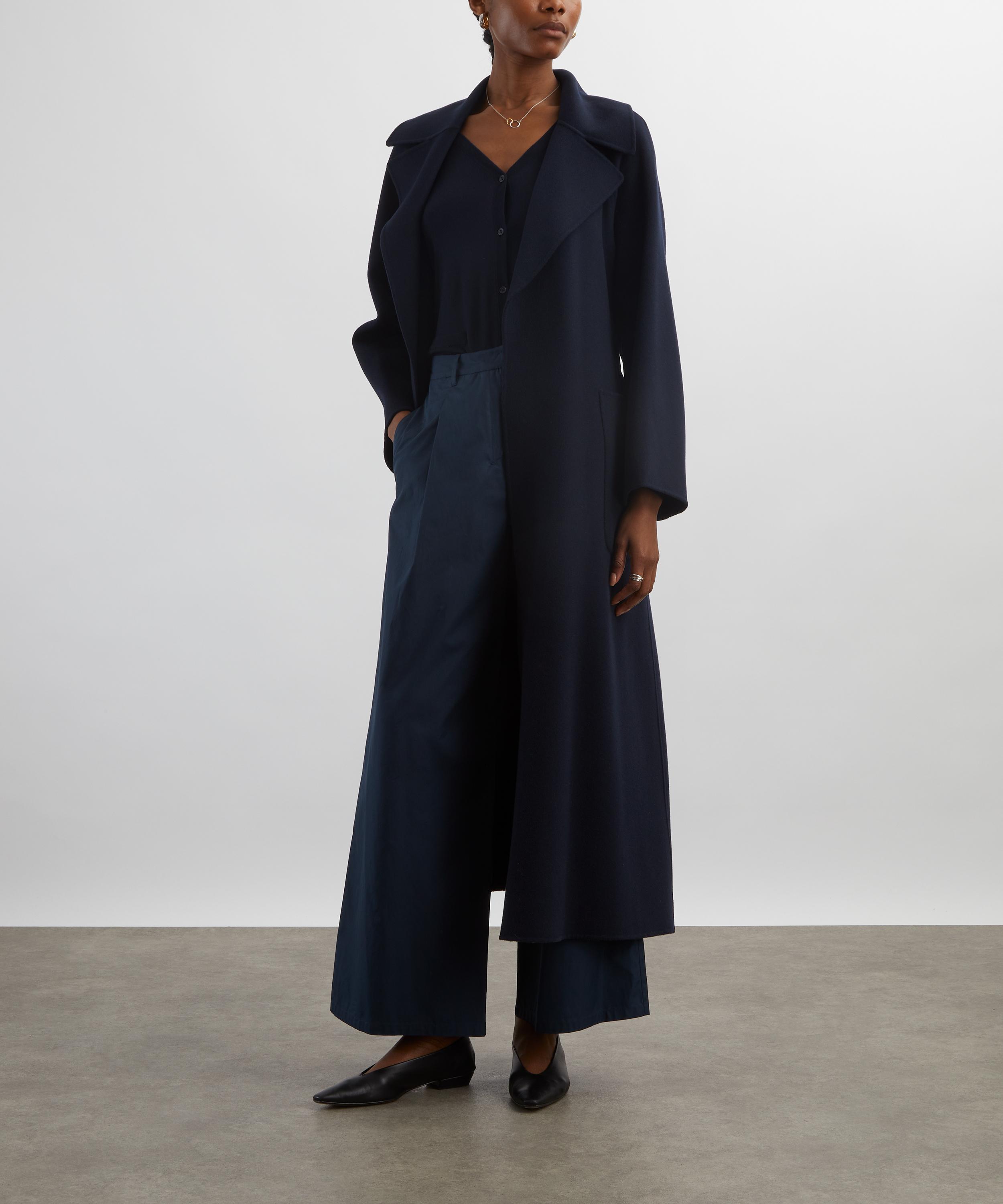 Crafted from double-faced virgin wool, this long coat exudes effortless sophistication with its wraparound silhouette. Featuring a wide lapel collar and long raglan sleeves, it’s cinched at the waist with an adjustable belt for a refined, tailored finish.