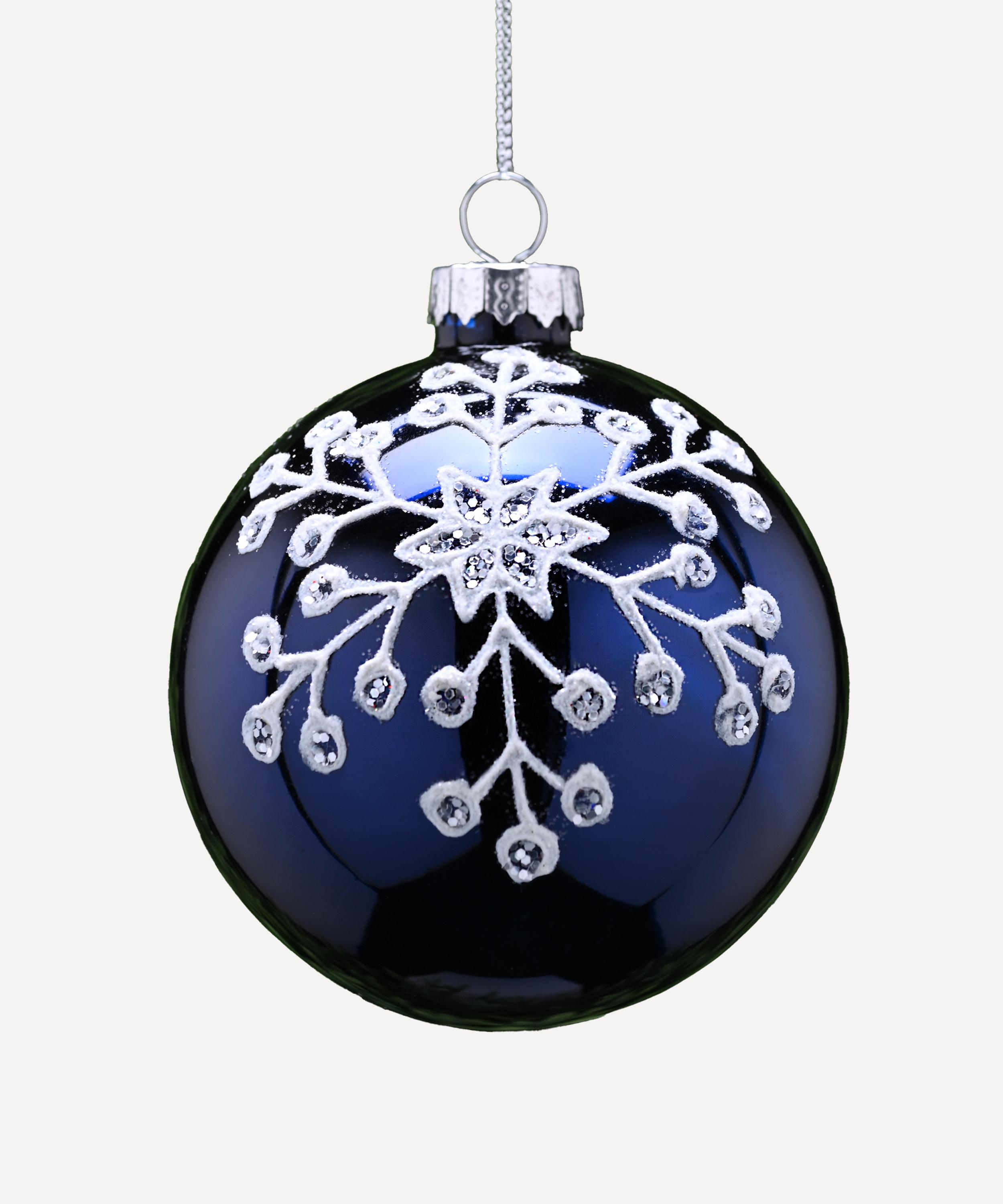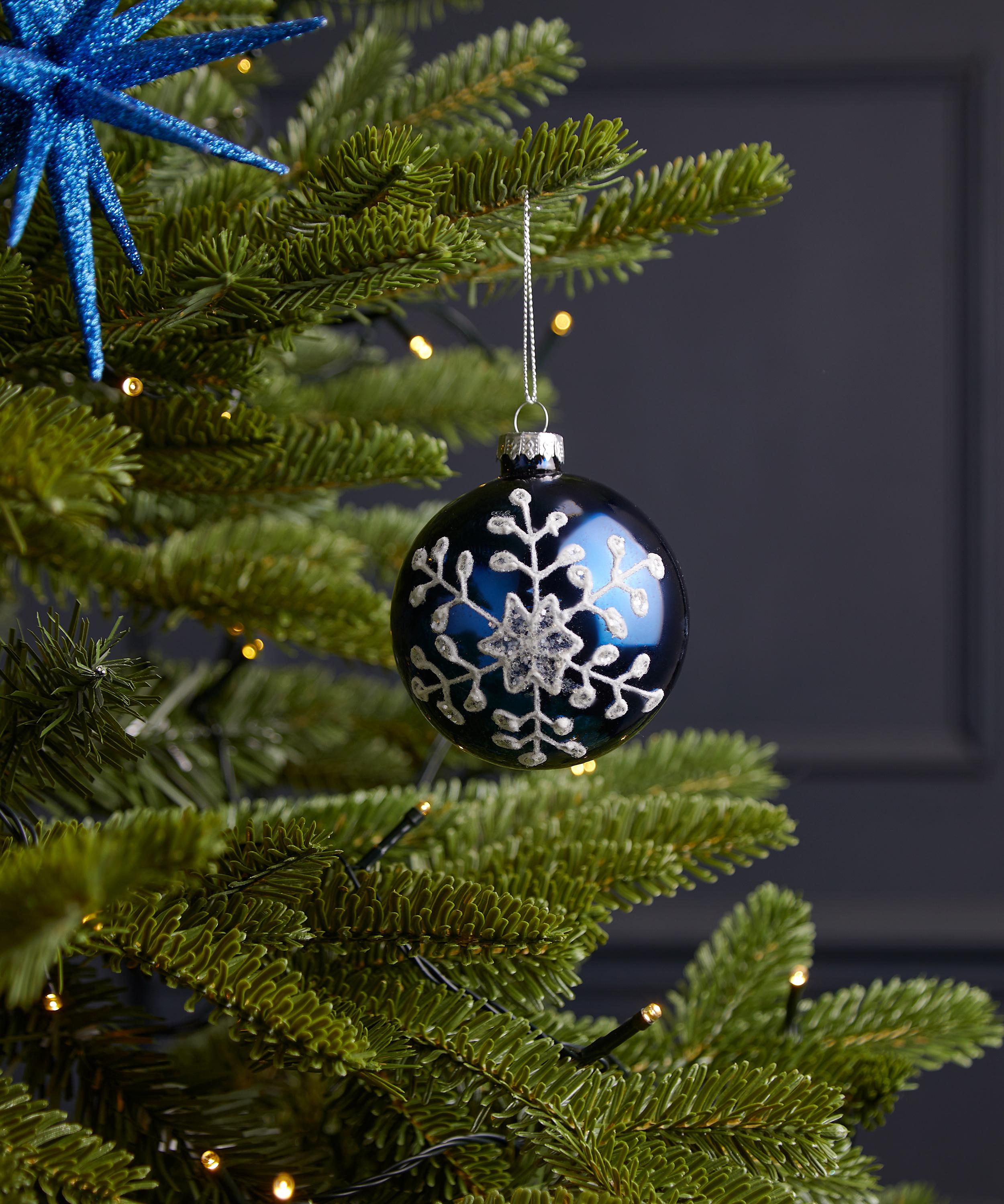 Adorn your festive décor with the timelessly elegant Midnight Blue Snowflake bauble, embellished with silver glitter detailing to add opulence.