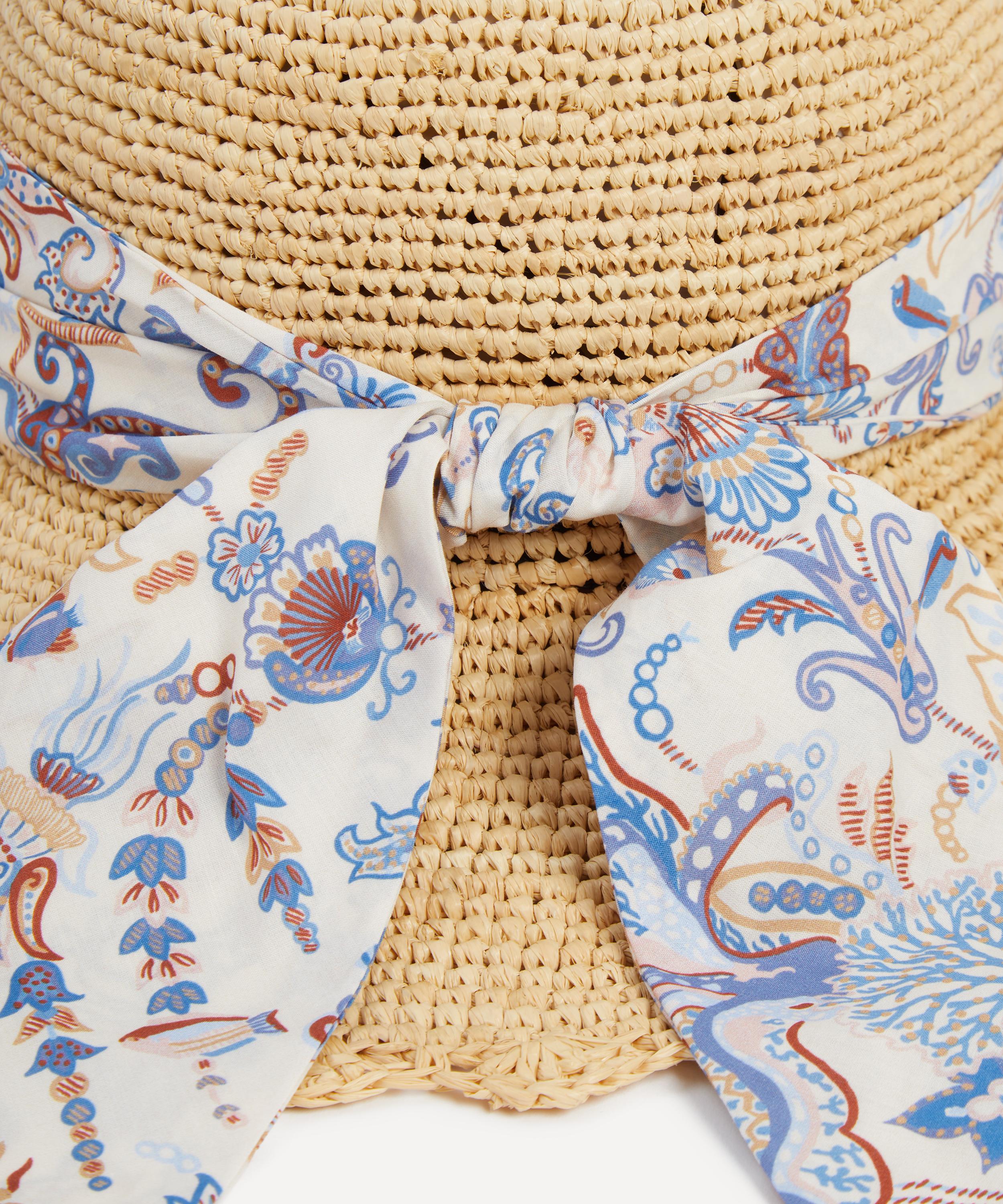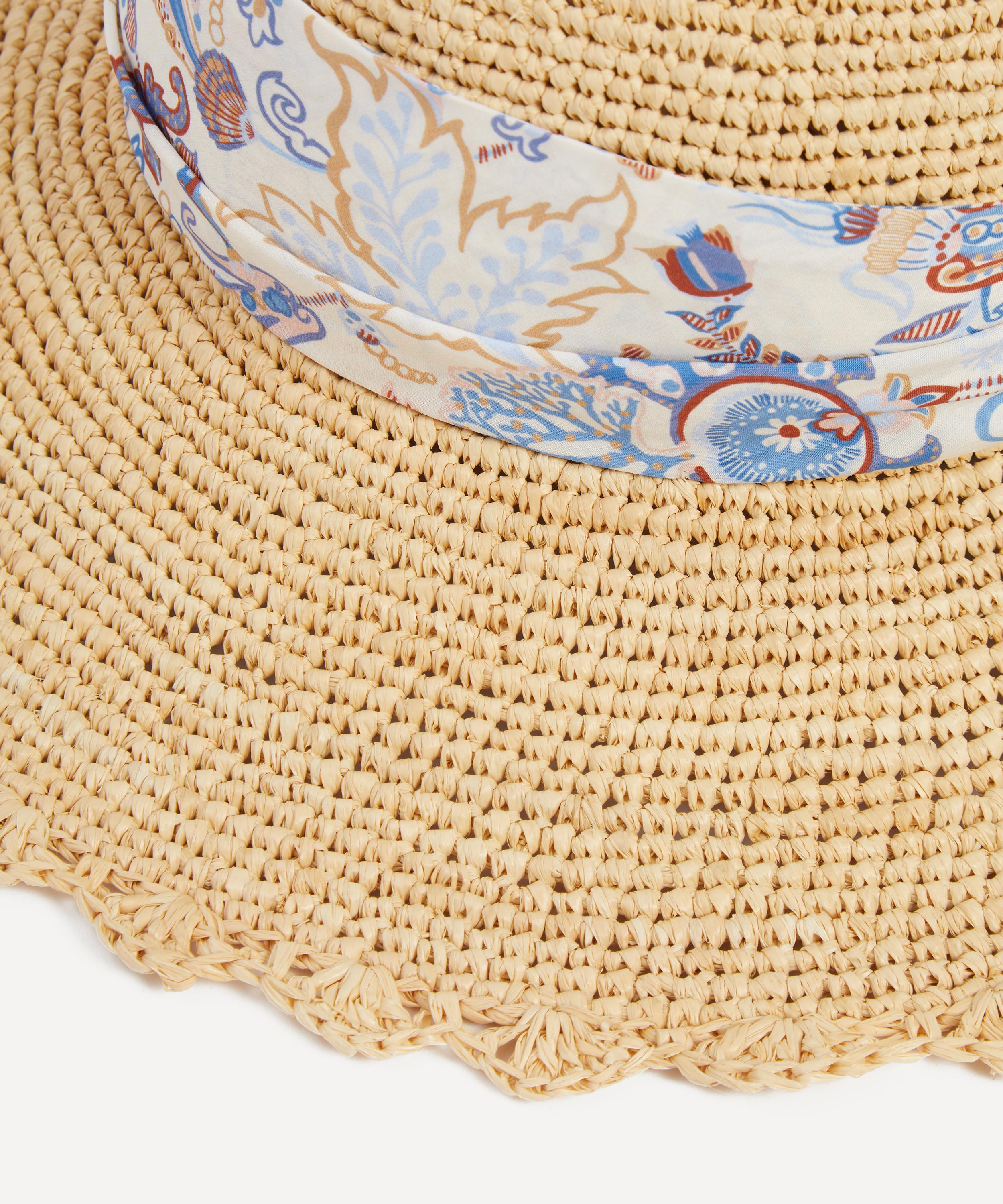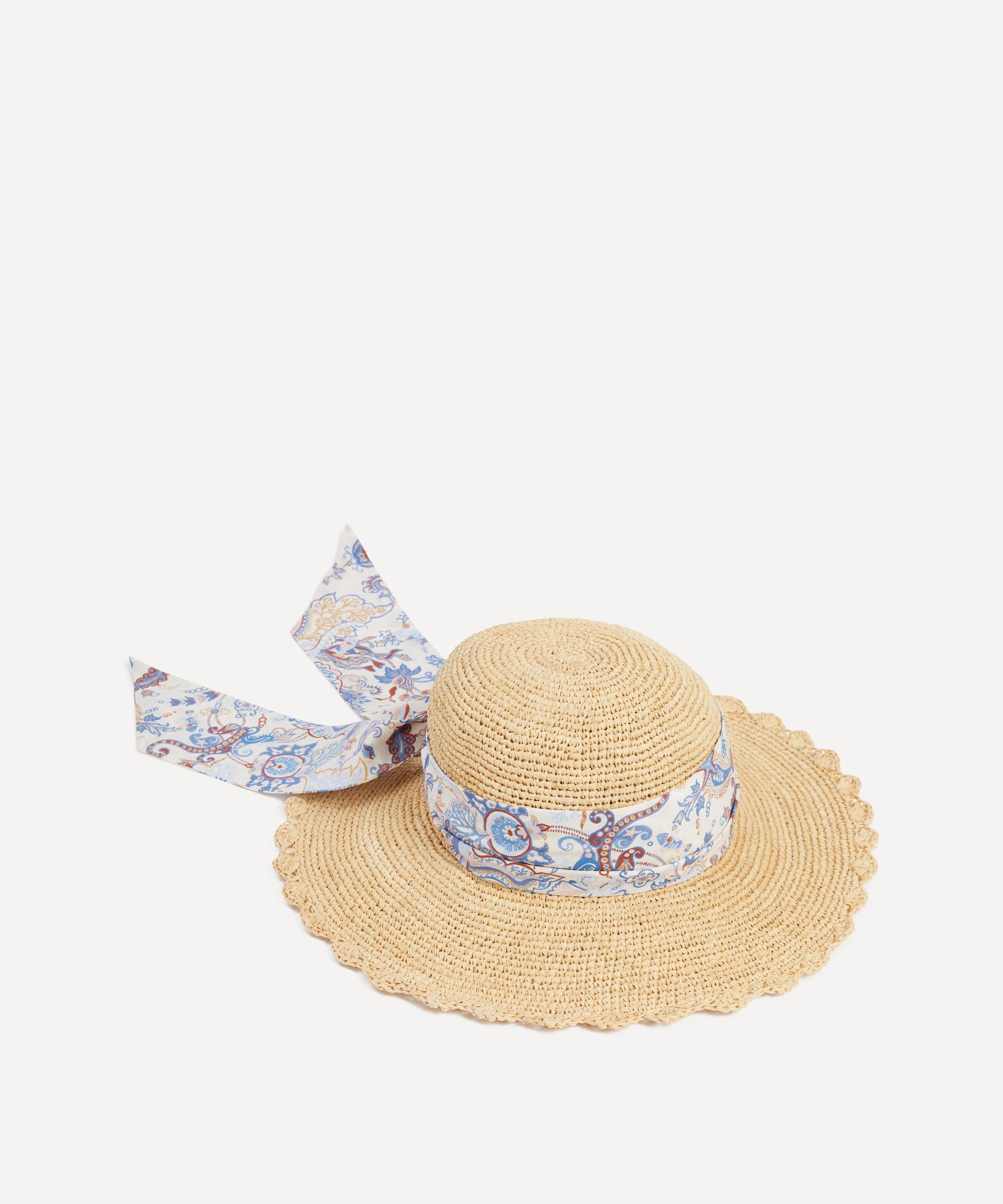 Lending a bohemian sprit and a touch of French elegance to any ensemble, this chic hat has been hand-woven entirely from raffia by skilled artisans, and is complete with a charming scalloped edge and Liberty print ribbon.