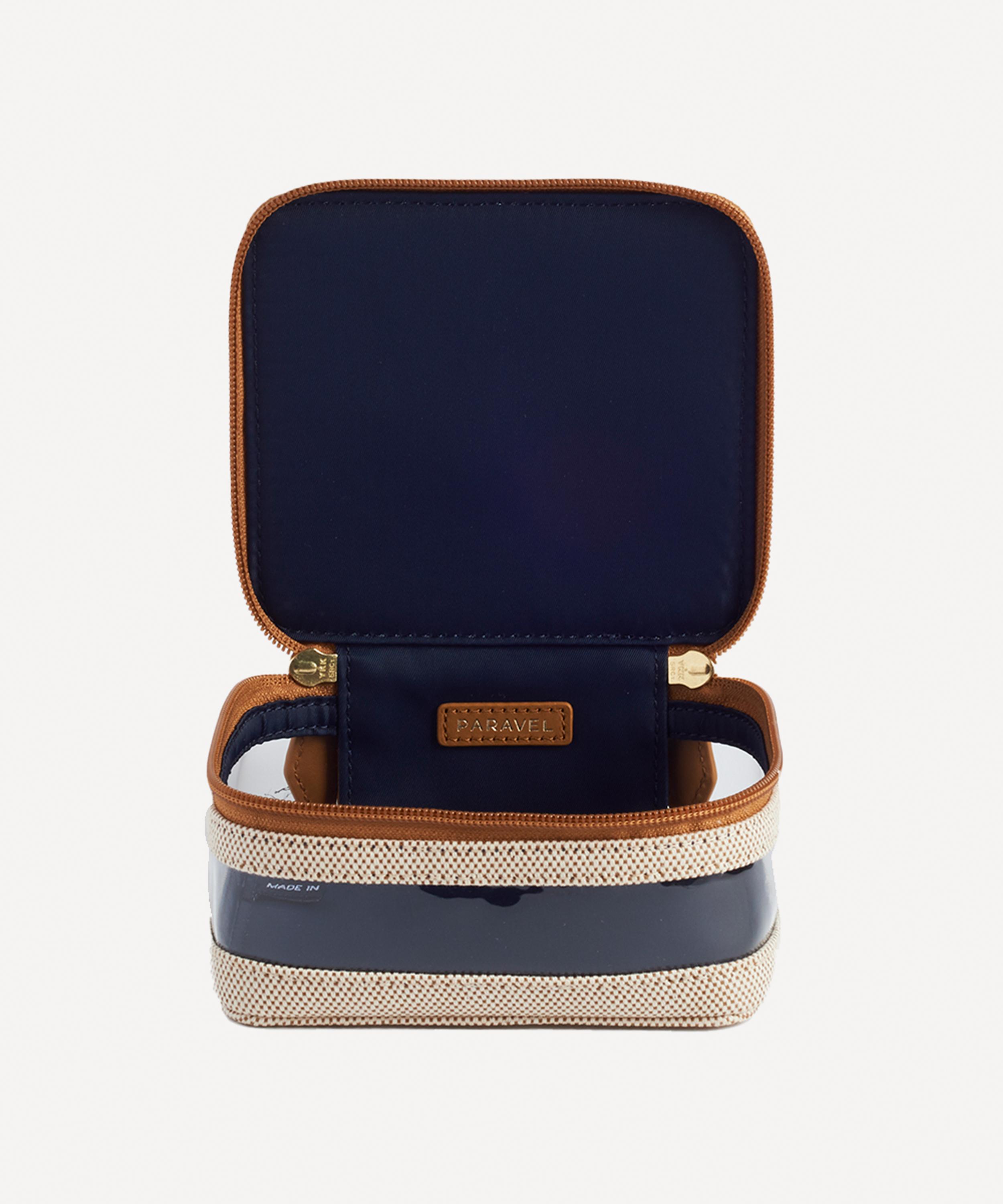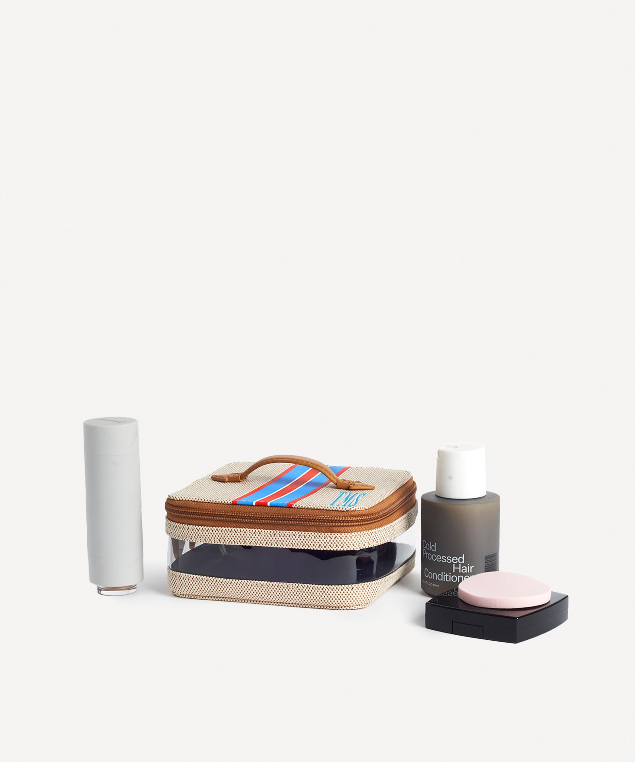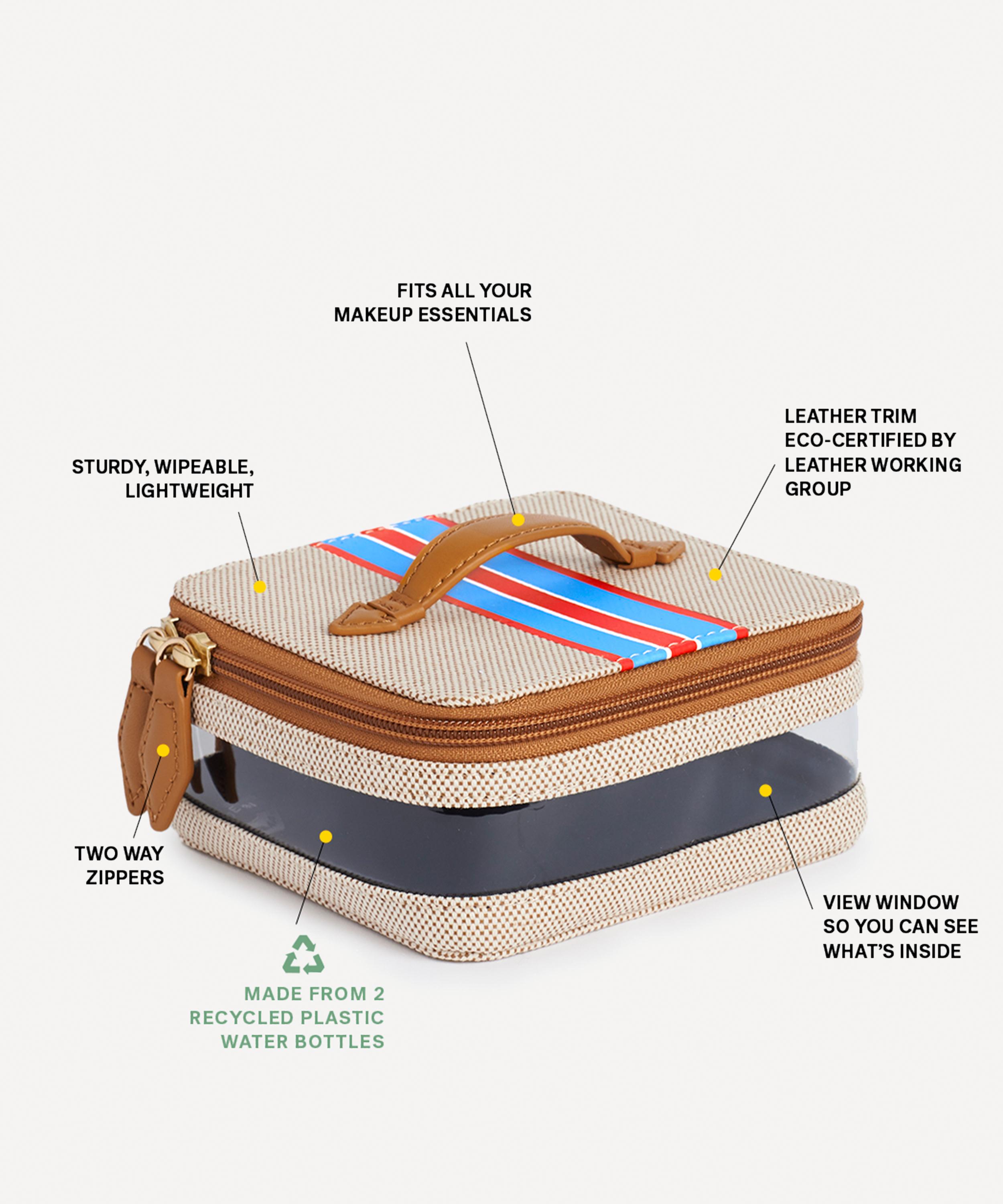 A timeless style crafted from long-lasting, innovative recycled and eco-friendly materials, the Mini Cabana See All Vanity Case boasts Scout Tan recycled vegan leather details and an Ecocraft canvas exterior made from four upcycled plastic bottles. Elegant and extraordinarily functional, speed-through airport security with its transparent view panel. Big enough to store all your essentials, it's finished with a water and stain resistant, eco-friendly coating and the brand’s signature Paloma striped trim running across its top. This practical and polished case adds an effortless touch of sophistication to your travel edit no matter where you go.