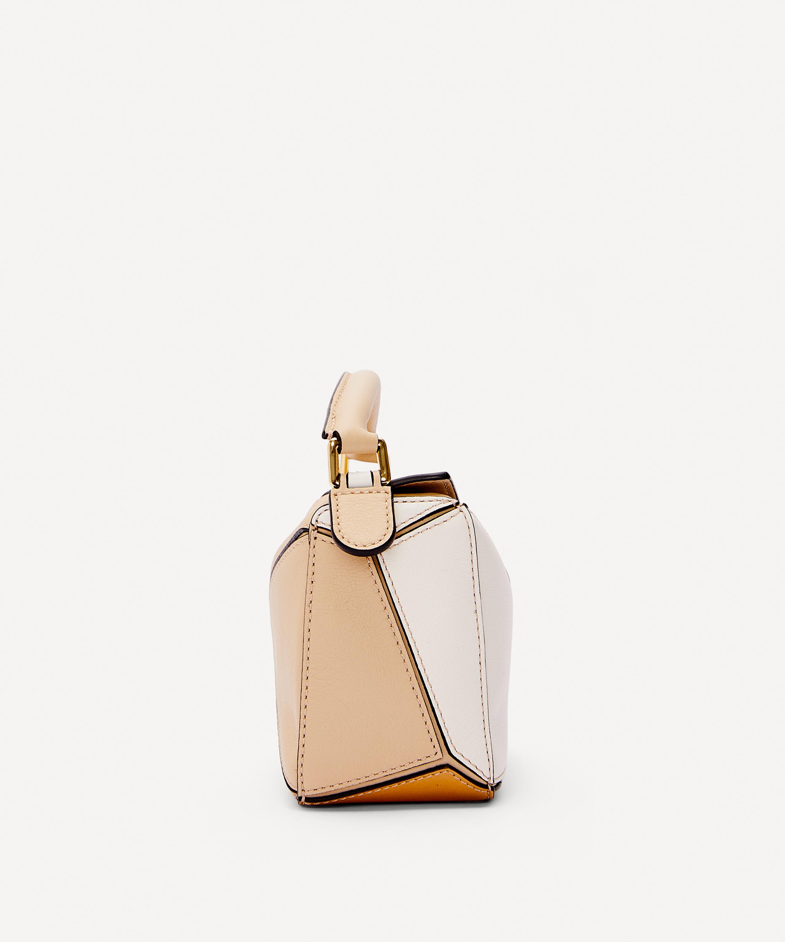 Cut from smooth calfskin leather, Loewe's Puzzle bag is characterised by a boxy cuboid silhouette that can be folded in several different ways thanks to the precisely cut geometric panels across the exterior. This miniature version features a top zip fastening with an oversized zip pull and the brand's distinctive Anagram logo debossed at the front. Complete with a short top handle and an optional shoulder strap, it can be worn across the body, over the shoulder or even folded down flat for an artful alternative to your usual clutch bag.