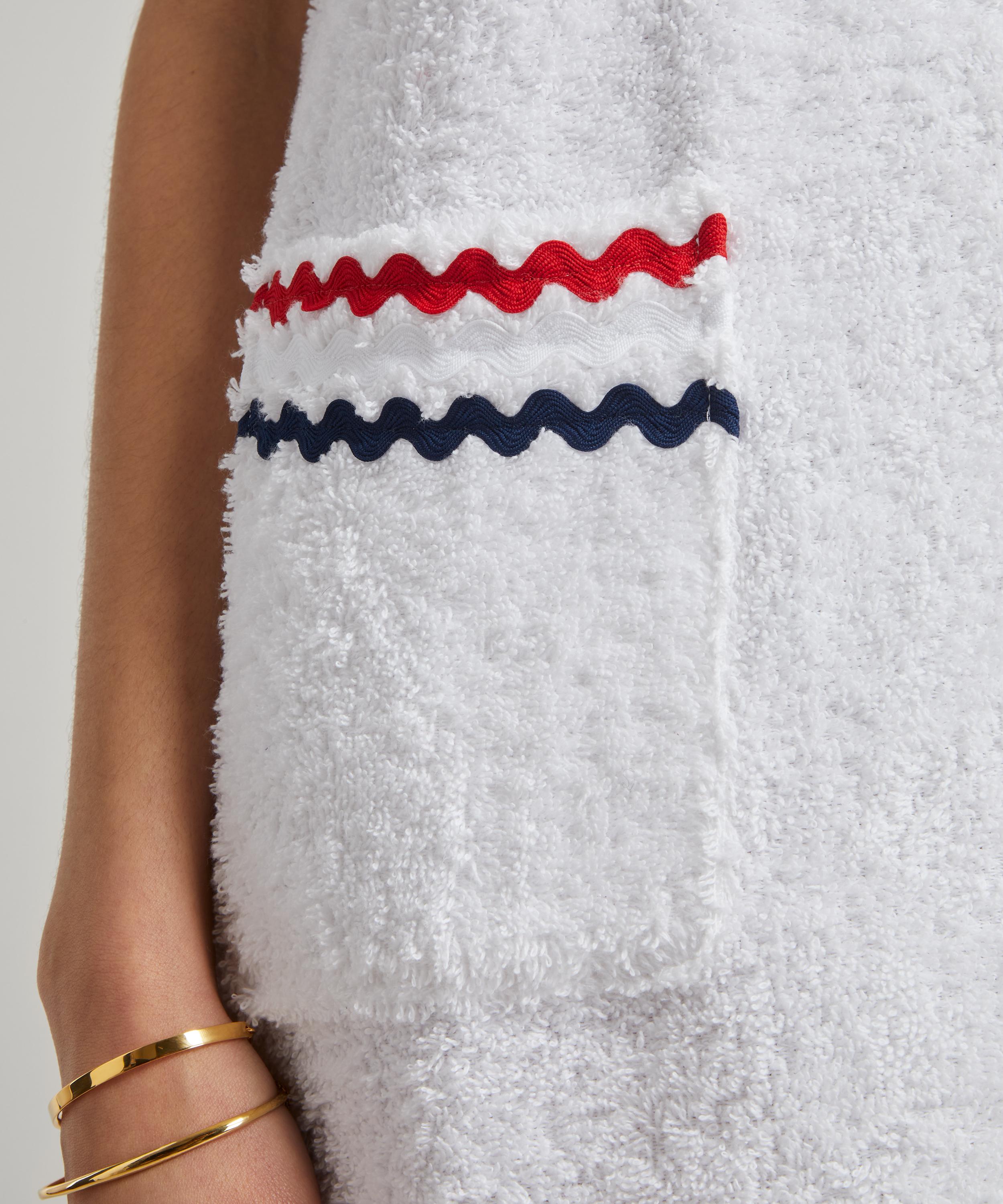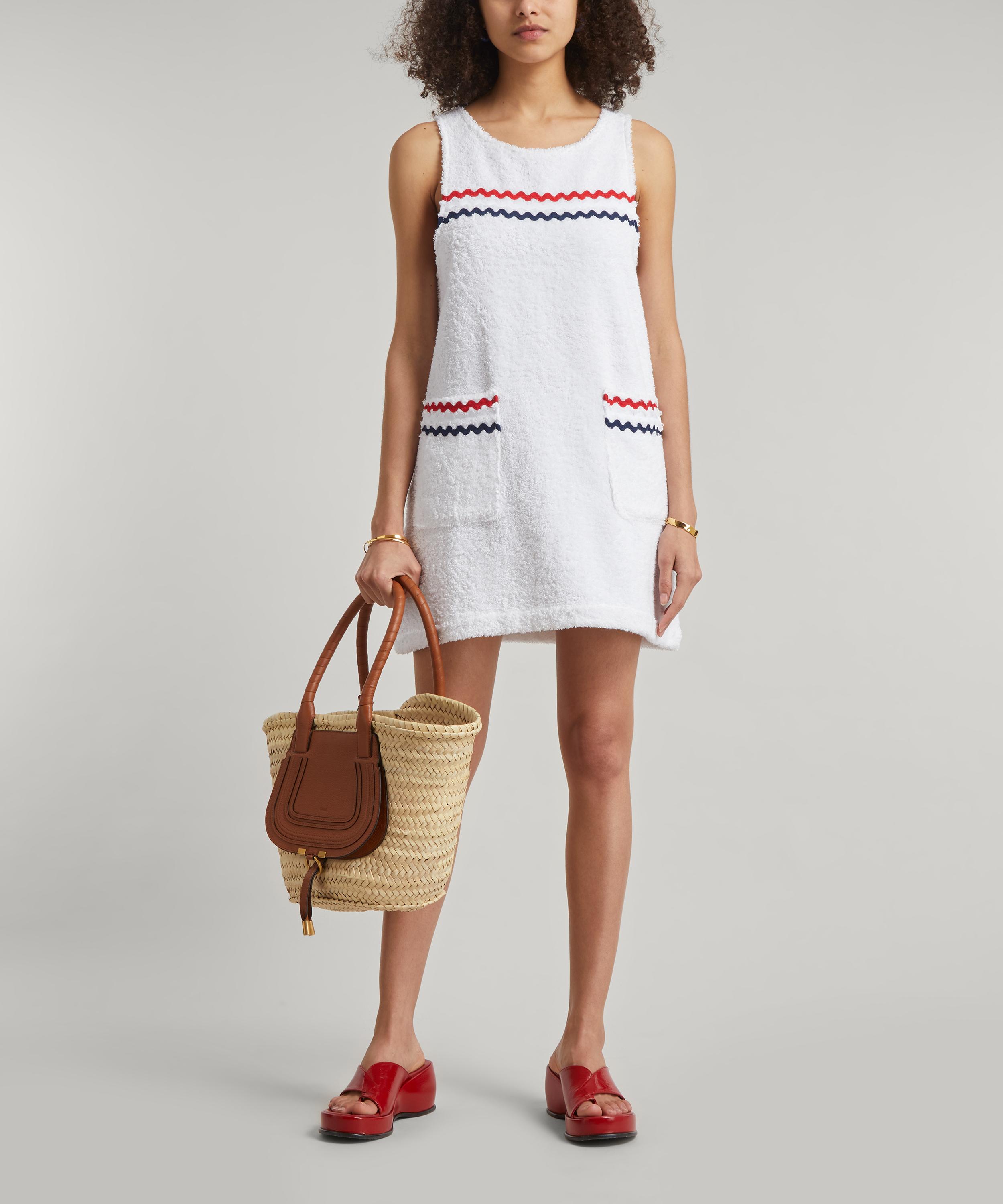 A Spanish label with a French name, La Veste is coveted by the fashion set for their eclectic vintage-inspired aesthetic. The Towel dress has a retro edge reminiscent of 1970s poolside glamour with its plush, pure cotton terrycloth composition. Cut to a charming mini-length with an elegant scoop-neckline, this simple shift dress is finished with a decorative blue and red rig-rag trim across its chest and front patch-pockets. Pair it with slip-on sandals and a statement straw-bag for effortlessly sophisticated swim-ready style.