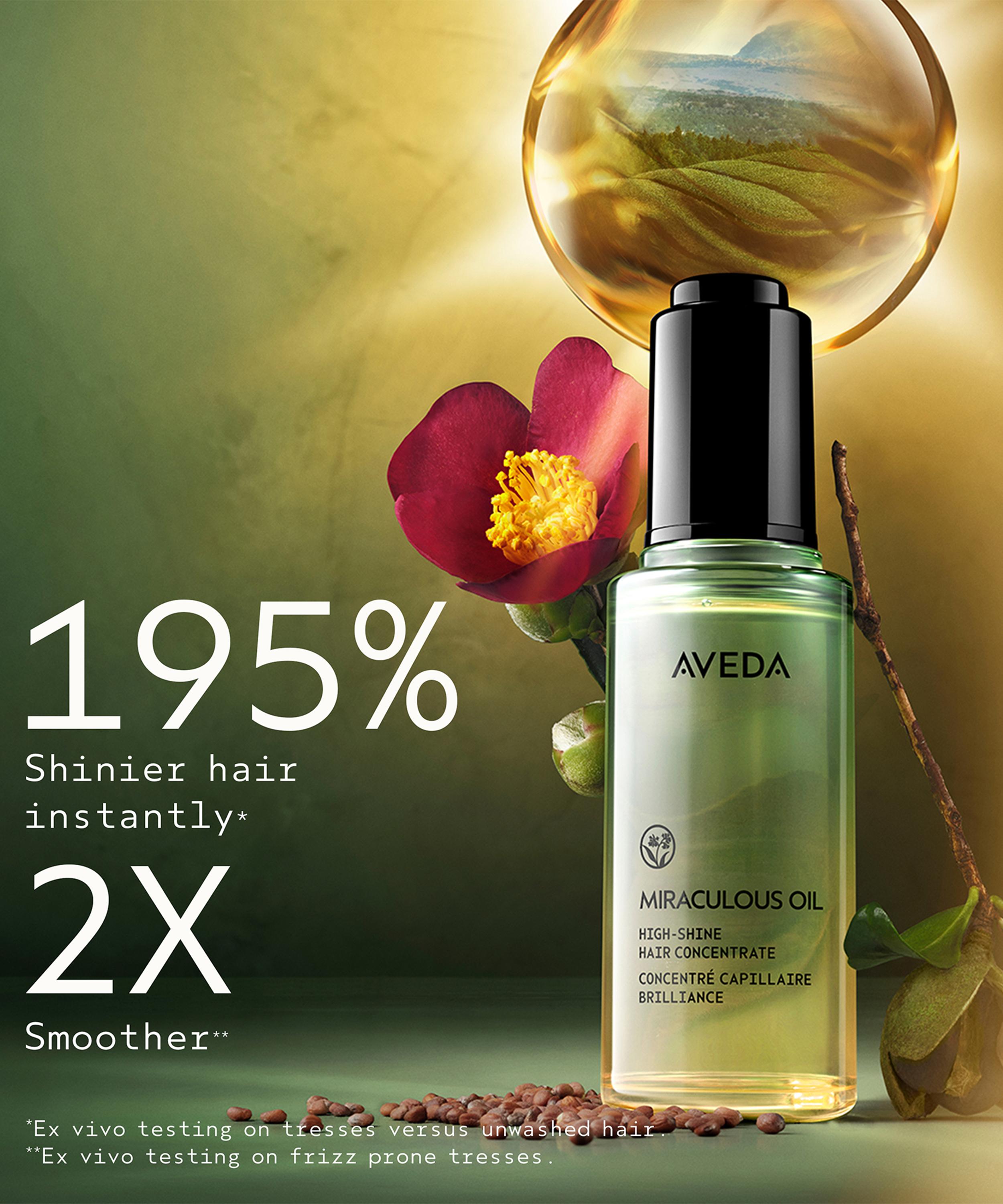 Wrap hair in a weightless veil of radiant shine with Aveda’s Miraculous Oil High-Shine Hair Concentrate, a deeply conditioning hair oil for all hair types – infused with the brand's signature calming aroma, it offers an indulgent experience for both your strands and senses.