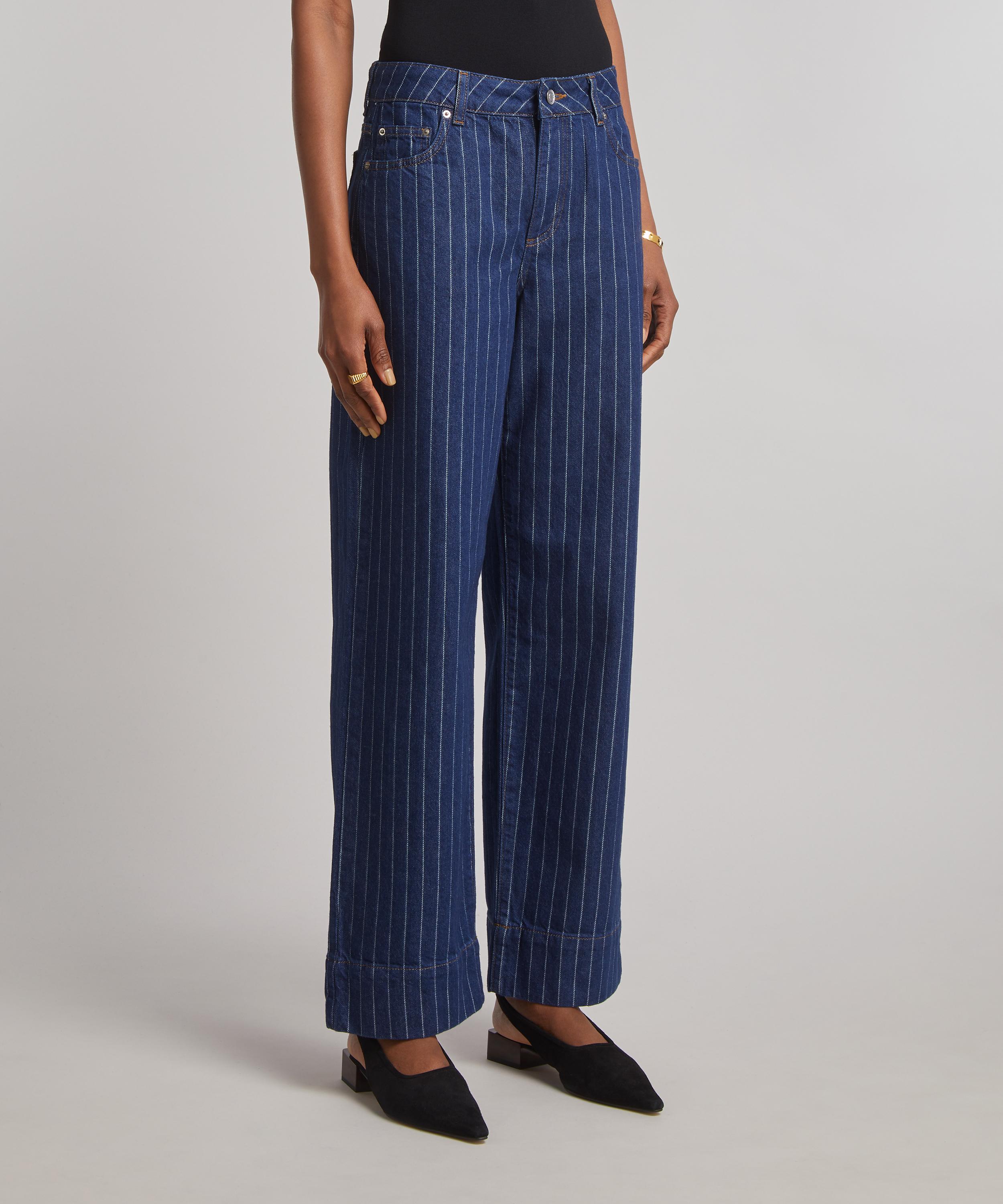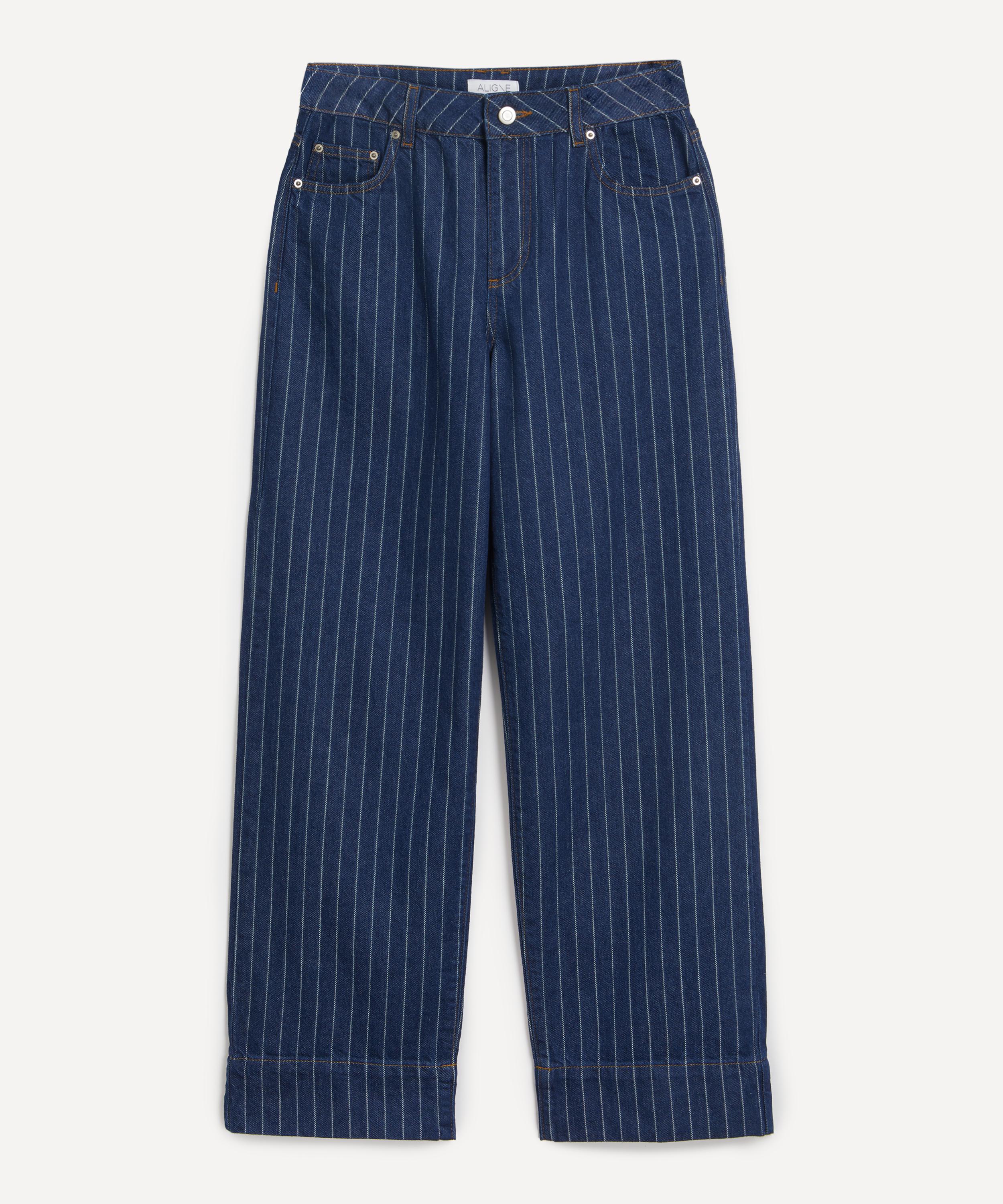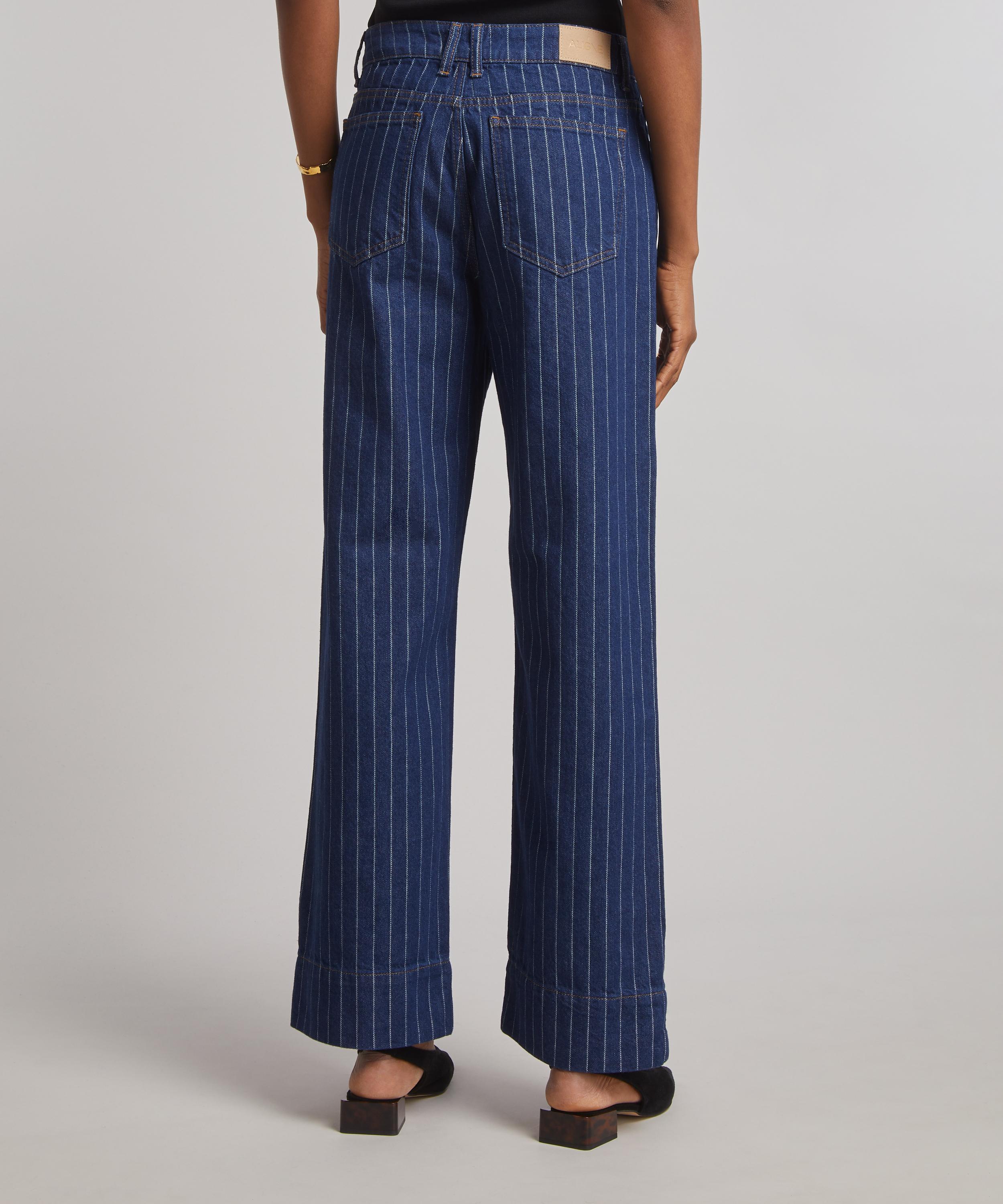 Made from pinstripe denim, these jeans boast a straight leg fit with a mid-rise waist and classic copper stitching. Detailed with a buttoned front and five pocket fit, pair with the Leo waistcoat for a sleek, seasonless look.