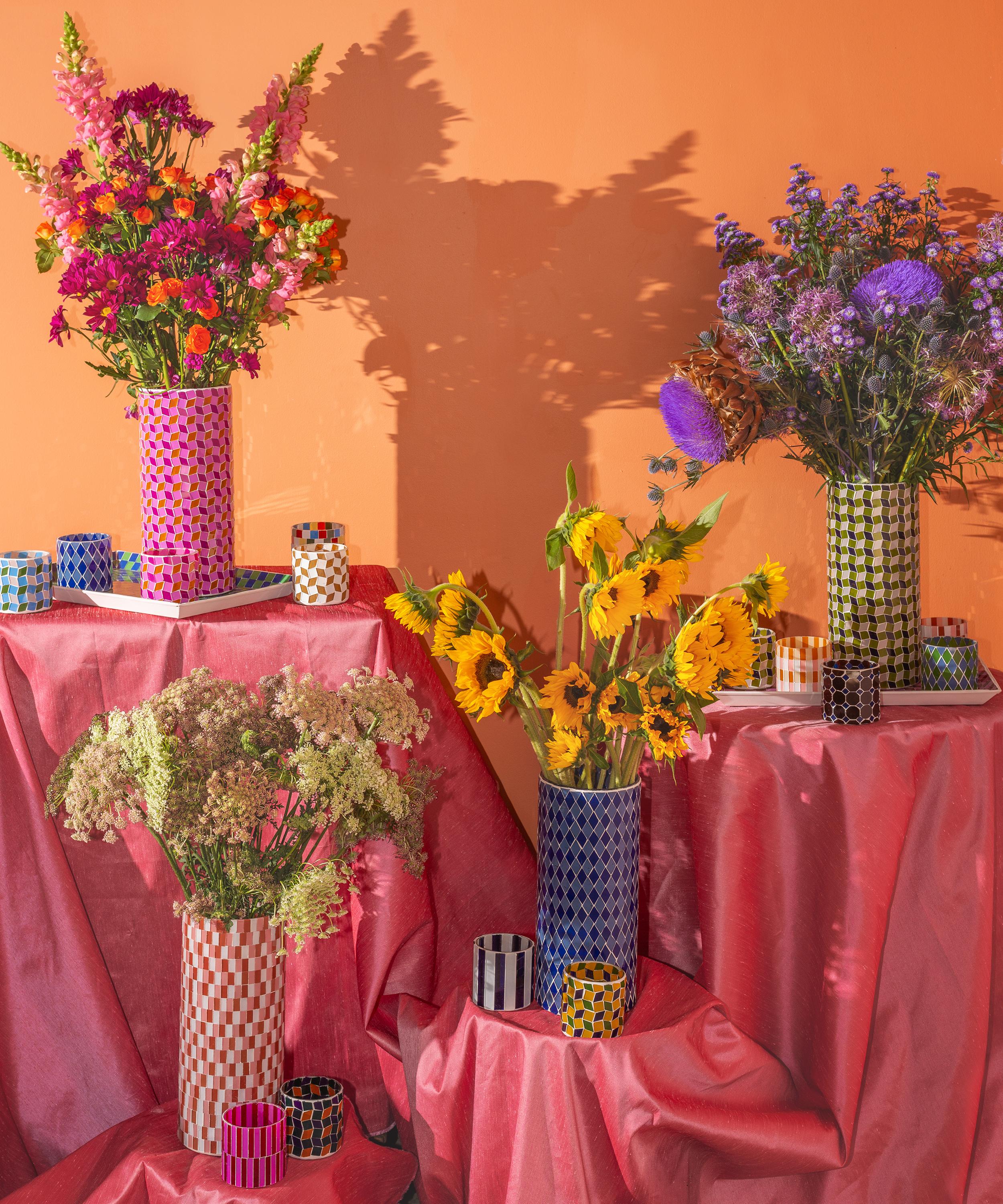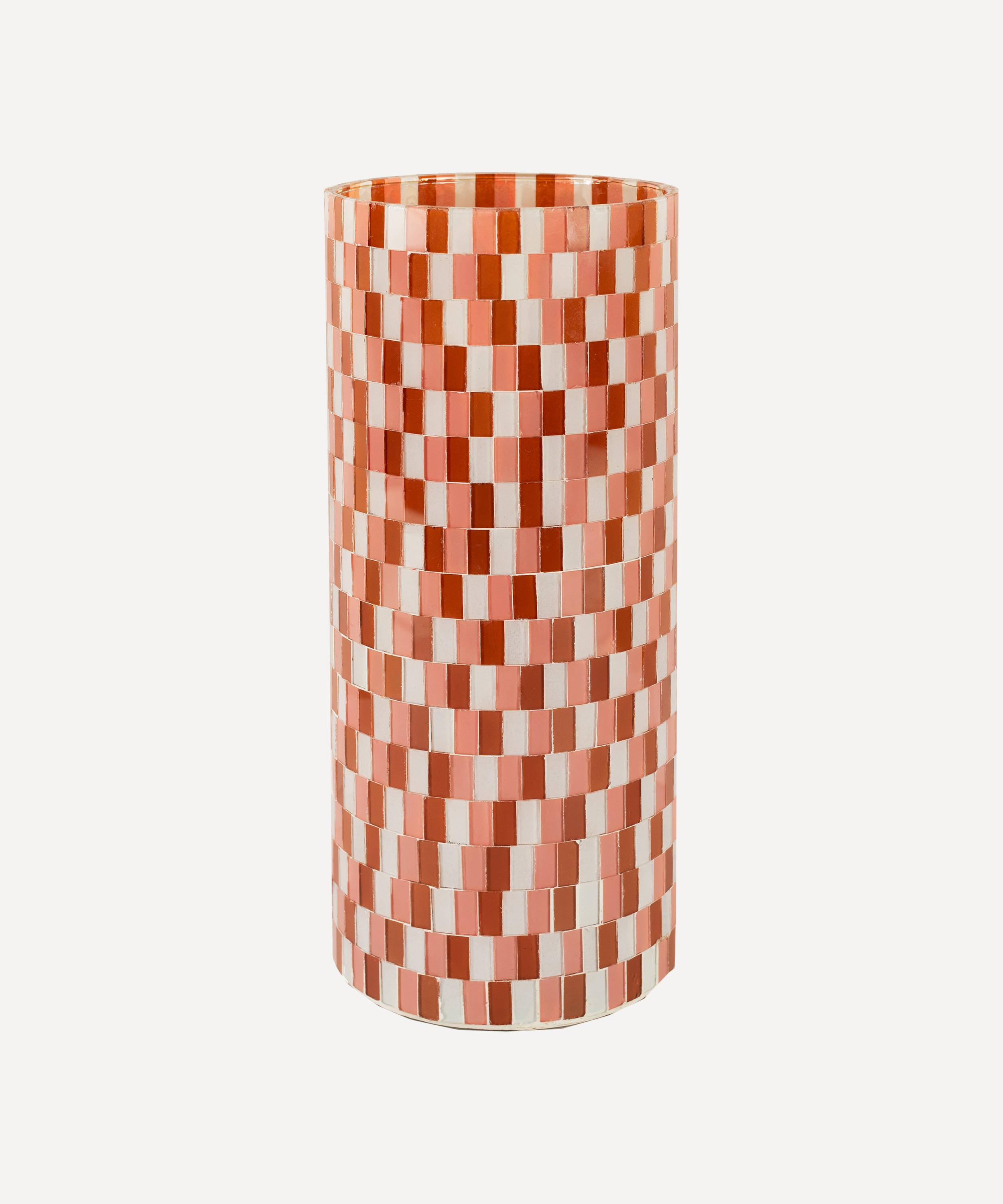 This striking mosaic glass vase presents a charming array of red, white and pink tones, wrapping its tall, cylindrical silhouette in a mesmerising tiled design. Fill with fresh blooms for a wonderful centrepiece or experiment with maximalist styling by pairing with other bold and brightly hued pieces from the brand.