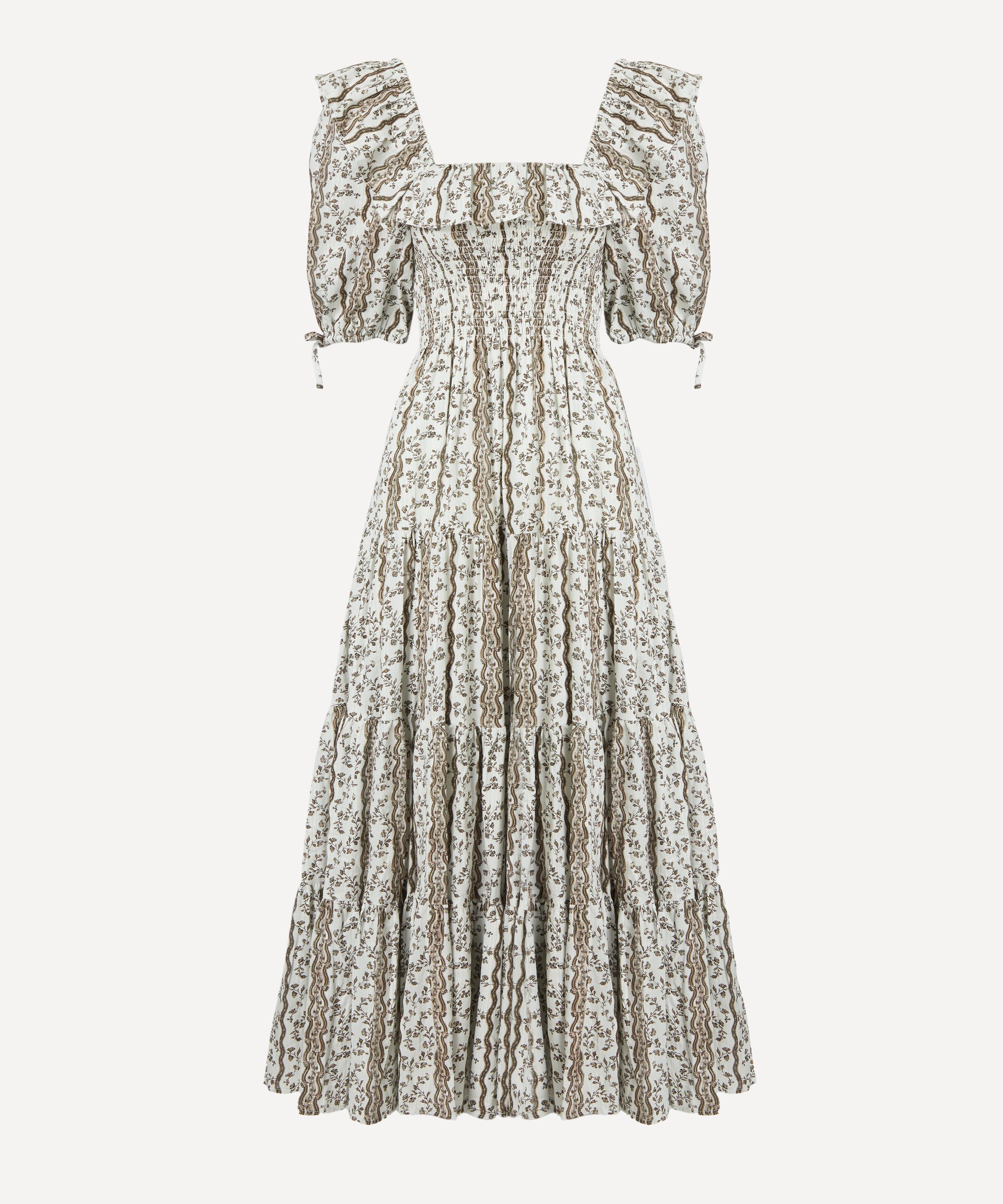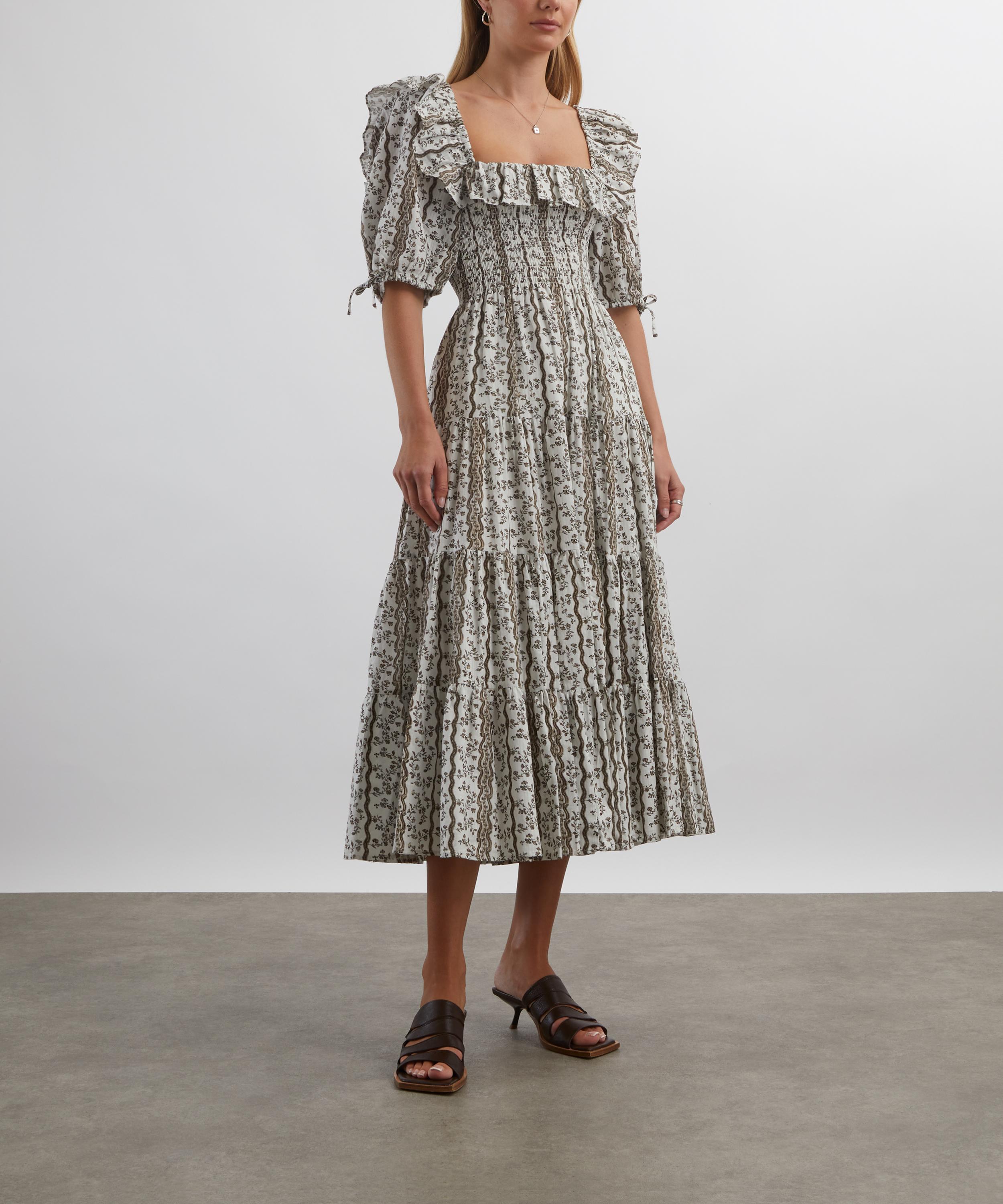 Soft, comfortable and pretty enough to wear from day to night, this sundress is set to become a seasonal staple. Crafted from lightweight cotton presenting a ditsy Provencal floral design, it features a fit-and-flare A-line silhouette consisting of a ruffled square neckline, elasticated Nap smocking, puff sleeves, and a tiered midi skirt. Elegant and easy to wear, it’s finished with a practical pair of pockets.