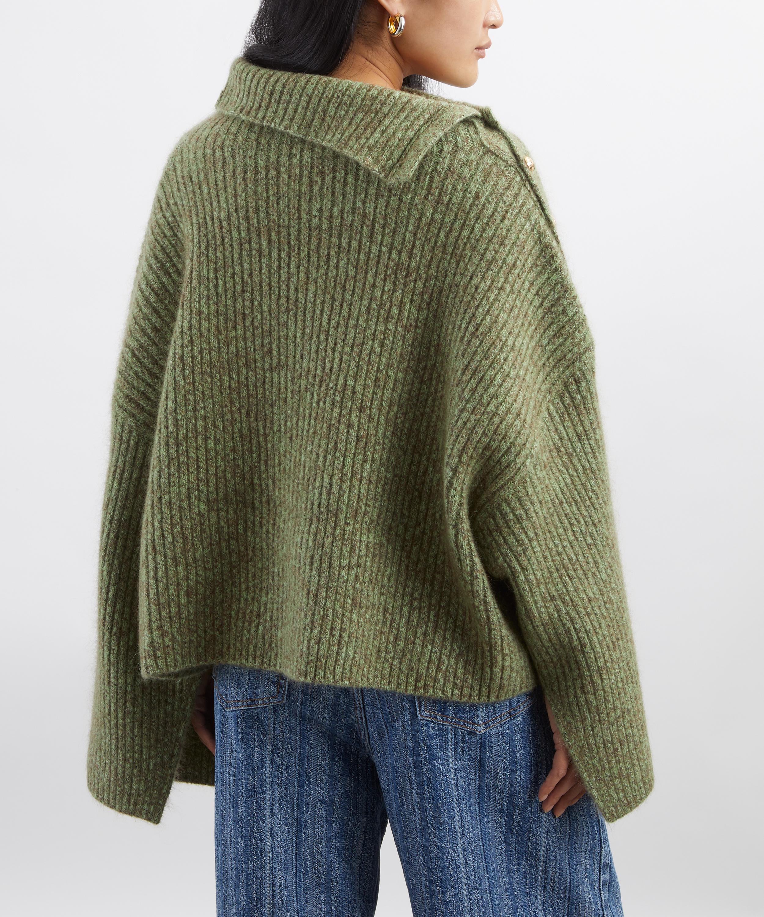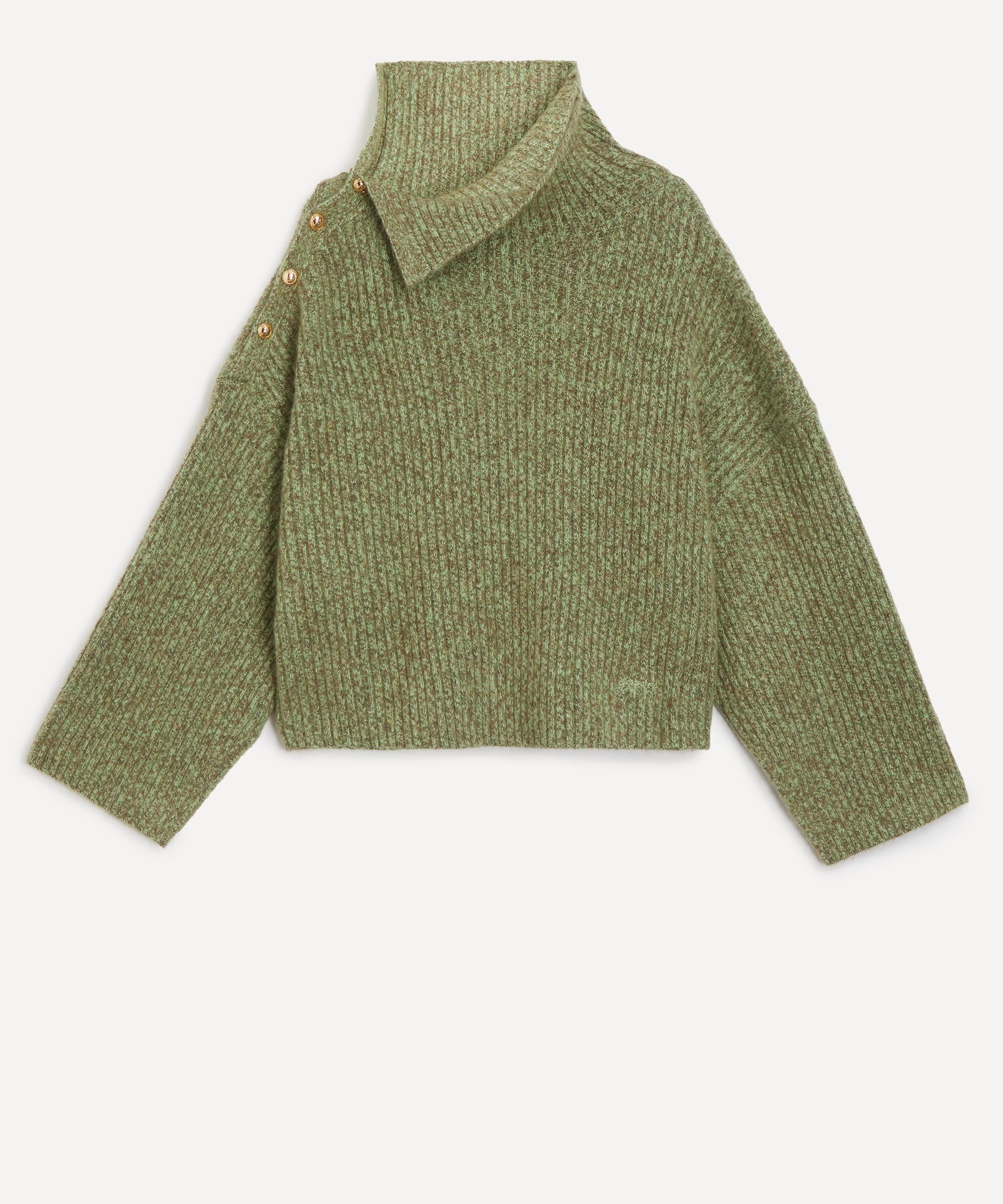 Crafted from a warming knit in a melange colourway, this relaxed fit jumper is characterised by its bold, asymmetrical neckline – secured with gold-tone buttons down one shoulder – and is complete with long sleeves and an embroidered logo detail. Simply pair it with a mini skirt and chunky black boots for a warm, weekend look.