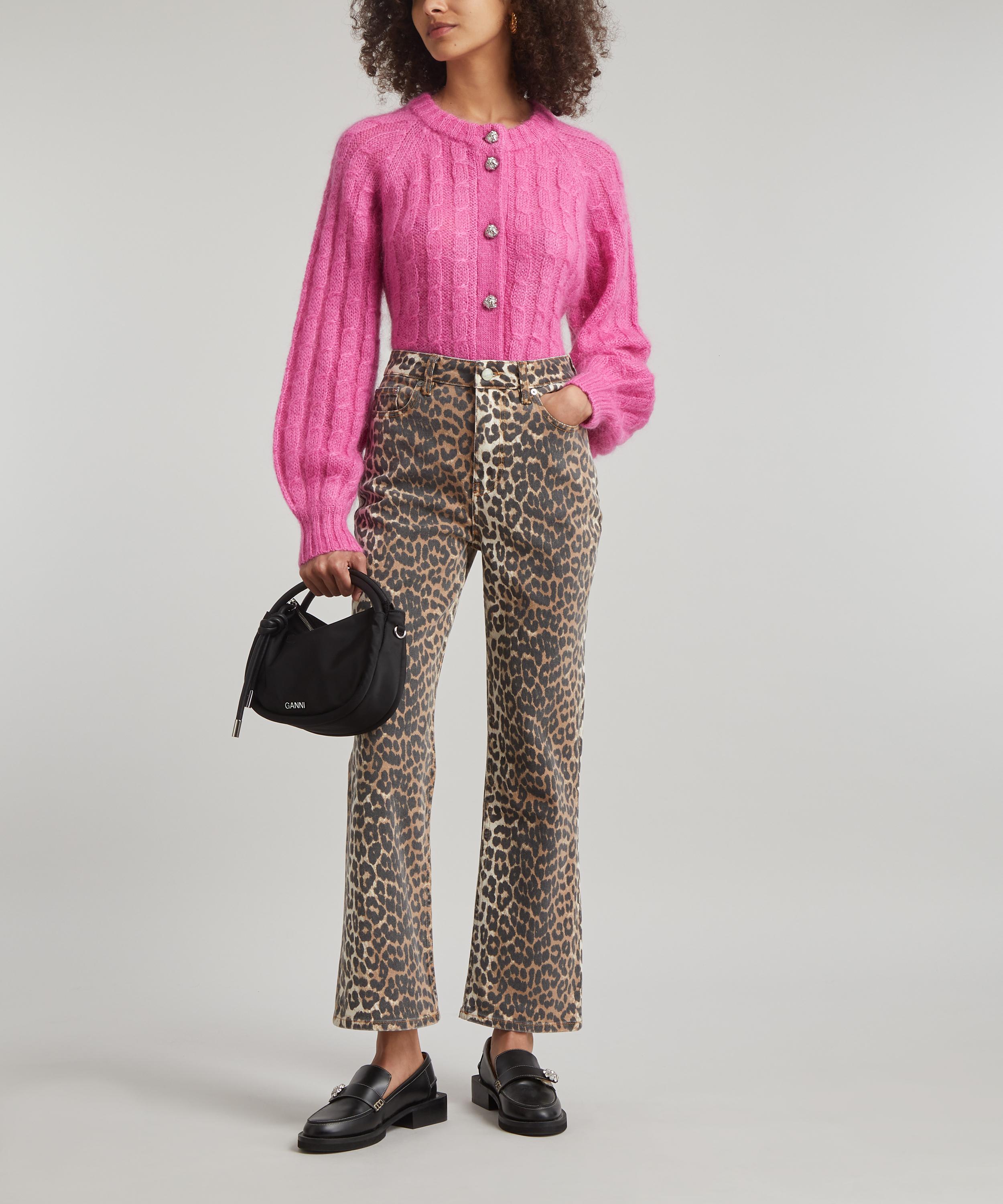 Crafted from a rich, responsibly sourced mohair and Merino wool blend, this relaxed-fitting cardigan with dropped shoulders and slouchy long-sleeves has a chunky cable-knit finish. Cosy and chic, it features a round-neckline with a button-down placket, complete with vintage-style metal buttons. A versatile style fit for all seasons, we love it teamed with Ganni’s punchy leopard print Betzy jeans for a wild and warm weekend edit.