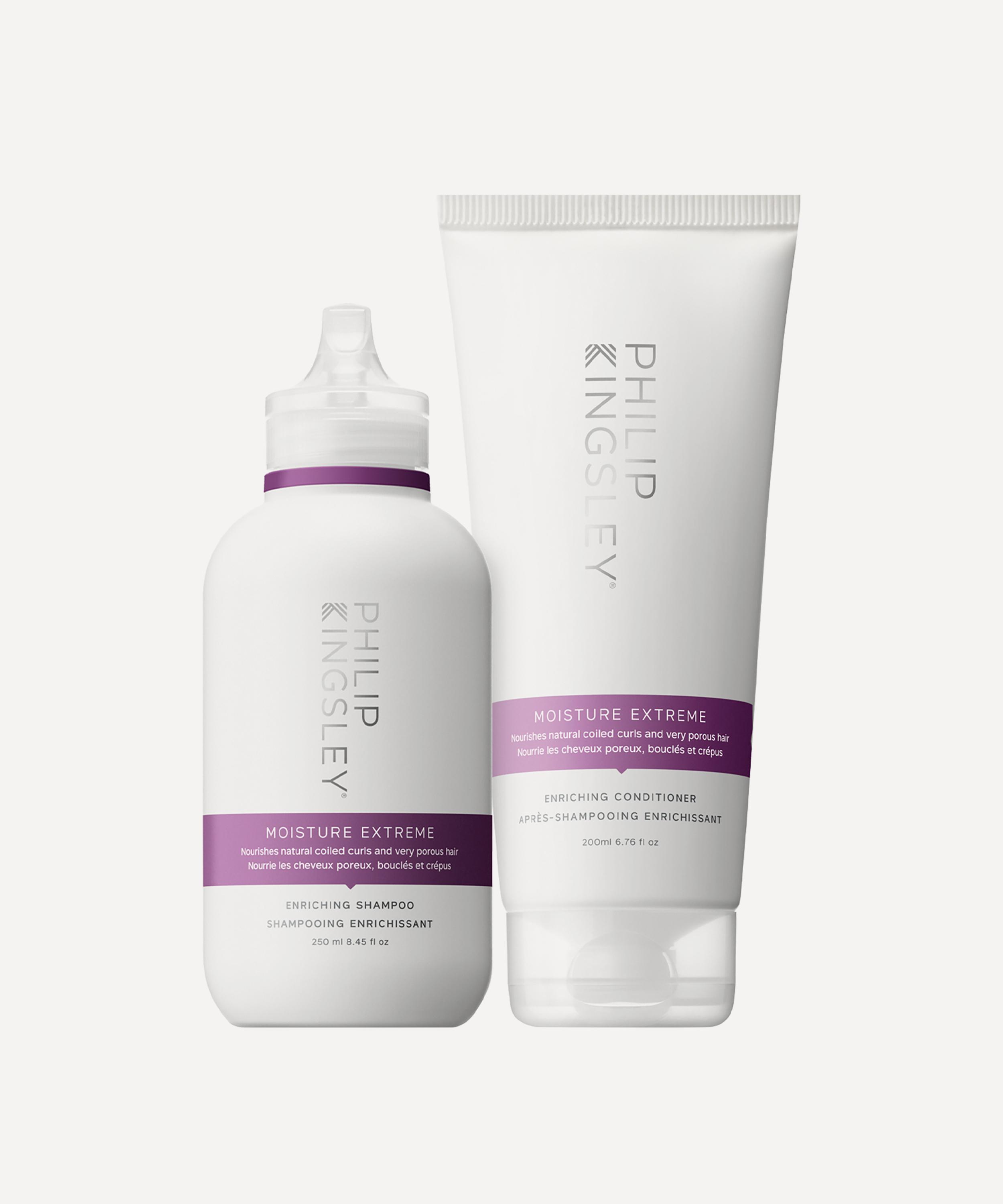 The ultimate hair care regime for naturally coiled, or dry and damaged tresses, the Moisture Extreme Duo from Philip Kingsley showcases a deeply nourishing shampoo and conditioner.