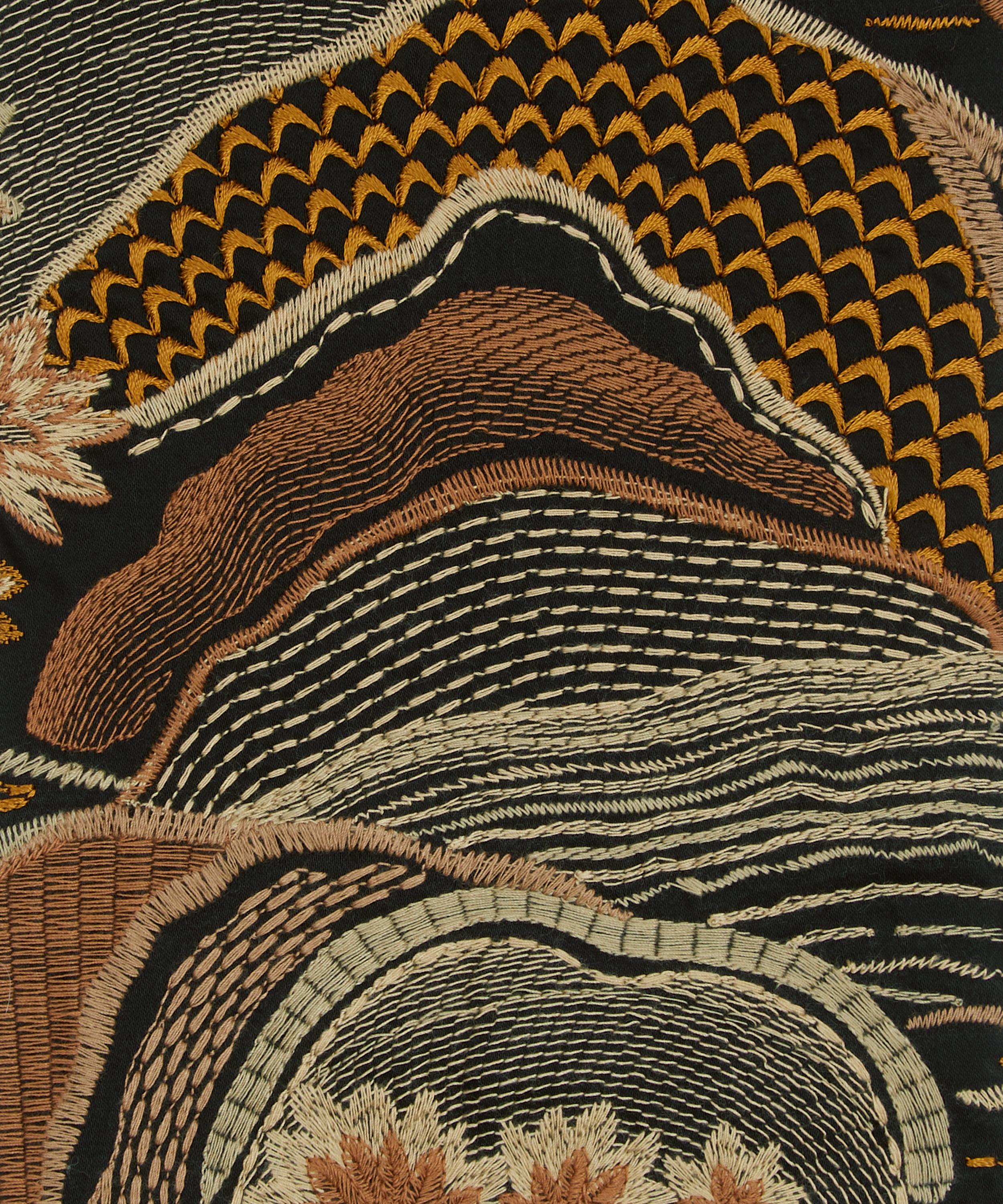 Densely embroidered in two colourways, with matte and soft sheen yarns, this atmospheric scene is suitable for drapery, cushions, and accessories.