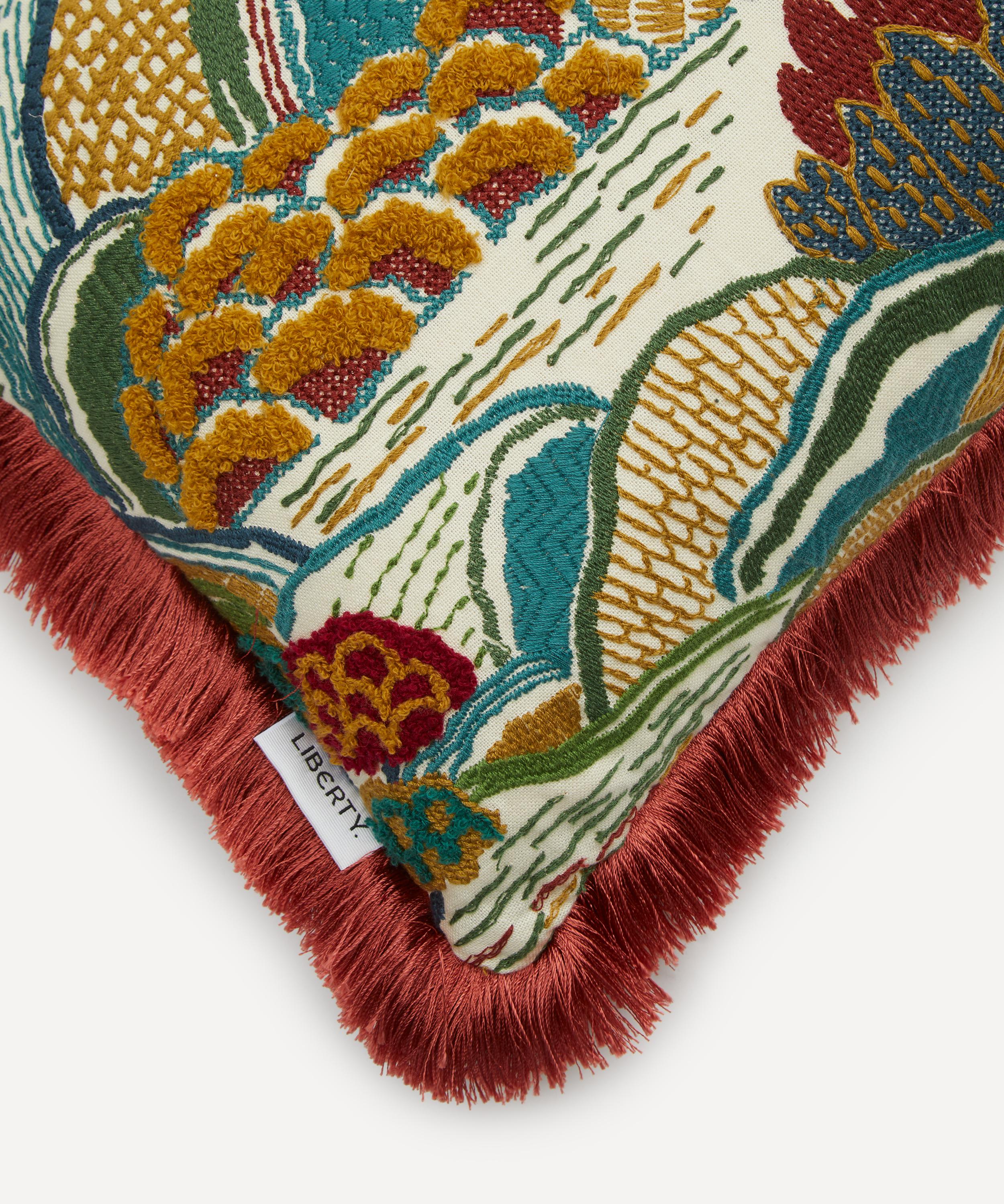 This Liberty square cushion features our Mount Stitch print and is decadently soft with a plump recycled duck feather filling. Created in the Liberty design studio, Mount Stitch – inspired by Japanese mountainscapes and ancient forests– appears here in a beautifully engineered iteration, complete with a fringed edge for an immaculate finish. The cushion’s classic silhouette and richly hued palette add an elegant twist to modern interiors.