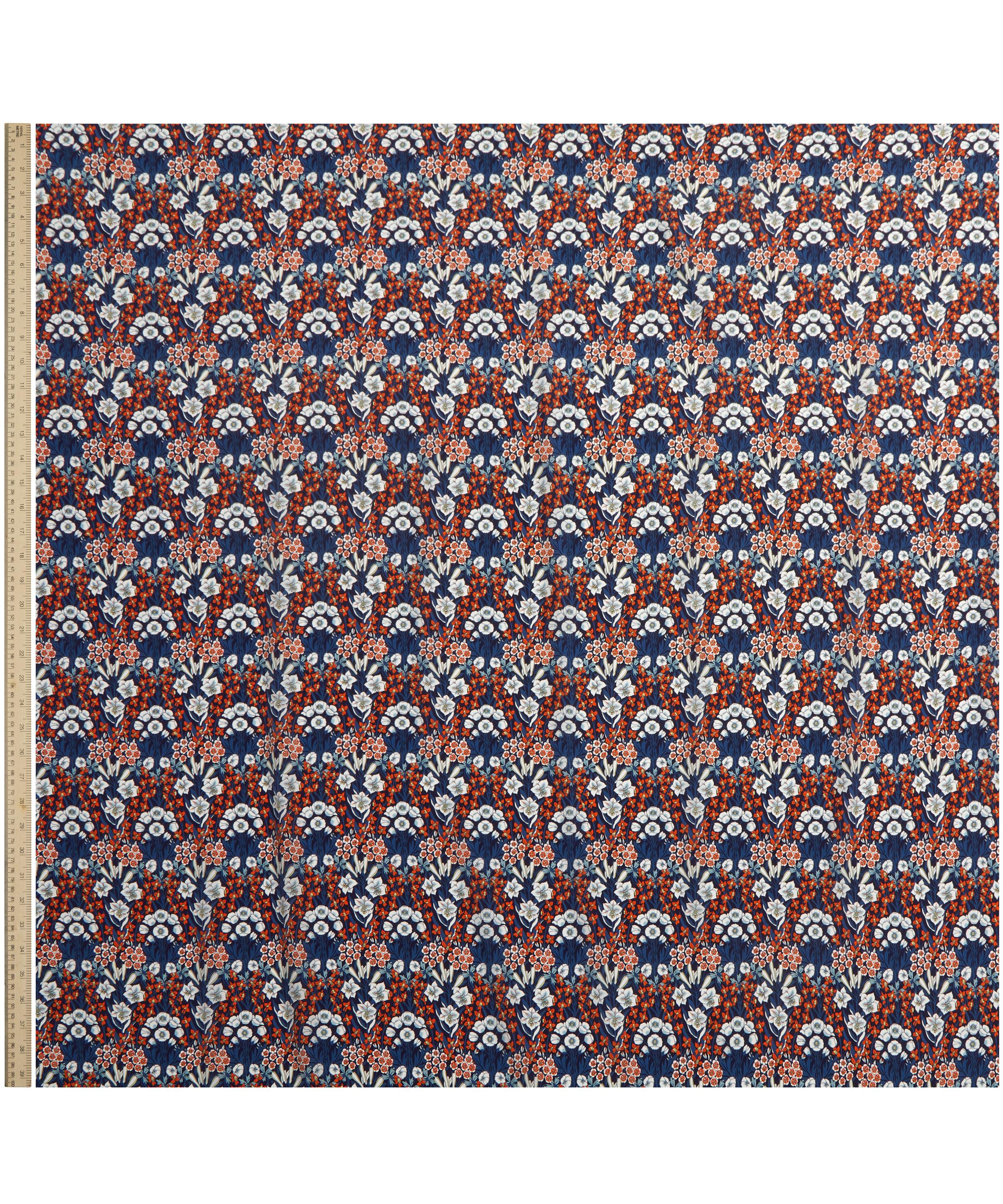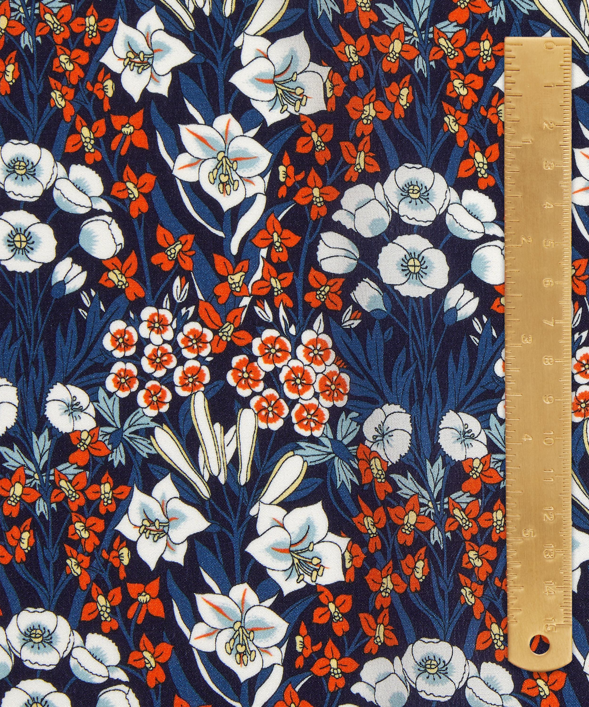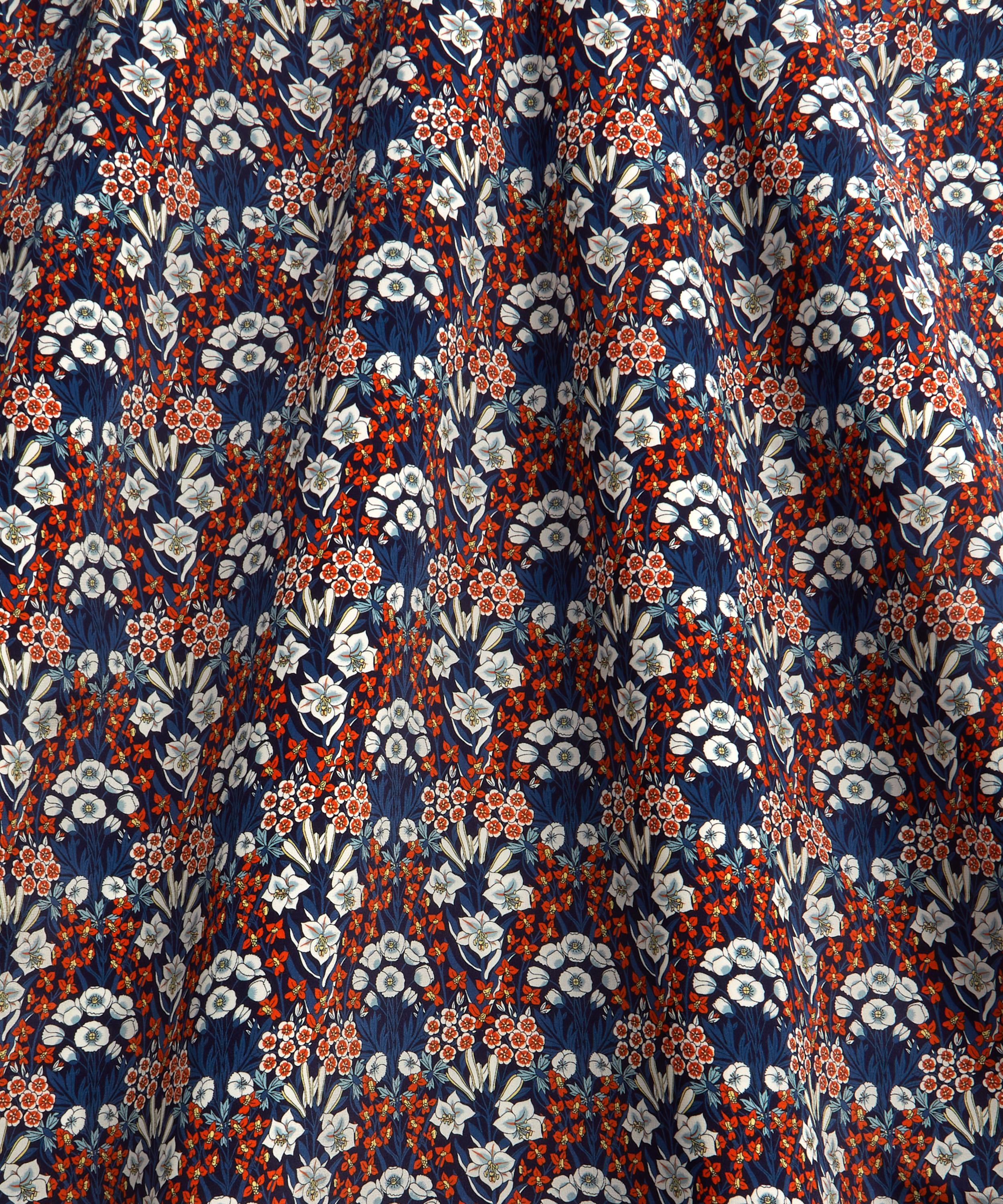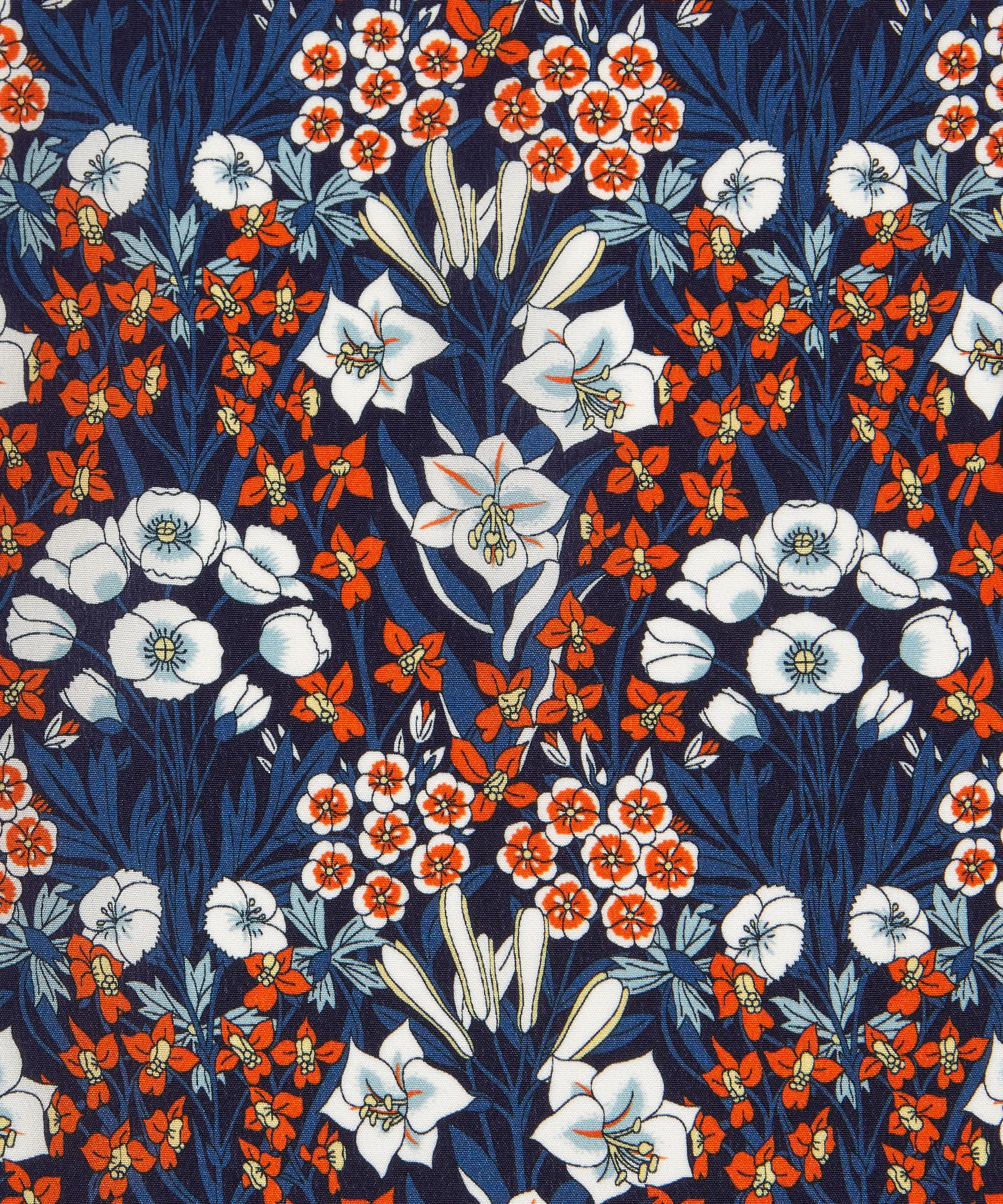 Mountain Primrose is a dense, highly stylised floral print inspired by an archival Liberty design. Drawn in an Art Nouveau style and rotary printed in seven colours, it has an ogee-shaped layout of lilies, anemones and dianthus.