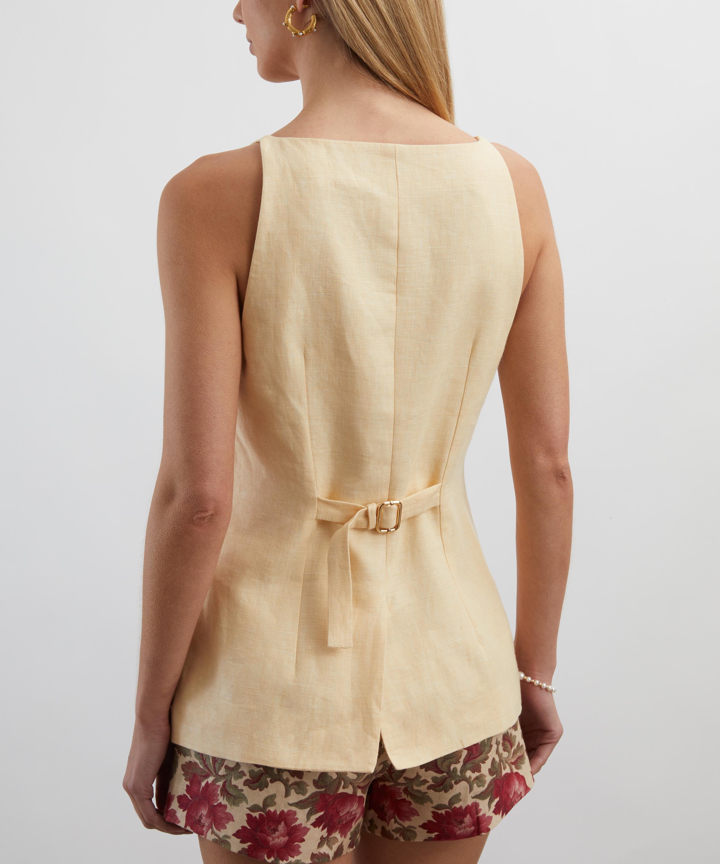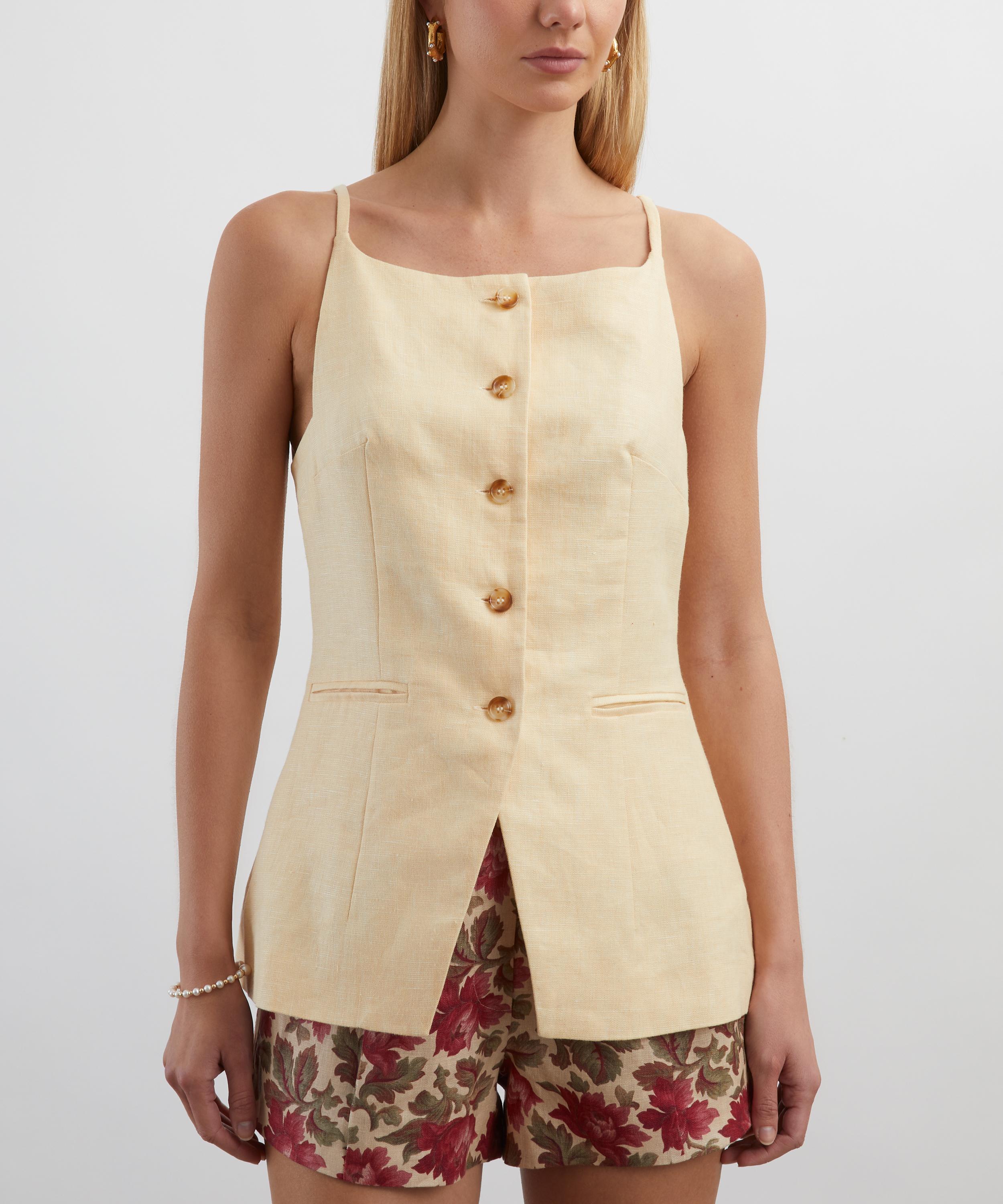 Tailored from exclusive handloom linen, the Nancy Gilet is cut for a close, flattering fit. It features a row of mottled buttons through the front and falls to a split hem, adding subtle ease of movement.