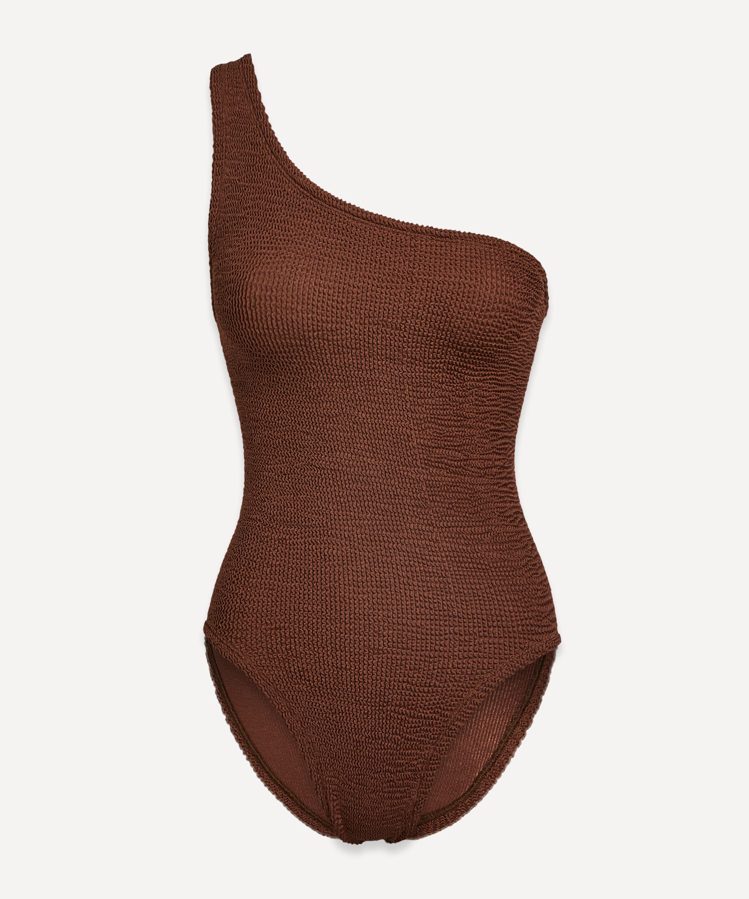 Minimal and effortlessly chic, Hunza G's Nancy swimsuit boasts a bold asymmetric silhouette - a polished and practical addition to your poolside edit.