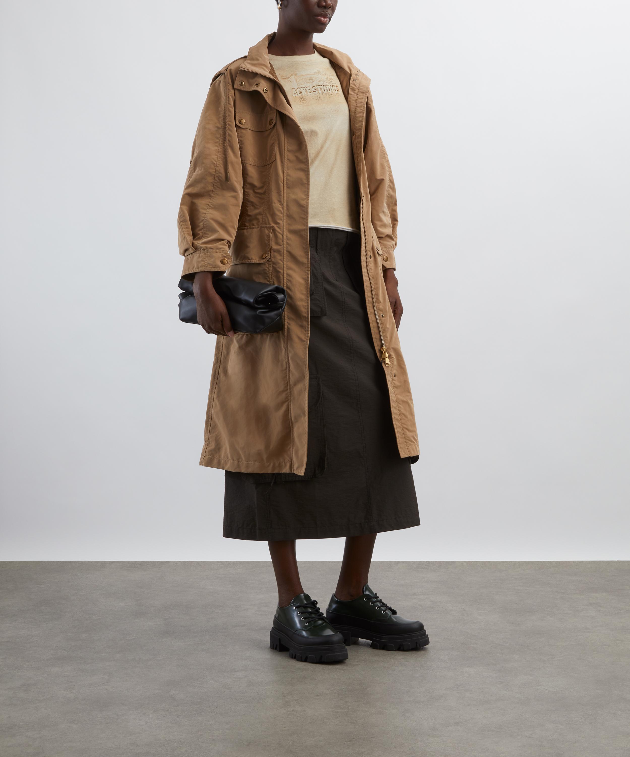 Designed for a transitional wardrobe, this long coat is crafted from a durable nylon blend with a nod to the utilitarian field jacket. Spacious patch pockets add functional detail, while a concealed pull-out hood and adjustable waistline provide extra warmth and protection against the elements.
