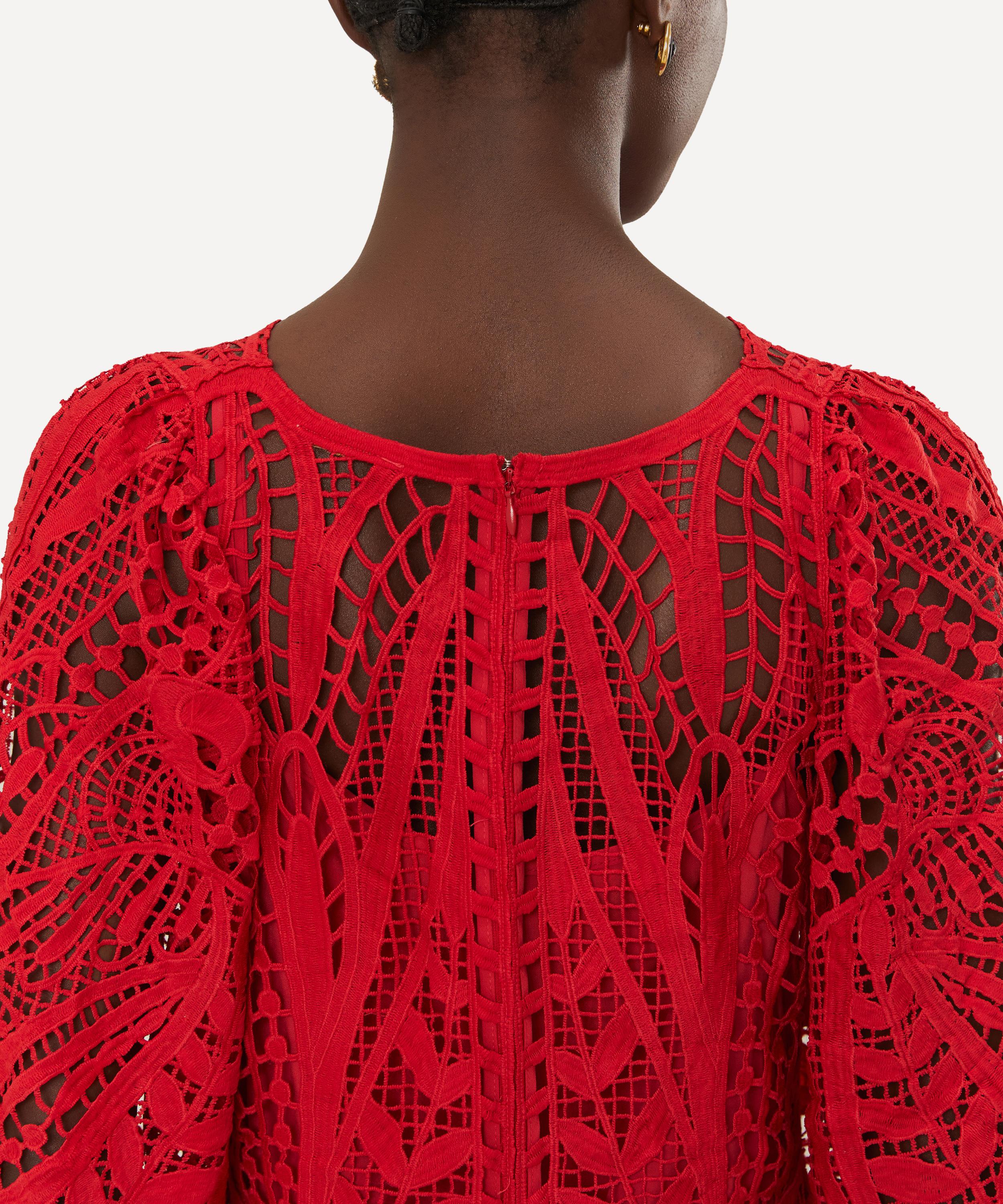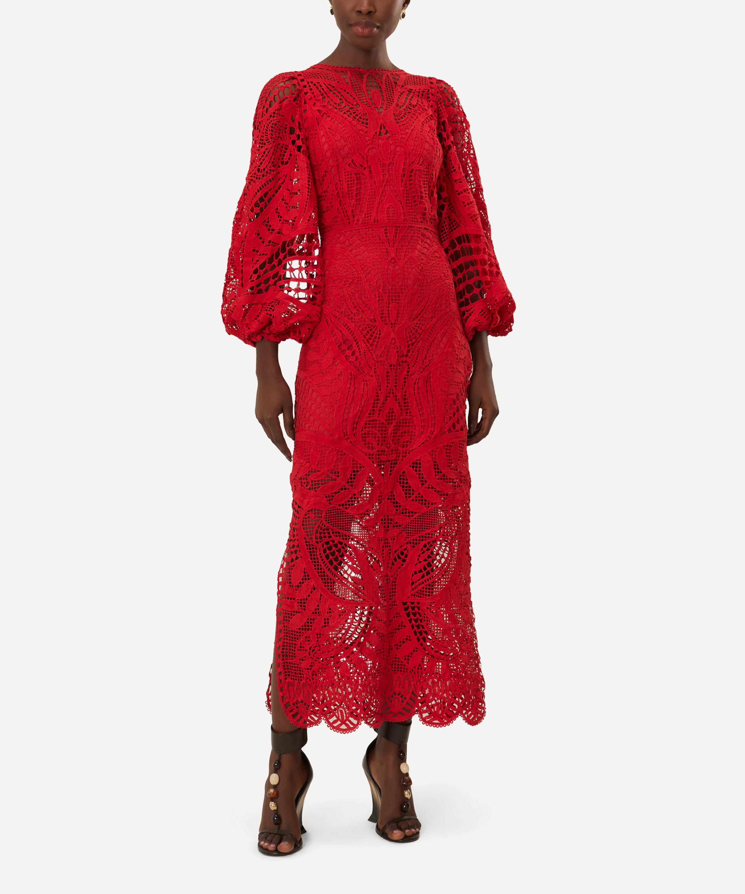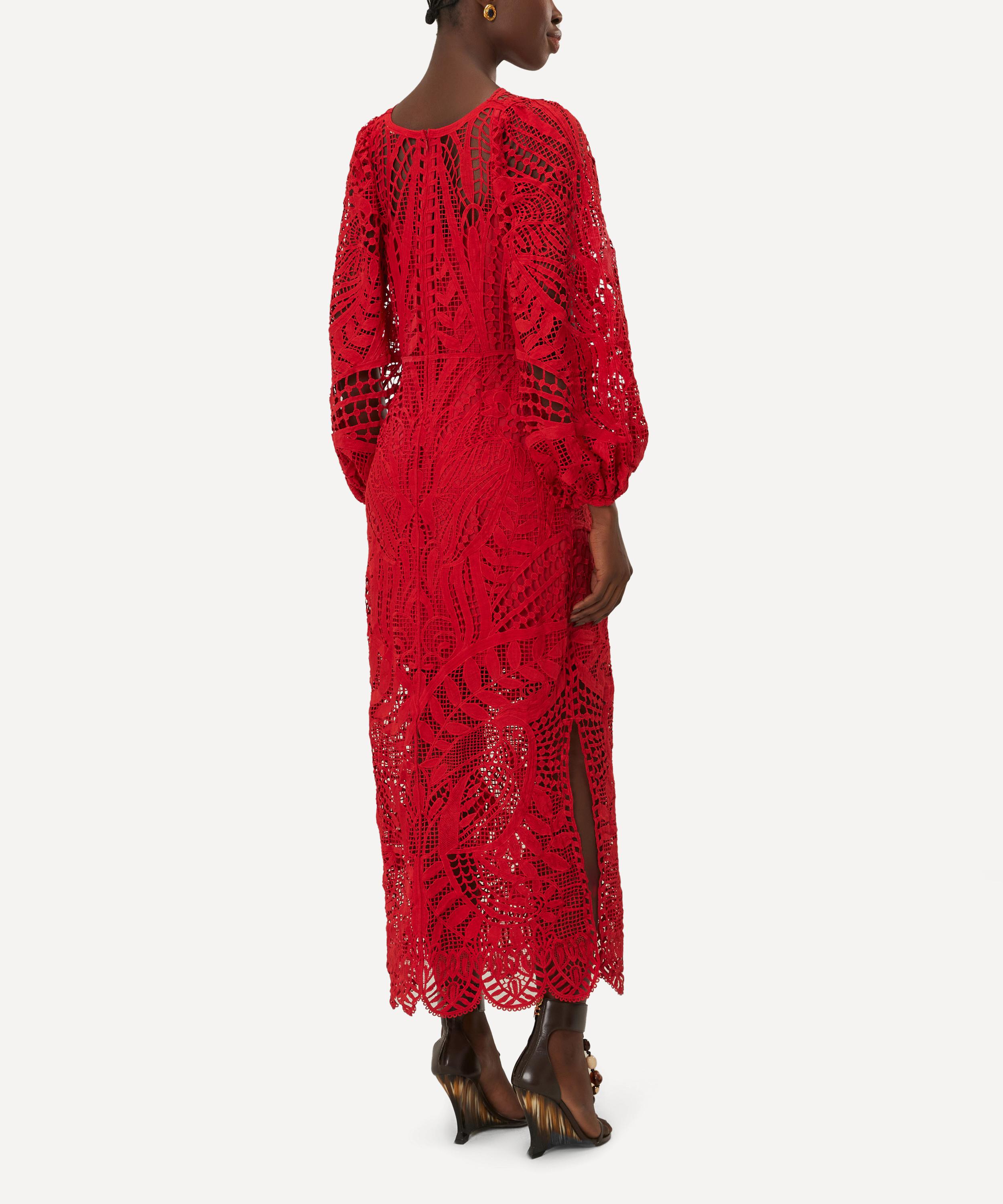 Effortlessly flattering, this captivating dress has been cut from intricate guipure lace in a bold red hue, adorned with an intricate pattern, and boasts a round neckline, softly puffer sleeves and a straight skirt, falling to a flattering midi-length hem. Perfect for sun-soaked days or tropical nights, this dress is a statement piece that evokes adventure and passion.