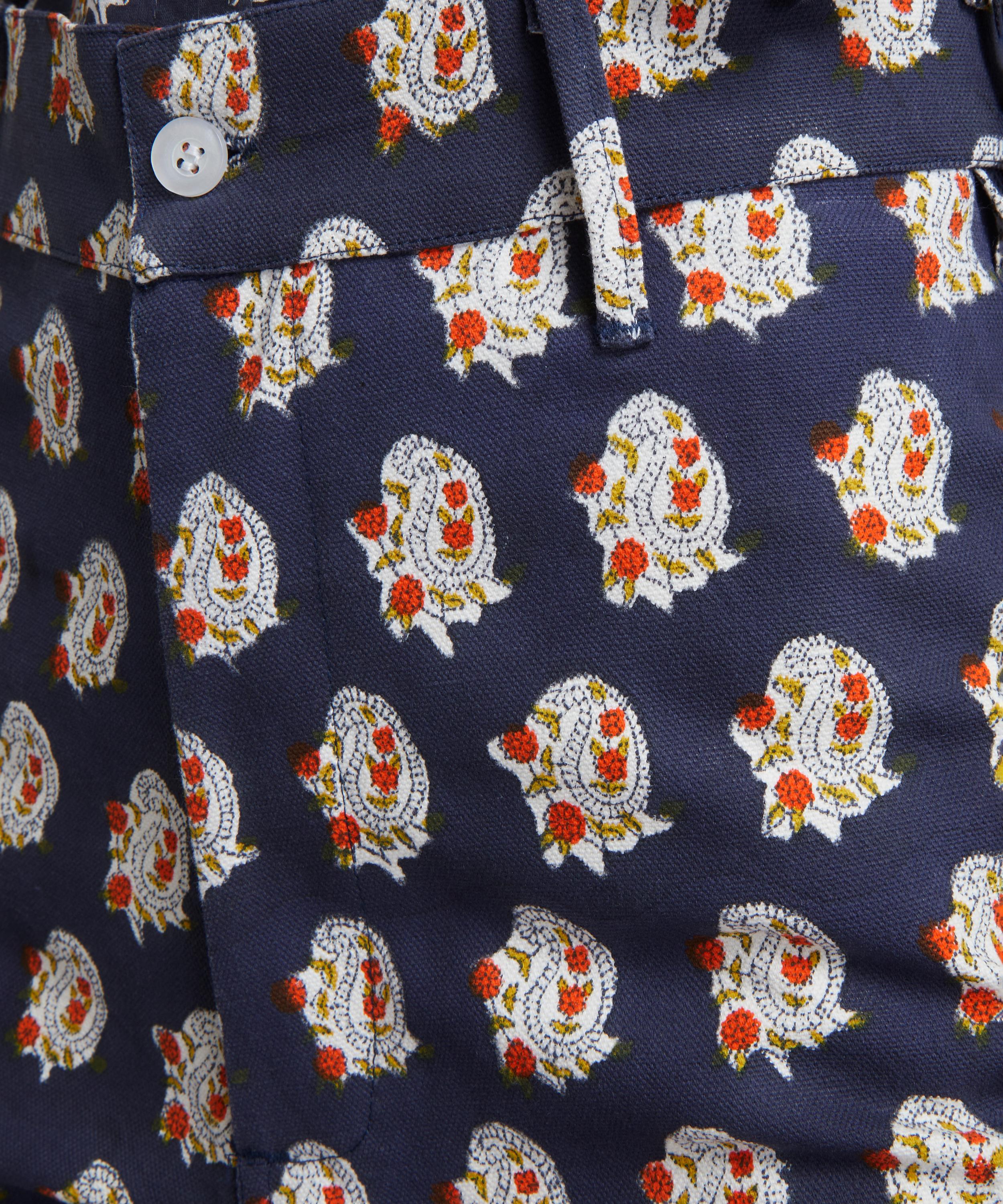 Straight from the block-printing studios of its native Jaipur, SZ Blockprints brings us their signature Disco Pant trousers in a navy and tangerine Small Paisley pattern for the new season.